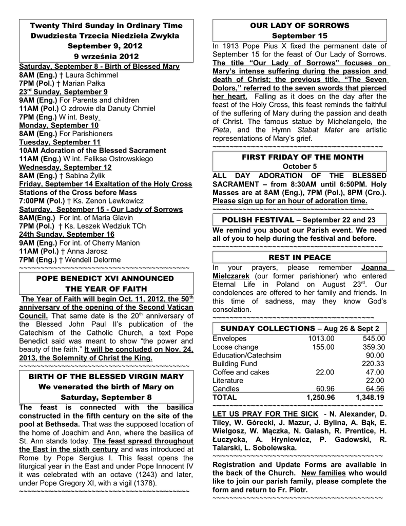 Twenty Third Sunday in Ordinary Time Dwudziesta Trzecia Niedziela Zwykła September 9, 2012 9 września 2012 Saturday, September 8 - Birth of Blessed Mary 8AM (Eng.) † Laura Schimmel 7PM (Pol.) † Marian Pałka 23rd Sunday, September 9 9AM (Eng.) For Parents and children 11AM (Pol.) O zdrowie dla Danuty Chmiel 7PM (Eng.) W int. Beaty Monday, September 10 8AM (Eng.) For Parishioners Tuesday, September 11 10AM Adoration of the Blessed Sacrament 11AM (Eng.) W int. Feliksa Ostrowskiego Wednesday, September 12 8AM (Eng.) † Sabina Żylik Friday, September 14 Exaltation of the Holy Cross Stations of the Cross before Mass 7:00PM (Pol.) † Ks. Zenon Lewkowicz Saturday, September 15 - Our Lady of Sorrows 8AM(Eng.) For int. of Maria Glavin 7PM (Pol.) † Ks. Leszek Wedziuk TCh 24th Sunday, September 16 9AM (Eng.) For int. of Cherry Manion 11AM (Pol.) † Anna Jarosz 7PM (Eng.) † Wendell Delorme ~~~~~~~~~~~~~~~~~~~~~~~~~~~~~~~~~~~~~~~~ POPE BENEDICT XVI ANNOUNCED THE YEAR OF FAITH The Year of Faith will begin Oct. 11, 2012, the 50 th anniversary of the opening of the Second Vatican Council. That same date is the 20th anniversary of the Blessed John Paul II’s publication of the Catechism of the Catholic Church, a text Pope Benedict said was meant to show “the power and beauty of the faith.” It will be concluded on Nov. 24, 2013, the Solemnity of Christ the King. ~~~~~~~~~~~~~~~~~~~~~~~~~~~~~~~~~~~~~~~~ BIRTH OF THE BLESSED VIRGIN MARY We venerated the birth of Mary on Saturday, September 8 The feast is connected with the basilica constructed in the fifth century on the site of the pool at Bethseda. That was the supposed location of the home of Joachim and Ann, where the basilica of St. Ann stands today. The feast spread throughout the East in the sixth century and was introduced at Rome by Pope Sergius I. This feast opens the liturgical year in the East and under Pope Innocent IV it was celebrated with an octave (1243) and later, under Pope Gregory XI, with a vigil (1378). ~~~~~~~~~~~~~~~~~~~~~~~~~~~~~~~~~~~~~~~~ OUR LADY OF SORROWS September 15 In 1913 Pope Pius X fixed the permanent date of September 15 for the feast of Our Lady of Sorrows. The title “Our Lady of Sorrows” focuses on Mary’s intense suffering during the passion and death of Christ; the previous title, “The Seven Dolors,” referred to the seven swords that pierced her heart. Falling as it does on the day after the feast of the Holy Cross, this feast reminds the faithful of the suffering of Mary during the passion and death of Christ. The famous statue by Michelangelo, the Pieta, and the Hymn Stabat Mater are artistic representations of Mary’s grief. ~~~~~~~~~~~~~~~~~~~~~~~~~~~~~~~~~~~~~~~~ FIRST FRIDAY OF THE MONTH October 5 ALL DAY ADORATION OF THE BLESSED SACRAMENT – from 8:30AM until 6:50PM. Holy Masses are at 8AM (Eng.), 7PM (Pol.), 8PM (Cro.). Please sign up for an hour of adoration time. ~~~~~~~~~~~~~~~~~~~~~~~~~~~~~~~~~~~~~~ POLISH FESTIVAL – September 22 and 23 We remind you about our Parish event. We need all of you to help during the festival and before. ~~~~~~~~~~~~~~~~~~~~~~~~~~~~~~~~~~~~~~~~ REST IN PEACE In your prayers, please remember Joanna Mielczarek (our former parishioner) who entered Eternal Life in Poland on August 23rd. Our condolences are offered to her family and friends. In this time of sadness, may they know God’s consolation. ~~~~~~~~~~~~~~~~~~~~~~~~~~~~~~~~~~~~~~ SUNDAY COLLECTIONS – Aug 26 & Sept 2 Envelopes 1013.00 545.00 Loose change 155.00 359.30 Education/Catechsim 90.00 Building Fund 220.33 Coffee and cakes 22.00 47.00 Literature 22.00 Candles 60.96 64.56 TOTAL 1,250.96 1,348.19 ~~~~~~~~~~~~~~~~~~~~~~~~~~~~~~~~~~~~~~~~ LET US PRAY FOR THE SICK - N. Alexander, D. Tiley, W. Górecki, J. Mazur, J. Bylina, A. Bąk, E. Wielgosz, W. Mączka, N. Galash, R. Prentice, H. Łuczycka, A. Hryniewicz, P. Gadowski, R. Talarski, L. Sobolewska. ~~~~~~~~~~~~~~~~~~~~~~~~~~~~~~~~~~~~~~~~ Registration and Update Forms are available in the back of the Church. New families who would like to join our parish family, please complete the form and return to Fr. Piotr. ~~~~~~~~~~~~~~~~~~~~~~~~~~~~~~~~~~~~~~~~ ROK WIARY Ojciec Święty ogłosił Rok Wiary listem apostolskim Porta fidei z 11 października 2011 r. Celem zwrócenia uwagi Kościoła na spotkanie z Chrystusem i na piękno wiary w Niego. Rok ten, trwający od 11 października b.r., aż do uroczystości Chrystusa Króla Wszechświata 24 listopada 2013 r., ma się przyczyniać do nawrócenia i do odkrycia na nowo wiary. Rozpocznie się (11 listopada) w rocznicę dwóch ważnych wydarzeń, które naznaczyły oblicze Kościoła naszych czasów: w 50-lecie otwarcia przez bł. Jana XXIII obrad Soboru Watykańskiego II i 20-lecie promulgowania przez bł. Jana Pawła II Katechizmu Kościoła Katolickiego. Benedykt XVI od początku swego pontyfikatu zabiega zdecydowanie o właściwe rozumienie Soboru. Rok Wiary będzie okazją do szerzenia znajomości zarówno Soboru, jak i Katechizmu. ~~~~~~~~~~~~~~~~~~~~~~~~~~~~~~~~~~~~~~~~ WIZYTA PAPIEŻA W LIBANIE Papież odwiedzi Liban w dniach 14-16 września z okazji – jak wyjaśniano wcześniej w Watykanie – podpisania i publikacji adhortacji apostolskiej, będącej podsumowaniem synodu biskupów z Bliskiego Wschodu. W trakcie wizyty Benedykt XVI odwiedzi Bejrut, gdzie w ostatnim dniu pobytu odprawi uroczystą mszę. Spotka się także z najwyższymi władzami libańskimi, wspólnotą muzułmańską i przedstawicielami tamtejszych Kościołów chrześcijańskich. ~~~~~~~~~~~~~~~~~~~~~~~~~~~~~~~~~~~~~~~~ KATECHEZA DLA DZIECI I MŁODZIEŻY Dzisiaj, w niedzielę 9 września rozpoczyna się nauka religii w naszej parafii. Zapisy dzieci są przyjmowane przez Elżbietę Szewczyk. Przyjmujemy dzieci czteroletnie i starsze do klasy przedszkolnej. ~~~~~~~~~~~~~~~~~~~~~~~~~~~~~~~~~~~~~~~~ POLSKI FESTIWAL – 22 i 23 września Zapraszamy parafian do czynnego udziału w festiwalu i w przygotowaniach do niego. ~~