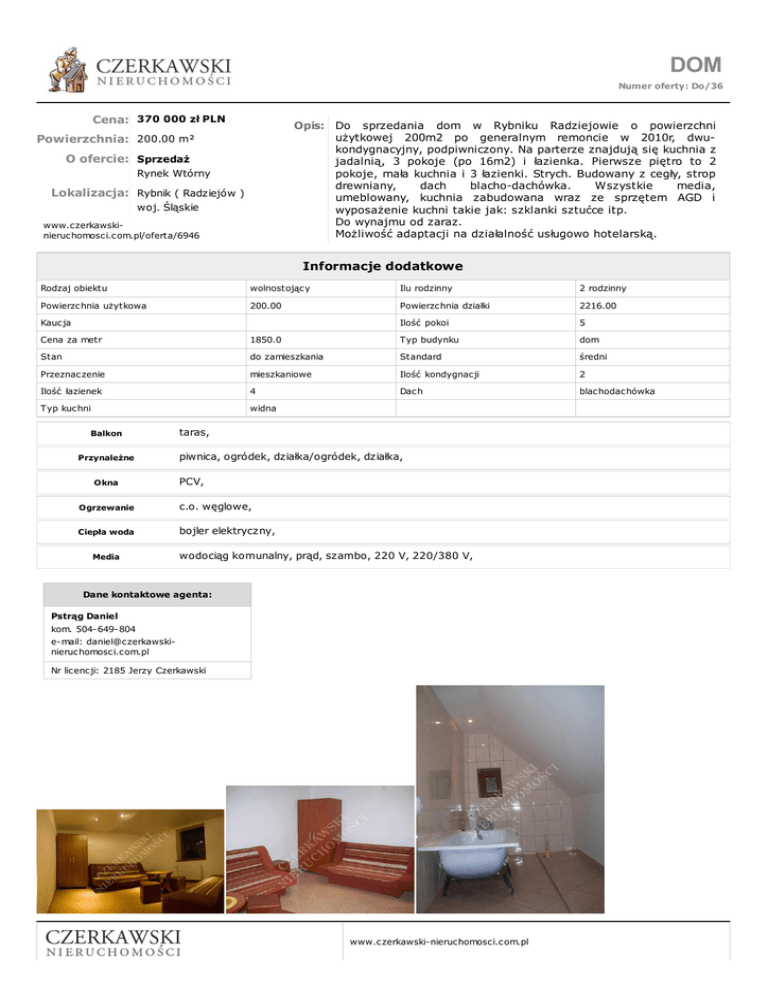 DOM Numer oferty: Do/36 Cena: 370 000 zł PLN Opis: Do sprzedania dom w Rybniku Radziejowie o powierzchni użytkowej 200m2 po generalnym remoncie w 2010r, dwukondygnacyjny, podpiwniczony. Na parterze znajdują się kuchnia z jadalnią, 3 pokoje (po 16m2) i łazienka. Pierwsze piętro to 2 pokoje, mała kuchnia i 3 łazienki. Strych. Budowany z cegły, strop drewniany, dach blacho-dachówka. Wszystkie media, umeblowany, kuchnia zabudowana wraz ze sprzętem AGD i wyposażenie kuchni takie jak: szklanki sztućce itp. Do wynajmu od zaraz. Możliwość adaptacji na działalność usługowo hotelarską. Powierzchnia: 200.00 m² O ofercie: Sprzedaż Rynek Wtórny Lokalizacja: Rybnik ( Radziejów ) woj. Śląskie www.czerkawskinieruchomosci.com.pl/oferta/6946 Informacje dodatkowe Rodzaj obiektu wolnostojący Ilu rodzinny 2 rodzinny Powierzchnia użytkowa 200.00 Powierzchnia działki 2216.00 Kaucja Ilość pokoi 5 Cena za metr 1850.0 Typ budynku dom Stan do zamieszkania Standard średni Przeznaczenie mieszkaniowe Ilość kondygnacji 2 Ilość łazienek 4 Dach blachodachówka Typ kuchni widna Balkon Przynależne Okna taras, piwnica, ogródek, działka/ogródek, działka, PCV, Ogrzewanie c.o. węglowe, Ciepła woda bojler elektryczny, Media wodociąg komunalny, prąd, szambo, 220 V, 220/380 V, Dane kontaktowe agenta: Pstrąg Daniel kom. 504-649-804 e-mail: [email protected] Nr licencji: 2185 Jerzy Czerkawski www.czerkawski-nieruchomosci.com.pl