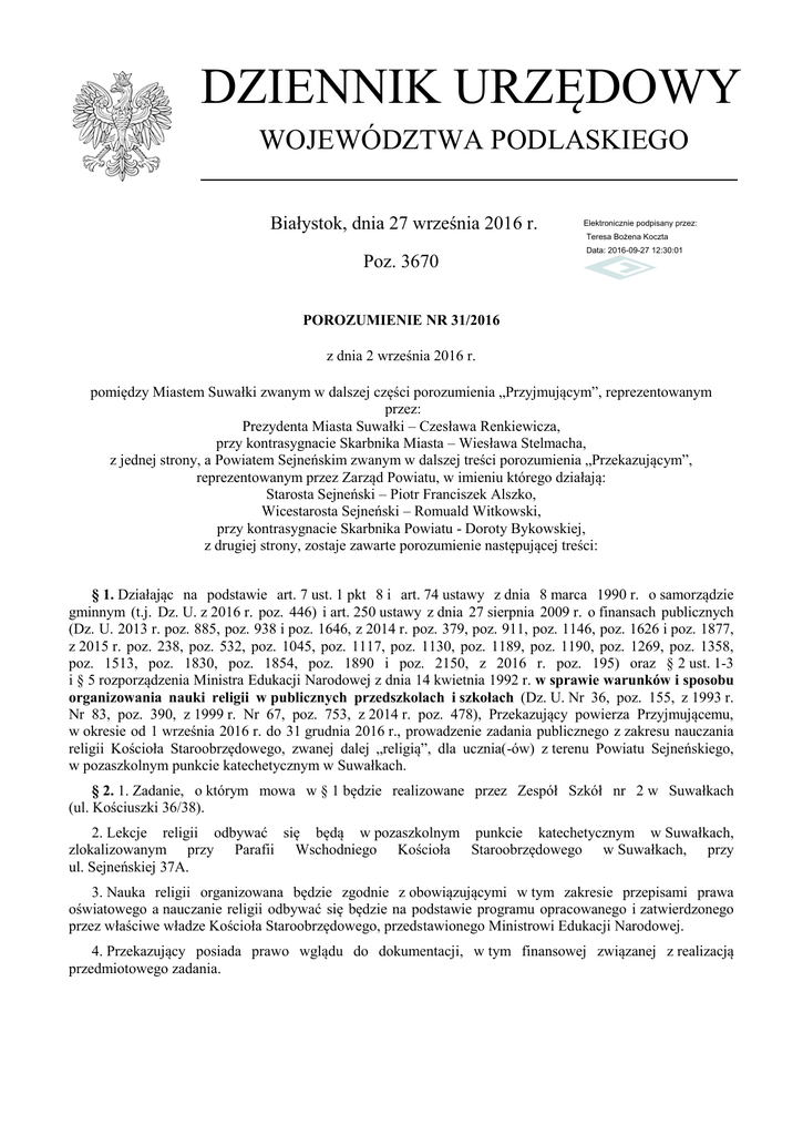 DZIENNIK URZĘDOWY WOJEWÓDZTWA PODLASKIEGO Białystok, dnia 27 września 2016 r. Elektronicznie podpisany przez: Teresa Bożena Koczta Poz. 3670 Data: 2016-09-27 12:30:01 POROZUMIENIE NR 31/2016 z dnia 2 września 2016 r. pomiędzy Miastem Suwałki zwanym w dalszej części porozumienia „Przyjmującym”, reprezentowanym przez: Prezydenta Miasta Suwałki – Czesława Renkiewicza, przy kontrasygnacie Skarbnika Miasta – Wiesława Stelmacha, z jednej strony, a Powiatem Sejneńskim zwanym w dalszej treści porozumienia „Przekazującym”, reprezentowanym przez Zarząd Powiatu, w imieniu którego działają: Starosta Sejneński – Piotr Franciszek Alszko, Wicestarosta Sejneński – Romuald Witkowski, przy kontrasygnacie Skarbnika Powiatu - Doroty Bykowskiej, z drugiej strony, zostaje zawarte porozumienie następującej treści: § 1. Działając na podstawie art. 7 ust. 1 pkt 8 i art. 74 ustawy z dnia 8 marca 1990 r. o samorządzie gminnym (t.j. Dz. U. z 2016 r. poz. 446) i art. 250 ustawy z dnia 27 sierpnia 2009 r. o finansach publicznych (Dz. U. 2013 r. poz. 885, poz. 938 i poz. 1646, z 2014 r. poz. 379, poz. 911, poz. 1146, poz. 1626 i poz. 1877, z 2015 r. poz. 238, poz. 532, poz. 1045, poz. 1117, poz. 1130, poz. 1189, poz. 1190, poz. 1269, poz. 1358, poz. 1513, poz. 1830, poz. 1854, poz. 1890 i poz. 2150, z 2016 r. poz. 195) oraz § 2 ust. 1-3 i § 5 rozporządzenia Ministra Edukacji Narodowej z dnia 14 kwietnia 1992 r. w sprawie warunków i sposobu organizowania nauki religii w publicznych przedszkolach i szkołach (Dz. U. Nr 36, poz. 155, z 1993 r. Nr 83, poz. 390, z 1999 r. Nr 67, poz. 753, z 2014 r. poz. 478), Przekazujący powierza Przyjmującemu, w okresie od 1 września 2016 r. do 31 grudnia 2016 r., prowadzenie zadania publicznego z zakresu nauczania religii Kościoła Staroobrzędowego, zwanej dalej „religią”, dla ucznia(-ów) z terenu Powiatu Sejneńskiego, w pozaszkolnym punkcie katechetycznym w Suwałkach. § 2. 1. Zadanie, o którym mowa w § 1 będzie realizowane przez Zespół Szkół nr 2 w Suwałkach (ul. Kościuszki 36/38). 2. Lekcje religii odbywać się będą w pozaszkolnym punkcie katechetycznym w Suwałkach, zlokalizowanym przy Parafii Wschodniego Kościoła Staroobrzędowego w Suwałkach, przy ul. Sejneńskiej 37A. 3. Nauka religii organizowana będzie zgodnie z obowiązującymi w tym zakresie przepisami prawa oświatowego a nauczanie religii odbywać się będzie na podstawie programu opracowanego i zatwierdzonego przez właściwe władze Kościoła Staroobrzędowego, przedstawionego Ministrowi Edukacji Narodowej. 4. Przekazujący posiada prawo wglądu do dokumentacji, w tym finansowej związanej z realizacją przedmiotowego zadania. Dziennik Urzędowy Województwa Podlaskiego –2– Poz. 3670 § 3. 1. Na realizację powierzonego zadania określonego w § 1, Przekazujący zobowiązuje się przekazywać na konto Przyjmującego – nr konta w Banku Pekao S.A. Oddział w Suwałkach nr 98124052111111000049223129 środki finansowe, zwane dalej „dotacją”, w wysokości proporcjonalnej do liczby uczniów z terenu Przekazującego uczęszczających na przedmiotowe zajęcia religii, naliczane za okres wskazany w § 1, w sposób następujący: 1) dotacja za okres czterech miesięcy, tj. za wrzesień, październik, listopad i grudzień 2016 r., w wysokości 66,56 zł (słownie: sześćdziesiąt sześć złotych 56/100) miesięcznie na jednego ucznia, czyli dotacja na jednego ucznia w ww. okresie zamknie się kwotą ogółem w wysokości 266,24 zł (słownie: dwieście sześćdziesiąt sześć złotych 24/100); 2) dotacja zostanie przekazana Przyjmującemu przez Przekazującego w nieprzekraczalnym terminie do dnia 4 listopada 2016 r. 2. Kalkulację całkowitych kosztów związanych z realizacją przedmiotowego zadania stanowi załącznik do niniejszego Porozumienia. 3. Strony zgodnie postanawiają, że wykorzystanie dotacji nastąpi w nieprzekraczalnym terminie do dnia 31 grudnia 2016 r. 4. Rozliczenie dotacji pomiędzy stronami porozumienia za 2016 r., przy jednoczesnym uwzględnieniu liczby uczniów faktycznie uczęszczających na zajęcia religii, o których mowa w § 2 ust. 2 w poszczególnych miesiącach okresu rozliczeniowego oraz rzeczywistych kosztów kształcenia jednego ucznia w wyżej wskazanym punkcie katechetycznym, nastąpi w nieprzekraczalnym terminie do dnia 20 stycznia 2017 r., z zastrzeżeniem, o którym mowa w ust. 5. 5. W rozumieniu niniejszego porozumienia, uczniem faktycznie uczęszczającym na zajęcia religii w danym miesiącu, jest uczeń, który uczęszczał na te zajęcia co najmniej jeden raz w danym miesiącu kalendarzowym. 6. Niewykorzystana część dotacji podlega zwrotowi w terminie do dnia 31 stycznia 2017 r. na rachunek bankowy Starostwa Powiatowego w Sejnach: Bank Spółdzielczy w Sejnach, nr konta: 94 93540007 0000 0000 1759 0001. 7. Za opóźnienie w przekazywaniu/zwrocie dotacji naliczane będą odsetki w wysokości określonej jak dla zaległości podatkowych, przy czym za zachowanie terminu zapłaty, strony porozumienia przyjmują datę uznania konta Przyjmującego/Przekazującego. § 4. Porozumienie zostaje zawarte na czas oznaczony, o którym mowa § 1. § 5. Spory mogące wyniknąć ze stosunku objętego porozumieniem rozstrzygane będą w drodze negocjacji stron, a przy braku porozumienia przez właściwy miejscowo i rzeczowo sąd. § 6. Zmiany porozumienia wymagają formy pisemnej pod rygorem nieważności. § 7. W sprawach nieuregulowanych niniejszym porozumieniem mają zastosowanie przepisy ustawy Kodeks Cywilny i ustawy z dnia 7 sierpnia 2009 r. o finansach publicznych. § 8. Niniejsze porozumienie podlega publikacji w Dzienniku Urzędowym Województwa Podlaskiego. § 9. Porozumienie sporządzono w trzech jednobrzmiących egzemplarzach: dwa dla Przyjmującego i jeden dla Przekazującego. Kopia niniejszego porozumienia, potwierdzona za zgodność z oryginałem przez Przyjmującego, zostanie przesłana do wiado