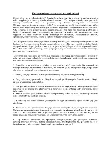 Kształtowanie poczucia własnej wartości u dzieci Często słyszymy o ,,obrazie siebie”. Specjaliści mówią nam, że problemy z zachowaniami u dzieci wypływają z braku poczucia własnej wartości. Cóż takiego zawdzięczamy poczuciu własnej wartości? Skąd to poczucie się bierze, szczególnie u dzieci? Mówiąc prostym językiem ,,obraz siebie” to wewnętrzne myśli i przeświadczenia, które mówią nam, że jesteśmy wartościowymi osobami, że jesteśmy kompetentni i można nas lubić. Gdy jesteśmy o tym przeświadczeni oczekujemy, że inni będą nas podobnie postrzegali i lubili. A ponieważ mamy przekonanie, że jesteśmy wartościowymi, kompetentnymi oraz dającymi się lubić osobami, mamy tendencje do otwartości, przyjacielskich postaw, optymizmu, pomysłowości, dbania o siebie i podejmowania ryzyka. Jeśli twojemu dziecku brakuje poczucia własnej wartości, jeśli czuje się niekompetentne, nie lubiane czy bezwartościowe, będzie oczekiwało, że wszystkie jego wysiłki zawiodą. Będzie się spodziewało, że przyjaciele odrzucą je, a życie będzie jednym wielkim niepowodzeniem. Oto kilka rodzicielskich reakcji, które przyczynią się do zbudowania u dziecka zdrowego, pozytywnego obrazu siebie. 1. Stwarzaj dziecku okazje do rozwijania poczucia kompetencji i pewności siebie. Inwestuj w zabawki, które będą pobudzały dziecko do twórczych zachowań i mistrzowskiego panowania nad sobą oraz swoim otoczeniem. 2. Pozwól dziecku wybierać dziedziny, w których chce mieć osiągnięcia. Nie narzucaj mu własnych ambicji, które miałeś w młodości, nie zmuszaj go do zdobywania tego, czego tobie nie udało się osiągnąć w sporcie, nauce czy sztuce. 3. Słuchaj swojego dziecka. W ten sposób dowie się, że jest interesująca osobą. 4. Pytaj dziecko o jego zdanie w różnych sytuacjach problemowych. Pomoże mu to odkryć, że jego uwagi mogą być głębokie. 5. Jeśli powiesz dziecku o swoich wątpliwościach co do jego planów (bez wyśmiewania się) nauczysz je, że można być elastycznym i ponownie ocenić sytuację gdy otrzymamy nowe informacje. 6. Traktuj dziecko jako indywidualność. Nie porównuj dzieci ze sobą. Podkreślaj unikalne silne i słabe strony każdego dziecka. 7. Rozmawiaj na temat dziecka (szczególnie o jego problemach) tylko wtedy gdy jest nieobecne. 8. Zastanów się nad przezwiskami twojego dziecka, szczególnie tymi, których sam używasz. Nazywanie go poniżającymi imionami czy pozornie niewinnymi określeniami, jak np. ,,ty żółwiu”, może sugerować mu, że posiada pewne niechciane cechy. Często zwracaj się do niego używając pozytywnych imion, np. ,,mój mały mistrzu” czy ,,mała damo”. 9. Gdy dziecko zachowuje się uprzejmie, nieegoistycznie, jest porządne, pomocne, zdyscyplinowane, twórcze, dobrze skoordynowane, przedsiębiorcze itp., powiedz mu to!!! Dziecko nauczy się, że w tych dziedzinach może odnieść sukces!!! 10. Zwracaj uwagę i nagradzaj postępy dziecka, nieważne jak są małe. Nauczy je to optymizmu. Zachowania odwrotne niszczą oczywiście obraz siebie dziecka. Uleganie skłonności do krytycyzmu i potępiania jest najskuteczniejszym sposobem zniszczenia wszelkiego poczucia wartości u dziecka. Dlatego: 1. Unikaj potępiającego krytycyzmu i wyśmiewania. Dziecko wyciąga z nich wniosek, że jest w nim jakiś zasadniczy błąd. 2. Nie podejmuj stale decyzji za swoje dziecko. Jeśli będziesz to robił, dojdzie do wniosku, że jego własne sądy są nic nie warte. 3. Unikaj wytykania wielu błędów i niedoskonałości dziecka. Spowoduje to, że utraci ono poczucie własnej kompetencji, przestanie lubić siebie. Na podstawie powyższego materiału zastanów się, co twoje dziecko myśli o sobie? To wewnętrzne przekonanie jest bardzo ważne. Tylko ty możesz dać mu cudowny dar prawdziwego poczucia własnej wartości. Literatura: P. Lewis: Jak nauczyć dziecko sztuki życia?, Wydawnictwo ,,Rodzinny Krąg”, Warszawa 1985