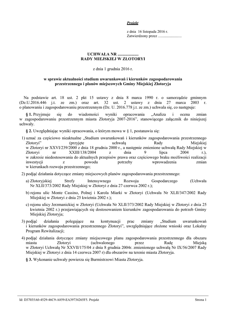 Projekt z dnia 16 listopada 2016 r. Zatwierdzony przez ......................... UCHWAŁA NR .................... RADY MIEJSKIEJ W ZŁOTORYI z dnia 1 grudnia 2016 r. w sprawie aktualności studium uwarunkowań i kierunków zagospodarowania przestrzennego i planów miejscowych Gminy Miejskiej Złotoryja Na podstawie art. 18 ust. 2 pkt 15 ustawy z dnia 8 marca 1990 r. o samorządzie gminnym (Dz.U.2016.446 j.t. ze zm.) oraz art. 32 ust. 2 ustawy z dnia 27 marca 2003 r. o planowaniu i zagospodarowaniu przestrzennym (Dz. U. 2016.778 j.t. ze zm.) uchwala się, co następuje: § 1. Przyjmuje się do wiadomości wyniki opracowania „Analiza i ocena zmian w zagospodarowaniu przestrzennym miasta Złotoryja 2007-2016”, stanowiącego załącznik do niniejszej uchwały. § 2. Uwzględniając wyniki opracowania, o którym mowa w § 1, postanawia się: 1) uznać za częściowo nieaktualne „Studium uwarunkowań i kierunków zagospodarowania przestrzennego Złotoryi” (przyjęte uchwałą Rady Miejskiej w Złotoryi nr XXVI/239/2000 z dnia 18 grudnia 2000 r., a następnie zmienione uchwałą Rady Miejskiej w Złotoryi nr XXIII/138/2004 z dnia 9 lipca 2004 r.), w zakresie niedostosowania do aktualnych przepisów prawa oraz częściowego braku możliwości realizacji inwestycji z powodu potrzeby wprowadzenia zmian w kierunkach rozwoju przestrzennego; 2) podjąć działania dotyczące zmiany miejscowych planów zagospodarowania przestrzennego: a) Złotoryjskiej Strefy Intensywnego Rozwoju Gospodarczego Nr XLII/373/2002 Rady Miejskiej w Złotoryi z dnia 27 czerwca 2002 r.); (Uchwała b) rejonu ulic Monte Cassino, Polnej i Karola Miarki w Złotoryi (Uchwała Nr XLII/347/2002 Rady Miejskiej w Złotoryi z dnia 25 kwietnia 2002 r.); c) rejonu ulicy Jerzmanickiej w Złotoryi (Uchwała Nr XLII/373/2002 Rady Miejskiej w Złotoryi z dnia 25 kwietnia 2002 r.) przejawiających się dostosowaniem kierunków zagospodarowania do potrzeb Gminy Miejskiej Złotoryja; 3) podjąć działania polegające na kontynuacji prac zmiany „Studium uwarunkowań i kierunków zagospodarowania przestrzennego Złotoryi”, uwzględniające złożone wnioski oraz Lokalny Program Rewitalizacji; 4) podjąć działania dotyczące zmiany miejscowego planu zagospodarowania przestrzennego dla obszaru miasta Złotoryi (uchwalonego przez Radę Miejską w Złotoryi Uchwałą Nr XXVII/175/04 z dnia 8 grudnia 2004r. zmienionego uchwałą Nr IX/56/2007 Rady Miejskiej w Złotoryi z dnia 14 czerwca 2007 r) dla obszarów na terenie miasta Złotoryja. § 3. Wykonanie uchwały powierza się Burmistrzowi Miasta Złotoryja. Id: D37035A0-4529-46C9-A859-EA39734265F5. Projekt Strona 1 § 4. Uchwała wchodzi w życie z dniem podjęcia. Przewodnicząca Rady Miejskiej Ewa Miara Id: D37035A0-4529-46C9-A859-EA39734265F5. Projekt Strona 2