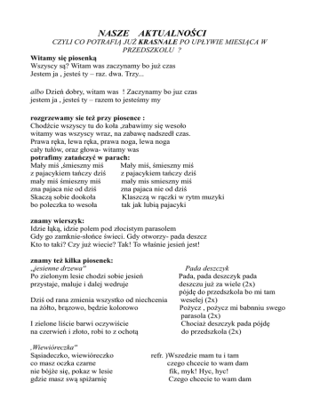 NASZE AKTUALNOŚCI CZYLI CO POTRAFIĄ JUŻ KRASNALE PO UPŁYWIE MIESIĄCA W PRZEDSZKOLU ? Witamy się piosenką Wszyscy są? Witam was zaczynamy bo już czas Jestem ja , jesteś ty – raz. dwa. Trzy... albo Dzień dobry, witam was ! Zaczynamy bo juz czas jestem ja , jesteś ty – razem to jesteśmy my rozgrzewamy sie też przy piosence : Chodźcie wszyscy tu do koła ,zabawimy się wesoło witamy was wszyscy wraz, na zabawę nadszedł czas. Prawa ręka, lewa ręka, prawa noga, lewa noga cały tułów, oraz głowa- witamy was potrafimy zatańczyć w parach: Mały miś ,śmieszny miś Mały miś, śmieszny miś z pajacykiem tańczy dziś z pajacykiem tańczy dziś mały miś śmieszny miś mały mis smieszny miś zna pajaca nie od dziś zna pajaca nie od dziś Skaczą sobie dookoła Klaszczą w rączki w rytm muzyki bo poleczka to wesoła tak jak lubią pajacyki znamy wierszyk: Idzie łąką, idzie polem pod złocistym parasolem Gdy go zamknie-słońce świeci. Gdy otworzy- pada deszcz Kto to taki? Czy już wiecie? Tak! To właśnie jesień jest! znamy też kilka piosenek: ,,jesienne drzewa'' Po zielonym lesie chodzi sobie jesień przystaje, maluje i dalej wedruje Dziś od rana zmienia wszystko od niechcenia na żółto, brązowo, będzie kolorowo I zielone liście barwi oczywiście na czerwień i złoto, robi to z ochotą ,Wiewióreczka'' Sąsiadeczko, wiewióreczko co masz oczka czarne nie bójże się, pokaz w lesie gdzie masz swą spiżarnię Pada deszczyk Pada, pada deszczyk pada deszczu już za wiele (2x) pójdę do przedszkola bo mi tam weselej (2x) Pożycz , pożycz mi babnniu swego parasola (2x) Chociaż deszczyk pada pójdę do przedszkola (2x) refr. )Wszedzie mam tu i tam czego chcecie to wam dam fik, myk! Hyc, hyc! Czego chcecie to wam dam Sąsiadeczko, wiewióreczko co masz rude łapki jeśli łaska, sypnij z góry orzeszków do czapki refr)Dałabym nawet sześć Lecz co w zimie będę jeść? Fik, myk! Hyc hyc! był orzeszek, nie ma nic! Sąsiadeczko, wiewióreczko co masz rudy pyszczek tu na ziemię rzuć uprzejmie kilka ładnych szyszek refr)Szyszki masz tu i tam wejdź na sosnę,urwij sam Fik, myk! Hyc, hyc! Były szyszki, nie ma nic poza tym bardzo szybko upływa nam czas na wspólnej zabawie w sali, na sali zabaw i na przedszkolnym placu zabaw i na spacerach. Potrafimy siedzieć w kole na zajęciach, gdy pani opowiada , czyta, pokazuje jak wykonać niektóre prace plastyczne , ilustruje piosenkę , uczy nas liczyć , pokazuje ciekawe ilustracje i kolorowe obrazki potrzebne w danym dniu. Większość dzieci zjada ładnie obiadek i robi to samodzielnie i pamięta o odpowiednim zachowaniu podczas jedzenia. Wszystkie dzieci starają się jak najlepiej wykonywać swoje prace plastyczne choć dla niektórych to jednak spory wysiłek ( trzymanie kredki, wycinanie po linii) Najważniejsze, że nikt od dawna już nie płacze przy rozstaniu z mamą, bo wszystkie KRASNALE wiedzą,że w przedszkolu tyle się dzieje, że szybko i miło mija czas.