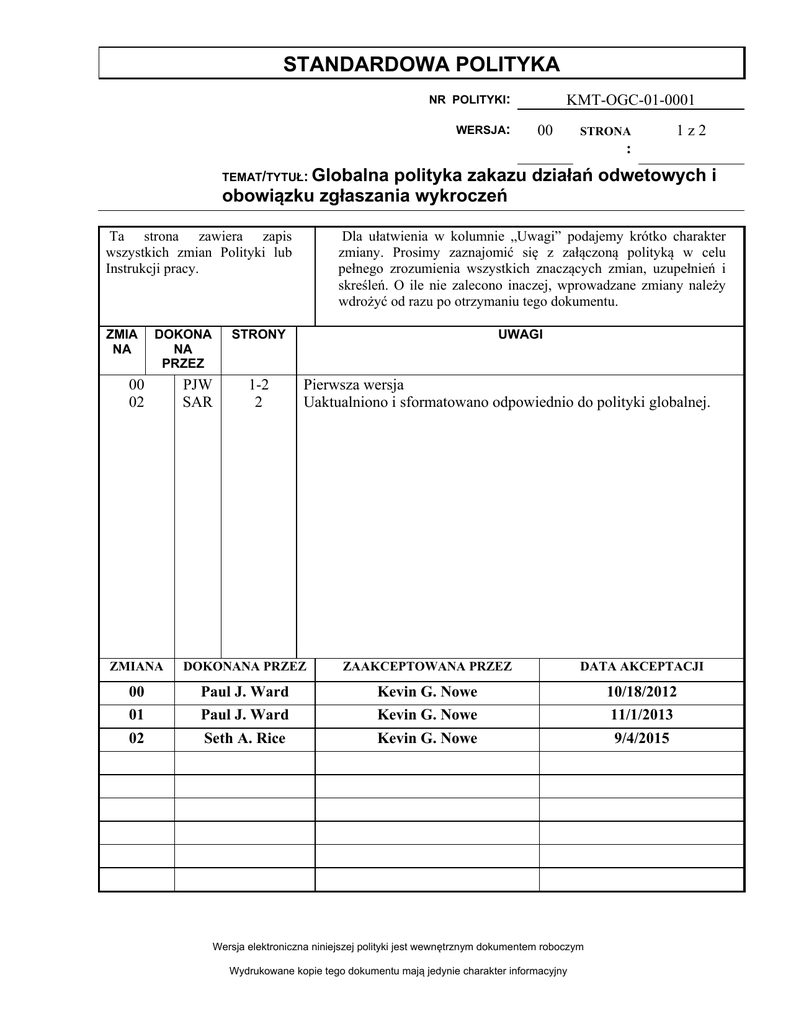 STANDARDOWA POLITYKA NR POLITYKI: WERSJA: KMT-OGC-01-0001 00 STRONA 1z2 : TEMAT/TYTUŁ: Globalna polityka zakazu działań odwetowych i obowiązku zgłaszania wykroczeń Ta strona zawiera zapis wszystkich zmian Polityki lub Instrukcji pracy. ZMIA NA DOKONA NA PRZEZ 00 02 Dla ułatwienia w kolumnie „Uwagi” podajemy krótko charakter zmiany. Prosimy zaznajomić się z załączoną polityką w celu pełnego zrozumienia wszystkich znaczących zmian, uzupełnień i skreśleń. O ile nie zalecono inaczej, wprowadzane zmiany należy wdrożyć od razu po otrzymaniu tego dokumentu. STRONY PJW SAR 1-2 2 UWAGI Pierwsza wersja Uaktualniono i sformatowano odpowiednio do polityki globalnej. ZMIANA DOKONANA PRZEZ ZAAKCEPTOWANA PRZEZ DATA AKCEPTACJI 00 01 02 Paul J. Ward Paul J. Ward Seth A. Rice Kevin G. Nowe Kevin G. Nowe Kevin G. Nowe 10/18/2012 11/1/2013 9/4/2015 Wersja elektroniczna niniejszej polityki jest wewnętrznym dokumentem roboczym Wydrukowane kopie tego dokumentu mają jedynie charakter informacyjny Globalna polityka zakazu działań odwetowych i obowiązku zgłaszania wykroczeń 1. Zakres Niniejsza polityka obowiązuje wszystkich pracowników, funkcjonariuszy i dyrektorów firmy Kennametal Inc. i firm zależnych i stowarzyszonych na całym świecie (zwanych poniżej „personelem firmy Kennametal”). 2. Wstęp Kodeks postępowania Firmy Kennametal ustanawia wytyczne i zakres odpowiedzialności dla wszystkich pracowników, funkcjonariuszy, dyrektorów i partnerów biznesowych w celu aktywnego promowania uczciwego i etycznego postępowania w naszej pracy. Od całego personelu Firmy Kennametal i partnerów biznesowych oczekuje się prowadzenia działalności biznesowej w sposób jak najbardziej prawy, przy zastosowaniu najwyższych standardów etycznych i w sposób uczciwy i z szacunkiem. 3. Zgłaszanie problemów związanych z etyką i przestrzeganiem zasad Ktokolwiek spośród członków personelu Firmy Kennametal wie o czynach, które stanowią lub mogą stanowić naruszenie Kodeksu postępowania, jakiejkolwiek polityki lub procedury Firmy Kennametal lub któregokolwiek prawa lub przepisu, jest zobowiązany do niezwłocznego zawiadomienia Firmy o tych czynach. Zgłoszenia niewłaściwego postępowania lub naruszenia można kierować do członków kierownictwa zarządu Firmy, Biura Radcy Prawnego lub Dyrektora Biura ds. Etyki i Postępowania Zgodnie z Zasadami. Poufne i anonimowe zgłoszenia można składać bez względu na porę na linii pomocy Firmy Kennametal pod nr 1-877-781-7319 korzystając z AT&T global access numbers,[numerów ATT globalnego dostępu], składając raport online na stronie https://kennametal.alertline.com/gcs/welcome lub https://kennametaleu.alertline.com/gcs/welcome w Niemczech i we Francji, lub przesyłając email do Dyrektora Biura ds. Etyki i Postępowania Zgodnie z Zasadami na adres k- [email protected]. 4. Nietolerancja odwetu Żaden członek personelu Firmy Kennametal lub biznesu partnerskiego, który w dobrej wierze zgłosił wiadome lub podejrzewane naruszenie nie stanie się przedmiotem jakiegokolwiek odwetu,w tym molestowania lub ujemnych konsekwencji dotyczących zatrudnienia. Wszelkie formy odwetu stanowią naruszenie Kodeksu postępowania i polityki Firmy oraz stanowią naruszenie prawa w większości miejscowości, w których działa Firma Kennametal. Każdy pracownik, funkcjonariusz lub dyrektor Firmy Kennametal podejmujący działania odwetowe przeciwko osobie, która w dobrej wierze zgłosiła wiadome jej lub podejrzane naruszenie podlega postępowaniu dyscyplinarnemu łącznie z usunięciem z pracy. Niniejsza polityka została opracowana w celu zachęcenia i ochrony personelu Firmy Kennametal i innych, którzy wyrażą swój niepokój w związku z wiadomym im lub podejrzanym naruszeniem Kodeksu postępowania, dowolnej Polityki lub procedury Firmy Kennametal lub innych praw albo przepisów. 2 5. Zgłaszanie w dobrej wierze Zgodnie z niniejszą Polityką, wszelkie podejrzenia lub skargi są w pełni chronione, nawet jeśli dochodzenie wykaże, że zgłoszony problem nie znajduje uzasadnienia w faktach lub jest niepotwierdzony. Osoby zgłaszające podejrzenie lub skargę o wiadomym im lub podejrzanym naruszeniu muszą działać w dobrej wierze lub mieć uzasadnioną podstawę, żeby myśleć, że zgłoszone informacje stanowią naruszenie. Wszelkie nieuzasadnione zarzuty, co do których wykazano, że zgłoszone zostały w sposób złośliwy lub że w czasie zgłaszania wiadomo było, że są one nieprawdziwe, będą traktowane jako poważne naruszenie niniejszej Polityki, zostaną poddane akcji dyscyplinarnej łącznie z usunięciem z pracy. 6. Odpowiedź na zgłoszone naruszenie Wszystkie zgłoszenia naruszeń lub niewłaściwego postępowania zostaną niezwłocznie zbadane i podjęte zostaną działania naprawcze, jeżeli wynik dochodzenia wskaże, że jest to stosowne. Osoba dokonująca zgłoszenia wiadomego jej lub podejrzanego naruszenia otrzyma odpowiednią odpowiedź na zakończenie dochodzenia z wyjątkiem przypadków, w których zgłoszenie było anonimowe i wobec tego nie ma ma możliwości skontaktowania się z osobą zgłaszającą. 7. Poufność Zachowuje się poufność wszelkich zgłoszeń niewłaściwego postępowania lub naruszania zasad i w dochodzeniu biorą jedynie osoby potrzebne do oceny zgłoszenia. Zrobimy wszystko, co w naszej mocy, aby chronić tożsamość osób zgłaszających naruszenie lub niewłaściwe postępowanie oraz osób przesłuchiwanych lub konsultowanych podczas dochodzenia. Osoby zaangażowane w dochodzenie lub posiadające informacje dotyczące domniemanego niewłaściwego postępowania lub naruszenia zasa mają obowiązek traktowania wszystkich danych dotyczących dochodzenia w sposób poufny i dyskretny. 3