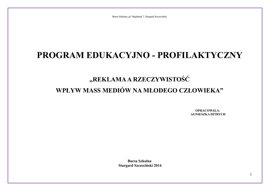 Bursa Szkolna, pl. Majdanek 7, Stargard Szczeciński PROGRAM EDUKACYJNO - PROFILAKTYCZNY „REKLAMA A RZECZYWISTOŚĆ WPŁYW MASS MEDIÓW NA MŁODEGO CZŁOWIEKA” OPRACOWAŁA: AGNIESZKA DITRYCH Bursa Szkolna Stargard Szczeciński 2014 1 Bursa Szkolna, pl. Majdanek 7, Stargard Szczeciński Myśl przewodnia Reklama pojawia się wszędzie, niepozornie wkrada się w codzienność, w swym pakiecie ofiarując obietnicę spełnionych marzeń. Jest w mediach, na bilbordach, w prasie... kusi i zachęca. Powiadają, „reklama dźwignią handlu”. Prowokuje do nabycia nowych, zbędnych towarów, coraz częściej skłania nas do „mieć” niż „być”. Przez pryzmat tego co posiadamy patrzymy na siebie i innych. Kwestie materialne odgrywają priorytet, namacalną pozycję i prestiż. Kult piękna, to kolejna odsłona zniewolenia kulturą masową... perfekcyjne dążenie do doskonałości, bycia pięknym, szczupłym, młodym - nie ma miejsca na wartości i morale. Liczy się tu i teraz. To pułapka, a jej konsekwencje są dotkliwe, ranią i pozbywają złudzeń, niejednokrotnie płacimy zdrowiem, a nawet życiem za swoją próżność i naiwność. Zatracamy samych siebie. Jesteśmy w stanie zrobić wszystko, a na pewno wiele by osiągnąć wymarzone rezultaty.... ale czy to rzeczywiście nas ubogaci, uszczęśliwi, rozwiąże każdy problem? My sami jesteśmy odpowiedzialni za scenariusz życia, a pozwalamy by wielkie koncerny biznesu zawładnęły nami, tym samym w teatrze życia gramy marne role marionetek, nieświadomi, że wkraczamy w świat iluzji i fantazji dalekiej od rzeczywistości, bo rynek marketingowy jest bezlitosny, a jego celem jest zysk! W kamuflażu doskonałości celebryci i inne znane osoby publiczne. Są tacy jak my. A ich perfekcyjny wizerunek to praca całego sztabu profesjonalistów od wizerunku, w towarzystwie photo-shopa (program do obróbki zdjęć), a my wierzymy w to co widzimy... Uczestnikom programu edukacyjno-profilaktyczny „Reklama a rzeczywistość”, pragnę przedstawić obraz świadomego odbioru i selekcji informacji jakie nas otaczają. Tym samym chciałabym zapoznać wychowanków z konsekwencjami pochopnych wyborów, jakie młodzi ludzie popełniają pod presją mody. A otaczająca rzeczywistość z reklamą w tle to złudna nadzieja drogi do perfekcji, bo wady i zalety są wpisane w każdego z nas, dzięki czemu jesteśmy niepowtarzalni i interesujący, jednakże musimy polubić siebie takimi jakimi jesteśmy- a to co oferują nam mas media – to fałszywy obrazem przepisu na sukces. 2 Bursa Szkolna, pl. Majdanek 7, Stargard Szczeciński CELE Cele główne: kształtowanie świadomej postawy wychowanków wobec otaczających mas mediów, wzmocnienie odporności uczniów na manipulację i wzmocnienie świadomego odbioru komunikatu reklamowego, budowanie i wzmacnianie poczucia własnej wartości, wzrost samooceny. Cele szczegółowe: zapoznanie wychowanków z pojęciami: mas media, reklama, manipulacja, perswazja, świadoma postawa, wskazanie form, mechanizmów i sposobów manipulacji, a także obrona przed nimi, świadomość skutków dążenia do doskonałości - choroby psychiczne i fizyczne (anoreksja, bulimia), operacje plastyczne / zaniżona samoocena (izolacja społeczna), dostrzeganie zalet i wad reklamy jako komunikatu perswazyjnego, akceptacja siebie kim jestem, praca własna nad wadami nie musi być złem koniecznym. WARUNKI REALIZACJI formalna zgoda dyrektora bursy na realizację programu, posiadanie przez prowadzących zajęcia odpowiednich kwalifikacji i kompetencji, uczestnicy programu – wychowankowie bursy szkolnej w Stargardzie Szczecińskim - uczniowie gimnazjum i szkół ponadgimnazjalnych., liczba uczestników: 10 – 20 w grupie, zasady rekrutacji wychowanków na zajęcia; obowiązkowy udział wychowanków na wszystkich trzech spotkaniach, nabór w porozumieniu z wychowawcami grup, podstawowe kryterium rekrutacji: osoby wymagające zmiany postrzegania siebie, 3 Bursa Szkolna, pl. Majdanek 7, Stargard Szczeciński liczba zajęć: 3. czas trwania zajęć w wymiarze 1 - 2 godziny zegarowe. miejsce zajęć: sala dostosowana do zajęć audiowizualnych. TREŚCI LP. 1 2 3 TEMATY ZAJĘĆ Czy jestem towarem? W jaki sposób reklama wpływa na moją osobę? Omówienie świadomej postawy wobec otaczających mass mediów: istota mass mediów, świadomość odbiorców. CELE SZCZEGÓŁOWE SPODZIEWANE EFEKTY zapoznanie wychowanków z pojęciami: Uczestnicy: mass media, reklama, manipulacja, znają pojęcia: mas media, reklama, manipulacja, perswazja, perswazja, świadoma postawa. świadoma postawa, i rolę jaką pełnią na co dzień w ich życiu, reprezentują właściwą postawę wobec napływających informacji są świadomi trików mass mediów. Czy jestem marionetką? kto i co ma wpływ na to kim chcę być? wpływ trendów i reklamy na podejmowane decyzje, skutki nieprzemyślanych decyzji : (pod presją mody i reklamy /zdrowotne/estetyczne/społeczne/eko nomiczne) wskazanie form, mechanizmów i sposobów manipulacji, a także obrona przed nimi, wiadomość skutków dążenia do doskonałości-choroby psychiczne i fizyczne (anoreksja, bulimia) / operacje plastyczne / zaniżona samoocena (izolacja społeczna). Uczestnicy: wiedzą, jakie wpływ ma moda i reklama na podejmowane decyzje, znają działanie manipulacji stosowanej w reklamie, znają skutki nieprzemyślanych decyzji podejmowanych pod wpływem mody. Kim jestem, kim się staję? czyli jak nie dać się zwariować. reklama nie musi być zła, lubię siebie, wady to nieodzowna część nas. dostrzeganie zalet i wad reklamy jako komunikatu perswazyjnego, akceptacja siebie kim jestem, praca własna nad wadami nie musi być złem koniecznym. Uczestnicy: są świadomymi odbiorcami reklamy, są świadomi siebie, swoich zalet i wad, podejmuje działania w celu pracy nad wadami, czerpią satysfakcję z osiągniętych sukcesów. 4 Bursa Szkolna, pl. Majdanek 7, Stargard Szczeciński METODY I FOR