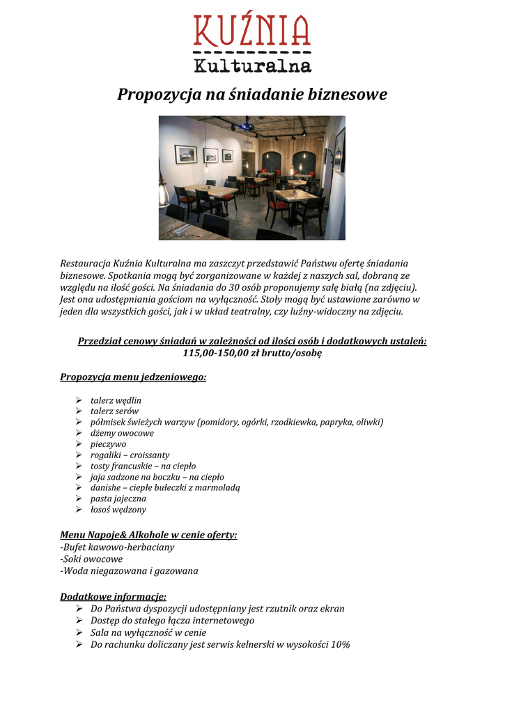 Propozycja na śniadanie biznesowe Restauracja Kuźnia Kulturalna ma zaszczyt przedstawić Państwu ofertę śniadania biznesowe. Spotkania mogą być zorganizowane w każdej z naszych sal, dobraną ze względu na ilość gości. Na śniadania do 30 osób proponujemy salę białą (na zdjęciu). Jest ona udostępniania gościom na wyłączność. Stoły mogą być ustawione zarówno w jeden dla wszystkich gości, jak i w układ teatralny, czy luźny-widoczny na zdjęciu. Przedział cenowy śniadań w zależności od ilości osób i dodatkowych ustaleń: 115,00-150,00 zł brutto/osobę Propozycja menu jedzeniowego: talerz wędlin talerz serów półmisek świeżych warzyw (pomidory, ogórki, rzodkiewka, papryka, oliwki) dżemy owocowe pieczywo rogaliki – croissanty tosty francuskie – na ciepło jaja sadzone na boczku – na ciepło danishe – ciepłe bułeczki z marmoladą pasta jajeczna łosoś wędzony Menu Napoje& Alkohole w cenie oferty: -Bufet kawowo-herbaciany -Soki owocowe -Woda niegazowana i gazowana Dodatkowe informacje: Do Państwa dyspozycji udostępniany jest rzutnik oraz ekran Dostęp do stałego łącza internetowego Sala na wyłączność w cenie Do rachunku doliczany jest serwis kelnerski w wysokości 10%