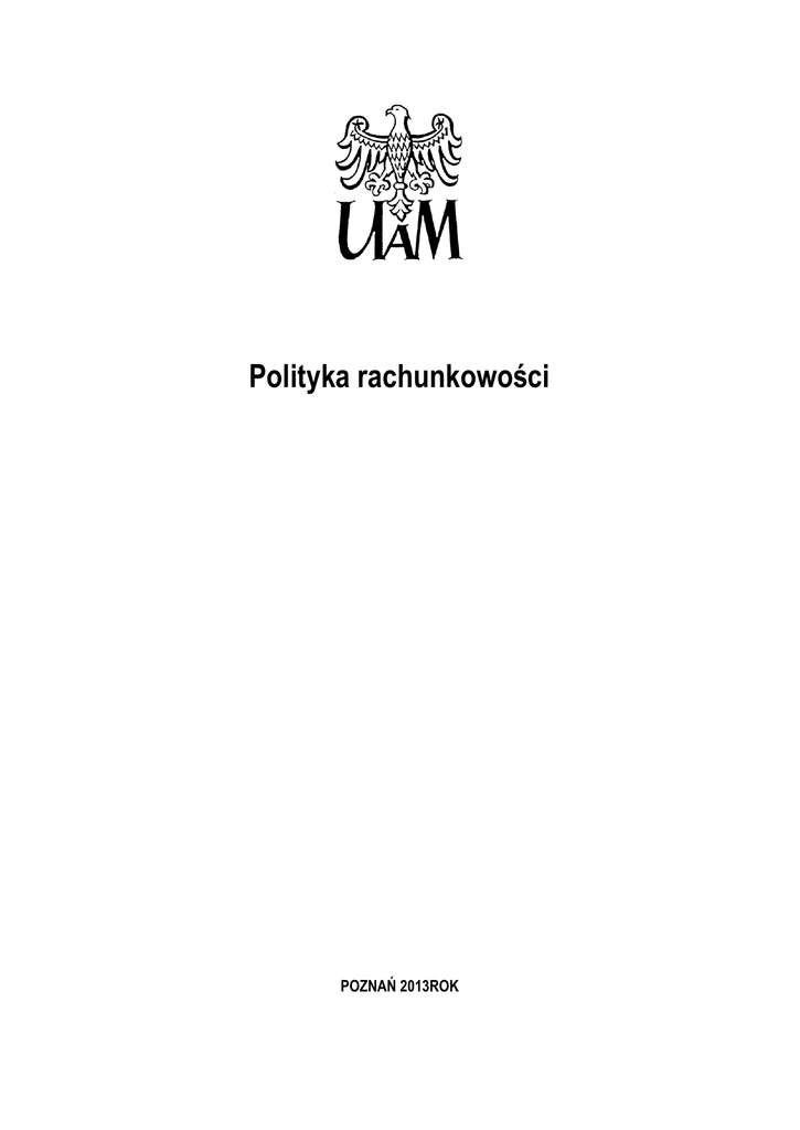 Polityka rachunkowości POZNAŃ 2013ROK Spis treści 1.INFORMACJE OGÓLNE............................................................................................... 3 2.PROWADZENIE KSIĄG RACHUNKOWYCH. .............................................................. 4 3.INWENTARYZACJA ..................................................................................................... 6 4.WYCENA AKTYWÓW I PASYWÓW ORAZ USTALANIE WYNIKU FINANSOWEGO .. 8 4.1Wycena składników majątku obrotowego. ...................................................................................... 8 4.2Wycena aktywów trwałych. ............................................................................................................. 8 4.3Wycena aktywów i pasywów wyrażonych w walutach obcych. ....................................................... 9 4.4Wynik finansowy Uczelni. ............................................................................................................. 10 4.5Amortyzacja. ................................................................................................................................. 10 4.6Ewidencja kosztów. ...................................................................................................................... 10 4.7Aktualizacja należności. ................................................................................................................ 12 4.8Rezerwy na zobowiązania. ........................................................................................................... 13 4.9Fundusze. ..................................................................................................................................... 14 5.SPRAWOZDANIA FINANSOWE................................................................................. 14 6.BADANIE I OGŁASZANIE SPRAWOZDAŃ FINANSOWYCH..................................... 15 7.PRZECHOWYWANIE I OCHRONA DANYCH ............................................................ 15 8.SYSTEM PRZETWARZANIA DANYCH KSIĘGOWYCH I PŁACOWYCH W UAM...... 16 8.1System finansowo-księgowy FK. .................................................................................................. 17 8.2Gospodarka materiałowa GM. ...................................................................................................... 17 8.3Środki trwałe ST. .......................................................................................................................... 17 8.4Płace............................................................................................................................................. 18 8.5Rejestr VAT. ................................................................................................................................. 18 8.6Kasa. ............................................................................................................................................ 18 8.7Wydatki strukturalne ..................................................................................................................... 18 9.INFORMACJE DODATKOWE .................................................................................... 18 Strona – 2 – 1. INFORMACJE OGÓLNE Uniwersytet im. Adama Mickiewicza w Poznaniu jest szkołą wyższą działającą w oparciu o: 1. Ustawę Prawo o szkolnictwie wyższym z dnia 27 lipca 2005r. / Dz. U. z 2012, poz. 572 z późn.zm./, 2. Ustawa o zasadach finansowania nauki z dnia 30 kwietnia 2010 r. /Dz. U. 2010, Nr 96, poz.615 z późn.zm./ 3. Statut UAM uchwalony przez Senat w dniu 19.06.2006r. /uchwała nr 59/2006/ z późn. zm. – tekst jednolity opublikowany w obwieszczeniu Senatu Uniwersytetu z dnia 30 stycznia 2012r. Nr 3/2012/, 4. Rozporządzenie Rady Ministrów z dnia 18 grudnia 2012 r. w sprawie szczegółowych zasad gospodarki finansowej uczelni publicznych /Dz. U. 2012, poz.1533/ Podstawowym aktem prawnym normującym zasady prowadzenia rachunkowości w Uniwersytecie jest ustawa o rachunkowości z dnia 29 września 1994 r. /Dz. U. z 2013, poz. 330 z późniejszymi zmianami/. Uczelnia prowadzi samodzielną gospodarkę finansową na podstawie rocznego planu rzeczowofinansowego, w którym oszacowuje przychody oraz koszty działalności finansowej. Powyższy plan opracowany jest w oparciu o ustawę z dnia 27 sierpnia 2009r. o finansach publicznych /Dz. U. 2012, poz. 885 z późniejszymi zmianami/. Określone w planie przychody pochodzą z dotacji budżetowych, przychodów własnych uzyskiwanych z tytułu odpłatnie prowadzonej działalności oraz z innych źródeł. Plan rzeczowo-finansowy obejmuje realizację zadań i funkcji Uczelni w zakresie działalności dydaktycznej, naukowo-badawczej oraz pomocy materialnej dla studentów, uchwalany jest przez Senat zgodnie z § 46 ust.2 pkt 13 statutu. Rektor przedstawia Senatowi Uczelni roczne sprawozdanie z wykonania planu rzeczowo-finansowego. W myśl ustawy z dnia 27 sierpnia 2009r. o finansach publicznych UAM jako uczelnia publiczna, zaliczana jest do jednostek sektora finansów publicznych, gdyż w części jest finansowana ze środków publicznych, oraz do państwowej sfery budżetowej, w odniesieniu do zagadnień z dziedziny zatrudnienia i wynagrodzeń. Środki trwałe służące do badań naukowych lub prac badawczo-rozwojowych mogą być finansowane z dotacji budżetowej przyznanej zgodnie z odrębnymi przepisami oraz z innych źródeł. Na podstawie art. 10 ust.1 Ustawy o rachunkowości ustala się przyjęte przez Uniwersytet im. Adama Mickiewicza w Poznaniu zasady rachunkowości. Strona – 3 – Przez zasady /politykę/ rachunkowości rozumiemy, zgodnie z art. 3 ust.1 pkt.11 ustawy o rachunkowości, „Wybrane i stosowane przez Uczelnię, odpowiednie do jej działalności, rozwiązania dopuszczone ustawą, w tym także określone w MSR, zapewniające wymaganą jakość sprawozdań finansowych”. 2. PROWADZENIE KSIĄG RACHUNKOWYCH. Rokiem obrotowym w Uniwersy