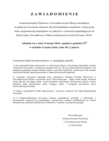 ZAWIADOMIENIE Gminna Komisja Wyborcza w Goczałkowicach-Zdroju zawiadamia, że publiczne losowanie numerów dla list kandydatów komitetów wyborczych, które zarejestrowały kandydatów na radnych w wyborach uzupełniających do Rady Gminy Goczałkowice-Zdrój zarządzonych na dzień 20 marca 2016r. odbędzie się w dniu 19 lutego 2016r. (piątek) o godzinie 1500 w siedzibie Urzędu Gminy (sala 101, I piętro). Losowanie będzie przeprowadzone w następujący sposób: 1) dwa pojemniki będą umieszczone w widocznym miejscu. Do jednego pojemnika zostanie włożonych tyle kartek z kolejnymi numerami dla list, ile jest uprawnionych komitetów. Do drugiego pojemnika zostaną włożone kartki z nazwami komitetów wyborczych. Oba rodzaje losowanych kartek będą umieszczone w nieprzeźroczystych kopertach, 2) czynności losowania dokonają dwaj członkowie Gminnej Komisji Wyborczej w Goczałkowicach-Zdroju wyznaczeni przez Przewodniczącą . Jedna osoba będzie losowała numer dla list, zaś druga osoba - nazwę komitetu wyborczego. Wylosowany numer i nazwa komitetu będą odczytywane przez losujące osoby i następnie powtarzane przez Przewodniczącą Komisji. 3) wyjęte z pojemników kartki będą łączone i zszywane; stanowić one będą dokumentację losowania. 4) Z przeprowadzonego losowania zostanie sporządzony protokół, a informacja o przyznanych numerach list kandydatów niezwłocznie zostanie opublikowana na stronie internetowej i podana do publicznej wiadomości w sposób zwyczajowo przyjęty. Przewodnicząca Gminnej Komisji Wyborczej w Goczałkowicach-Zdroju (-) Anna Mrzyk