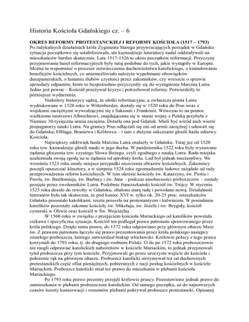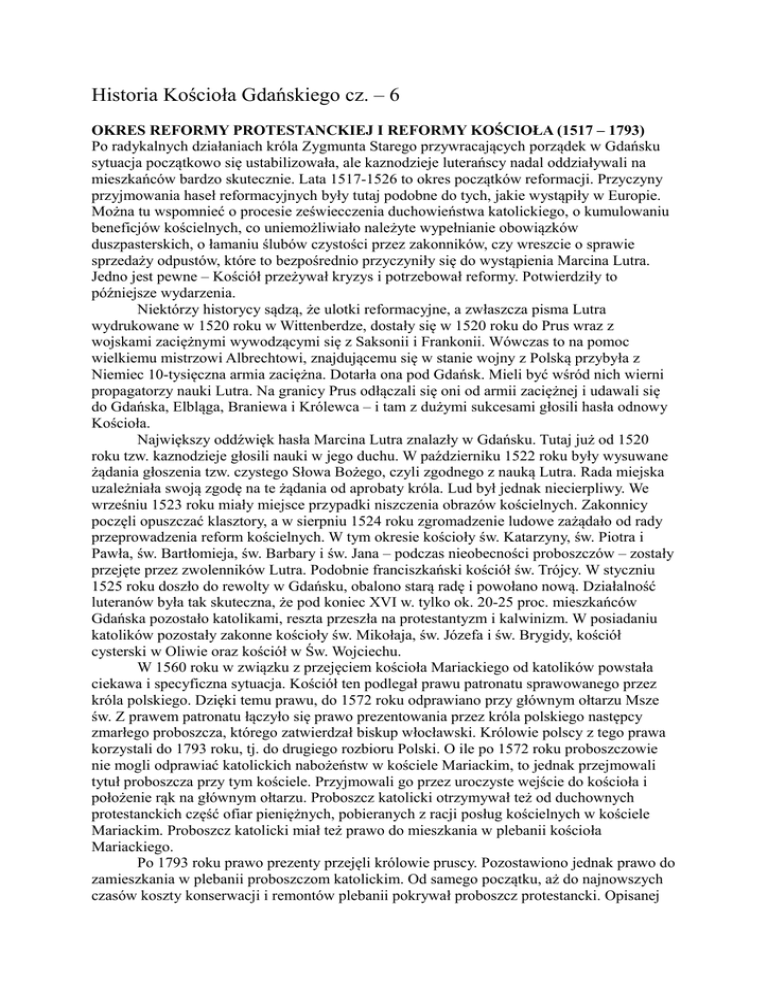 Historia Kościoła Gdańskiego cz. – 6 OKRES REFORMY PROTESTANCKIEJ I REFORMY KOŚCIOŁA (1517 – 1793) Po radykalnych działaniach króla Zygmunta Starego przywracających porządek w Gdańsku sytuacja początkowo się ustabilizowała, ale kaznodzieje luterańscy nadal oddziaływali na mieszkańców bardzo skutecznie. Lata 1517-1526 to okres początków reformacji. Przyczyny przyjmowania haseł reformacyjnych były tutaj podobne do tych, jakie wystąpiły w Europie. Można tu wspomnieć o procesie zeświecczenia duchowieństwa katolickiego, o kumulowaniu beneficjów kościelnych, co uniemożliwiało należyte wypełnianie obowiązków duszpasterskich, o łamaniu ślubów czystości przez zakonników, czy wreszcie o sprawie sprzedaży odpustów, które to bezpośrednio przyczyniły się do wystąpienia Marcina Lutra. Jedno jest pewne – Kościół przeżywał kryzys i potrzebował reformy. Potwierdziły to późniejsze wydarzenia. Niektórzy historycy sądzą, że ulotki reformacyjne, a zwłaszcza pisma Lutra wydrukowane w 1520 roku w Wittenberdze, dostały się w 1520 roku do Prus wraz z wojskami zaciężnymi wywodzącymi się z Saksonii i Frankonii. Wówczas to na pomoc wielkiemu mistrzowi Albrechtowi, znajdującemu się w stanie wojny z Polską przybyła z Niemiec 10-tysięczna armia zaciężna. Dotarła ona pod Gdańsk. Mieli być wśród nich wierni propagatorzy nauki Lutra. Na granicy Prus odłączali się oni od armii zaciężnej i udawali się do Gdańska, Elbląga, Braniewa i Królewca – i tam z dużymi sukcesami głosili hasła odnowy Kościoła. Największy oddźwięk hasła Marcina Lutra znalazły w Gdańsku. Tutaj już od 1520 roku tzw. kaznodzieje głosili nauki w jego duchu. W październiku 1522 roku były wysuwane żądania głoszenia tzw. czystego Słowa Bożego, czyli zgodnego z nauką Lutra. Rada miejska uzależniała swoją zgodę na te żądania od aprobaty króla. Lud był jednak niecierpliwy. We wrześniu 1523 roku miały miejsce przypadki niszczenia obrazów kościelnych. Zakonnicy poczęli opuszczać klasztory, a w sierpniu 1524 roku zgromadzenie ludowe zażądało od rady przeprowadzenia reform kościelnych. W tym okresie kościoły św. Katarzyny, św. Piotra i Pawła, św. Bartłomieja, św. Barbary i św. Jana – podczas nieobecności proboszczów – zostały przejęte przez zwolenników Lutra. Podobnie franciszkański kościół św. Trójcy. W styczniu 1525 roku doszło do rewolty w Gdańsku, obalono starą radę i powołano nową. Działalność luteranów była tak skuteczna, że pod koniec XVI w. tylko ok. 20-25 proc. mieszkańców Gdańska pozostało katolikami, reszta przeszła na protestantyzm i kalwinizm. W posiadaniu katolików pozostały zakonne kościoły św. Mikołaja, św. Józefa i św. Brygidy, kościół cysterski w Oliwie oraz kościół w Św. Wojciechu. W 1560 roku w związku z przejęciem kościoła Mariackiego od katolików powstała ciekawa i specyficzna sytuacja. Kościół ten podlegał prawu patronatu sprawowanego przez króla polskiego. Dzięki temu prawu, do 1572 roku odprawiano przy głównym ołtarzu Msze św. Z prawem patronatu łączyło się prawo prezentowania przez króla polskiego następcy zmarłego proboszcza, którego zatwierdzał biskup włocławski. Królowie polscy z tego prawa korzystali do 1793 roku, tj. do drugiego rozbioru Polski. O ile po 1572 roku proboszczowie nie mogli odprawiać katolickich nabożeństw w kościele Mariackim, to jednak przejmowali tytuł proboszcza przy tym kościele. Przyjmowali go przez uroczyste wejście do kościoła i położenie rąk na głównym ołtarzu. Proboszcz katolicki otrzymywał też od duchownych protestanckich część ofiar pieniężnych, pobieranych z racji posług kościelnych w kościele Mariackim. Proboszcz katolicki miał też prawo do mieszkania w plebanii kościoła Mariackiego. Po 1793 roku prawo prezenty przejęli królowie pruscy. Pozostawiono jednak prawo do zamieszkania w plebanii proboszczom katolickim. Od samego początku, aż do najnowszych czasów koszty konserwacji i remontów plebanii pokrywał proboszcz protestancki. Opisanej sytuacji nie zmienił fakt wybudowania z inicjatywy króla polskiego Jana III Sobieskiego w latach 1678-1681 Kaplicy Królewskiej. Po Soborze Trydenckim (1545-1563) w kościele realizowano reformy życia religijno-moralnego na wielu płaszczyznach. W Polsce znaczącą rolę w tym okresie odegrał kard. Stanisław Hozjusz. Realizacji kościelnej odnowy potrydenckiej skutecznie podjęły się także reformujące się zakony, w tym również oliwscy cystersi. W 1580 roku powstała polska prowincja cystersów. Król Zygmunt August postulował, aby w tej prowincji opatami byli Polacy. Dużą rolę w realizacji potrydenckiej reformy odegrał zakon jezuitów. Do Gdańska jezuici przybyli w 1585 roku, a w 1615 roku rozpoczęli budowę kościoła w Gdańsku-Oruni. Budowa przechodziła różne fazy. Obok kościoła w 1592 roku jezuici wybudowali kolegium, w którym uczyła się młodzież nie tylko katolicka, ale też protestancka i kalwińska. Świadczyło to o wysokim poziomie nauczania w tym kolegium. Obecny kościół św. Ignacego został zbudowany w latach 1747-1755. W Świętym Wojciechu do 1711 roku parafią kierował ksiądz diecezjalny. Od tego czasu biskup włocławski K. Szaniawski przekazał ten kościół Misjonarzom św. Wincentego a Paulo. Zbudowali oni budynek klasztorny, który dziś jest plebanią. Od połowy XVIII wieku istniejąca tam szkoła dla młodzieży, została przekształcona w seminarium duchowne kształcące przyszłych księży dla Gdańska i Pomorza. W samym Gdańsku pracę duszpasterską pełnili dominikanie przy kościele św. Mikołaja, karmelici przy kościele św. Józefa, zakonnicy przy kościele św. Brygidy i księża diecezjalni przy Kaplicy Królewskiej (od 1681 r.). Ten stan faktyczny został potwierdzony przez biskupa włocławskiego Feliksa Szaniawskiego, który ustanowił przy tych kości