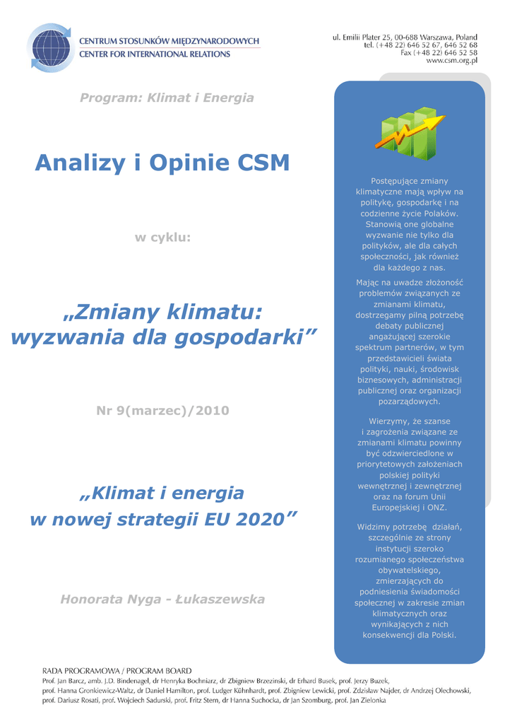 Program: Klimat i Energia Analizy i Opinie CSM w cyklu: „Zmiany klimatu: wyzwania dla gospodarki” Nr 9(marzec)/2010 „Klimat i energia w nowej strategii EU 2020” Honorata Nyga - Łukaszewska Postępujące zmiany klimatyczne mają wpływ na politykę, gospodarkę i na codzienne życie Polaków. Stanowią one globalne wyzwanie nie tylko dla polityków, ale dla całych społeczności, jak również dla każdego z nas. Mając na uwadze złożoność problemów związanych ze zmianami klimatu, dostrzegamy pilną potrzebę debaty publicznej angażującej szerokie spektrum partnerów, w tym przedstawicieli świata polityki, nauki, środowisk biznesowych, administracji publicznej oraz organizacji pozarządowych. Wierzymy, że szanse i zagrożenia związane ze zmianami klimatu powinny być odzwierciedlone w priorytetowych założeniach polskiej polityki wewnętrznej i zewnętrznej oraz na forum Unii Europejskiej i ONZ. Widzimy potrzebę działań, szczególnie ze strony instytucji szeroko rozumianego społeczeństwa obywatelskiego, zmierzających do podniesienia świadomości społecznej w zakresie zmian klimatycznych oraz wynikających z nich konsekwencji dla Polski. Klimat i energia w nowej strategii „EU 2020” „Musimy stworzyć nowy model gospodarczy oparty na wiedzy, niskoemisyjnej gospodarce i wysokiej stopie zatrudnienia. Jest to walka wymagająca mobilizacji całej Europy” - Jose Manuel Barroso. 3 marca 2010 roku Komisja Europejska przedstawiła nową strategię „EU2020”. Ma ona zastąpić, przyjętą w 2000 roku, Strategię Lizbońską, która nie przyniosła oczekiwanych efektów. Większości jej celów, jak przeznaczanie 3 proc. PKB na badania i rozwój, nie udało się osiągnąć. Nowa strategia ma doprowadzić do ożywienia unijnej gospodarki po kryzysie gospodarczym. Przewodniczący Komisji Europejskiej - Jose Manuel Barroso, przekonuje, iż rozwój gospodarki europejskiej powinien opierać się na "inteligentnym, zielonym i korzystnym dla wszystkich obywateli” wzroście gospodarczym. Osiągnięcie tak wyznaczonych priorytetów ma nastąpić w drodze realizacji pięciu celów: wskaźnik zatrudnienia osób w wieku 20-64 lat powinien wynosić 75%; na inwestycje w badania i rozwój należy przeznaczać 3% PKB Unii; należy osiągnąć cele „20/20/20” w zakresie klimatu i energii; liczbę osób przedwcześnie kończących naukę szkolną należy ograniczyć do 10%, a co najmniej 40% osób z młodego pokolenia powinno zdobywać wyższe wykształcenie; liczbę osób zagrożonych ubóstwem należy zmniejszyć o 20 mln. Celom towarzyszą tzw. inicjatywy przewodnie, które mają stanowić narzędzia realizacji priorytetów. W obszarze klimatu i energii zwrócono szczególną uwagę na efektywne wykorzystywanie zasobów, zwiększenie zużycia odnawialnych źródeł energii i propagowanie efektywności energetycznej. Celem tej inicjatywy przewodniej jest uniezależnienie wzrostu gospodarczego od wykorzystania zasobów i energii, zmniejszenie emisji dwutlenku węgla, zwiększanie konkurencyjności unijnej gospodarki i zapewnienie bezpieczeństwa energetycznego. Wsparcie zmian mających na celu rozwój gospodarki niskoemisyjnej, oszczędnie wykorzystującej zasoby mogłoby, w ocenie Komisji Europejskiej, może zmniejszyć w 2020 roku, wartość importu ropy naftowej i gazu o 60 mld Euro. Komisja Europejska wychodzi bowiem 1 z założenia, iż wyzwania związane ze zmianami klimatu i zasobami naturalnymi wymagają zdecydowanych działań. Wyzwania wiążą się z uzależnieniem krajów członkowskich Unii Europejskiej od paliw kopalnych, a nieefektywne wykorzystywanie surowców, naraża państwa członkowskie na szok cenowy, który zagraża bezpieczeństwu gospodarczemu i przyczynia się do negatywnych zmian klimatu. W 2005 roku, ponad 50% energii konsumowanej w krajach Unii Europejskiej, pochodziło z importu. Kraje wspólnoty są silnie uzależnione od zagranicznych dostaw ropy (82% zużycia) i gazu ziemnego (58% zużycia). W okresie 1995 – 2005 całkowita zależność w imporcie ropy i gazu krajów UE wzrosła o 9 p.p. Wykres nr 1. Udział importowanej ropy naftowej/gazu ziemnego w zużyciu UE w latach 1995 - 2005. EU - 27 2005 EU - 27 1995 82,20% 74,40% ropa naftowa 57,70% gaz ziemny 43,60% 0% 10% 20% 30% 40% 50% 60% 70% 80% 90% Źródło: opracowanie własne na podstawie danych Eurostat. W dokumencie zaakcentowano również, iż wzrost liczby ludności świata z 6 mld do 9 mld, zwiększy presję na środowisko i zaostrzy światową konkurencję w dostępie do zasobów naturalnych. W „Strategii” docenia się fakt, iż dotychczas to UE była liderem w dziedzinie rozwiązań ekologicznych w zakresie technologii. Tymczasem, zarówno Chiny, jak i USA zwiększyły swoją konkurencyjność w tym obszarze. Kolejnym priorytetem w zakresie zrównoważonego rozwoju, jaki wyznacza nowa strategia jest przeciwdziałanie zmianom klimatu. Wskazuje się przy tym na potrzebę szybszej niż dotychczas redukcji emisji gazów cieplarnianych, w szczególności przy wykorzystaniu nowych technologii.1 Równie istotne jest wzmocnienie odporności systemów gospodarczych państw członkowskich na zagrożenia związane z klimatem 1 W dokumencie wskazuje się na szczególna rolę wychwytywania i sekwestracji dwutlenku węgla. 2 i możliwości reagowania na nie. Komisja dostrzega duży potencjał sektora elektroenergetycznego w zakresie tworzenia nowych miejsc pracy. Szacuje, że osiągnięciu, na poziomie UE, 20 – procentowej produkcji energii z paliw odnawialnych, towarzyszyć będzie stworzenie około 600 000 miejsc pracy w UE. Gdyby dodać do tego 20 – procentowy cel dotyczący poprawy efektywności energetycznej, wówczas liczba nowych miejsc pracy mogłaby wzrosnąć do około 1 miliona.2 Uniezależnienie wzrostu od energii i gospodarki od zewnętrznych dostaw paliw ma wzmocnić pozycję konkurencyjna Unii Europejskiej w świecie. Tak zdefiniowanym celom mają służyć zróżnic