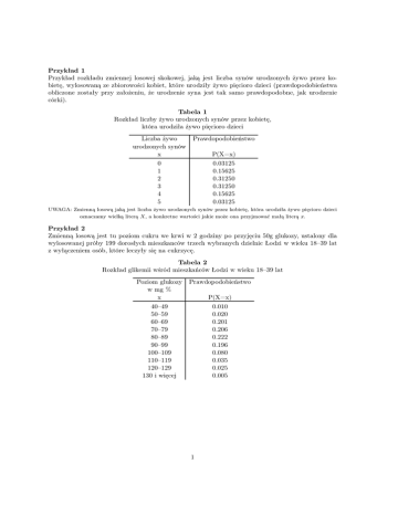 Przykład 1 Przykład rozkładu zmiennej losowej skokowej, jaką jest liczba synów urodzonych żywo przez kobietę, wylosowaną ze zbiorowości kobiet, które urodziły żywo pięcioro dzieci (prawdopodobieństwa obliczone zostały przy założeniu, że urodzenie syna jest tak samo prawdopodobne, jak urodzenie córki). Tabela 1 Rozkład liczby żywo urodzonych synów przez kobietę, która urodziła żywo pięcioro dzieci Liczba żywo urodzonych synów x Prawdopodobieństwo 0 1 2 3 4 5 0.03125 0.15625 0.31250 0.31250 0.15625 0.03125 P(X=x) UWAGA: Zmienną losową jaką jest liczba żywo urodzonych synów przez kobietę, która urodziła żywo pięcioro dzieci oznaczamy wielką literą X, a konkretne wartości jakie może ona przyjmować małą literą x. Przykład 2 Zmienną losową jest tu poziom cukru we krwi w 2 godziny po przyjęciu 50g glukozy, ustalony dla wylosowanej próby 199 dorosłych mieszkanców trzech wybranych dzielnic Łodzi w wieku 18–39 lat z wyłączeniem osób, które leczyły się na cukrzycę. Tabela 2 Rozkład glikemii wśród mieszkańców Łodzi w wieku 18–39 lat Poziom glukozy w mg % x Prawdopodobieństwo 40–49 50–59 60–69 70–79 80–89 90–99 100–109 110–119 120–129 130 i więcej 0.010 0.020 0.201 0.206 0.222 0.196 0.080 0.035 0.025 0.005 P(X=x) 1 Rozkład dwumianowy Jeżeli dokonujemy n niezależnych doświadczeń (tzn. że wynik każdego następnego nie jest zależny od wyników poprzednich doświadczeń), z których każde może zakończyć się w pewnien określony sposób (nazwijmy to sukcesem) z jednakowym prawdopodobieństwem p, to liczba sukcesów jest zmienną losową o rozkładzie dwumianowym: P (n, k, p) = n! pk (1 − p)n−k . k!(n − k)! (1) Powyższy wzór pozwala obliczyć prawdopodobieństwo uzyskania w n doświadczeniach k sukcesów, jeżeli prawdopodobieństwo sukcesu w pojedyńczym doświadczeniu wynosi p. Przykład 3 Pewne doniesienie w naukowym czasopiśmie medycznym informowało, że wśród dzieci z piątych klas szkół podstawowych w mieście A jest około 20% z wadami postawy. Przybyły na wizytację do tego miast lekarz–konsultant zbadał przypadkowo dobranych 6 pięcioklasistów i nie stwierdził u żadnego z nich wady postawy. Czy przeczy to prawidłowości doniesienia? Tabela 3 Rozkład prawdopodobieństwa zmiennej losowej, zdefiniowanej jako liczba dzieci z wadą postawy liczba dzieci z wadą postawy k P(k) 0 0.262 0.393 1 2 0.246 3 0.082 0.015 4 5 0.002 0.000 6 Zadanie 1 Siła kiełkowania pewnych nasion wynosi 96%. Określić prawdopodobieństwo tego, że spośród 10 losowo wybranych nasion co njamniej 8 wykiełkuje. Zadanie 2 Wadliwość produkcji pewnego zakładu wynosi 2%. Pobieramy 8 sztuk towaru. Obliczyć prawdopodobieństwo, że wśród nich są co najwyżej 2 sztuki wadliwe. Zadanie 3 Pewna firma posiada pięć jednakowych komputerów pracujących niezależnie od siebie. Prawdopodobieństwo tego, że w ciągu dnia roboczego komputer ulegnie awarii wynosi 0,1. Zakładamy, że awarię usuwa się dopiero następnego dnia. Oblicz prawdopodobieństwo tego, że w ciągu dnia awarii ulegną więcej niż dwa komputery. Zadanie 4 W pewnej miejscowości znajduje się 10 sklepów spożywczych. Prawdopodobieństwo zamknięcia każdego z nich z powodu choroby pracowników wynosi 0,4. Oblicz prawdopodobieństwo tego, że co najwyżej dwa sklepy zostaną zamknięte. 2 Zadanie 5 Partia dostarczonych detali ma wadliwość 5%. Niech zmienną losową będzie liczba dobrych detali spośród 4 dostarczonych. Obliczyć prawdopodobieństwo, że dostarczono co najmniej 2 detale będą dobre. Zadanie 6 Z partii nasion o sile kiełkowania 75% losujemy 8 nasion. Obliczyć prawdopodobieństwo, że nie wykiełkuje co najmniej 5 nasion. Zadanie 7 Środek owadobójczy zabija przeciętnie 90% owadów. Środek ten zastosowano na 10 owadach. Oblicz prawdopodobieństwo, że co najmniej dwa osobniki przeżyją. Zadanie 8 Wadliwość procesu produkcyjnego wynosi 10%. Oblicz prawdopodobieństwo, że na 8 wylosownaych produktów będą co najwyżej 2 złe. Zadanie 9 W jeziorze jest 1000 ryb, w tym 100 ryb zaobrączkowanych. Oblicz prawdopodobieństwo, że wśród 10 złowionych ryb będzie co najmniej 7 ryb zaobrączkowanych. Zadanie 10 Przyjmując, że co czwarte wezwanie pogotowia jest nieuzasadnione, określić prawdopodobieństwo, że na 8 wyjazdów co najmniej połowa z nich będzie uzasadniona. 3