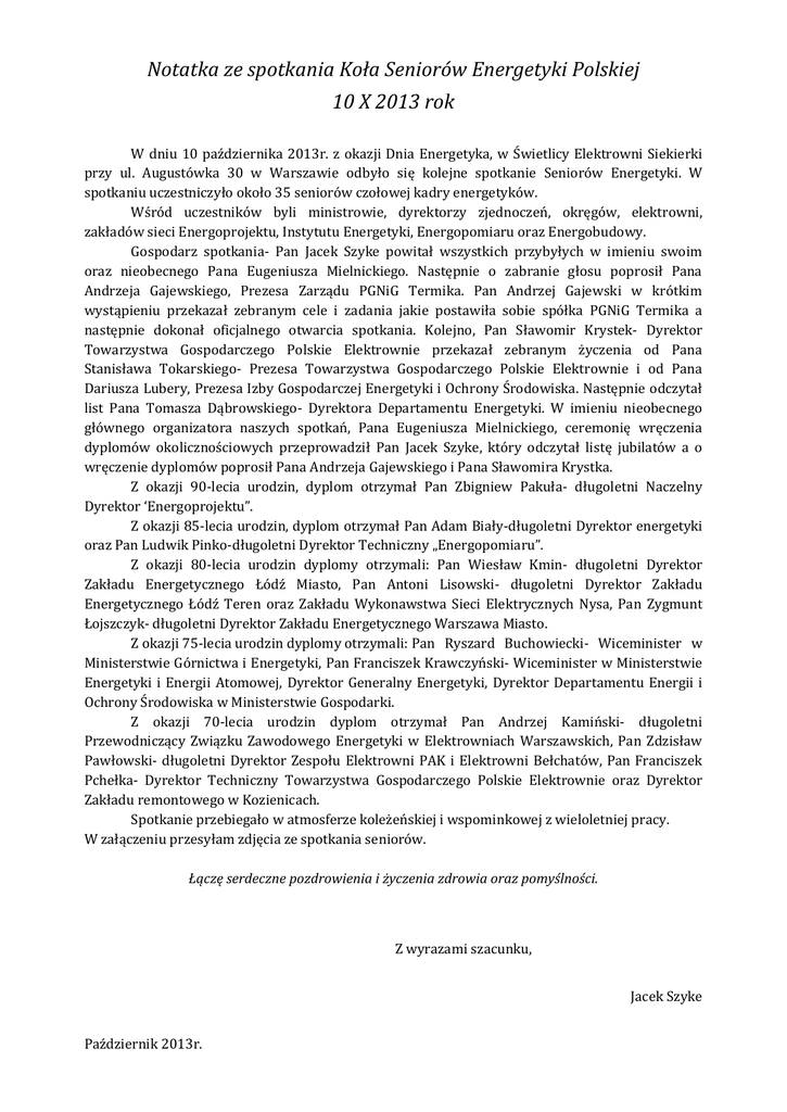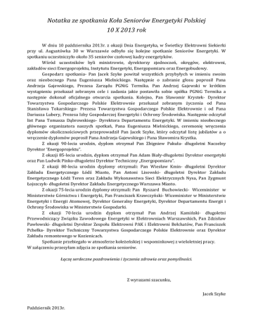 Notatka ze spotkania Koła Seniorów Energetyki Polskiej 10 X 2013 rok W dniu 10 października 2013r. z okazji Dnia Energetyka, w Świetlicy Elektrowni Siekierki przy ul. Augustówka 30 w Warszawie odbyło się kolejne spotkanie Seniorów Energetyki. W spotkaniu uczestniczyło około 35 seniorów czołowej kadry energetyków. Wśród uczestników byli ministrowie, dyrektorzy zjednoczeń, okręgów, elektrowni, zakładów sieci Energoprojektu, Instytutu Energetyki, Energopomiaru oraz Energobudowy. Gospodarz spotkania- Pan Jacek Szyke powitał wszystkich przybyłych w imieniu swoim oraz nieobecnego Pana Eugeniusza Mielnickiego. Następnie o zabranie głosu poprosił Pana Andrzeja Gajewskiego, Prezesa Zarządu PGNiG Termika. Pan Andrzej Gajewski w krótkim wystąpieniu przekazał zebranym cele i zadania jakie postawiła sobie spółka PGNiG Termika a następnie dokonał oficjalnego otwarcia spotkania. Kolejno, Pan Sławomir Krystek- Dyrektor Towarzystwa Gospodarczego Polskie Elektrownie przekazał zebranym życzenia od Pana Stanisława Tokarskiego- Prezesa Towarzystwa Gospodarczego Polskie Elektrownie i od Pana Dariusza Lubery, Prezesa Izby Gospodarczej Energetyki i Ochrony Środowiska. Następnie odczytał list Pana Tomasza Dąbrowskiego- Dyrektora Departamentu Energetyki. W imieniu nieobecnego głównego organizatora naszych spotkań, Pana Eugeniusza Mielnickiego, ceremonię wręczenia dyplomów okolicznościowych przeprowadził Pan Jacek Szyke, który odczytał listę jubilatów a o wręczenie dyplomów poprosił Pana Andrzeja Gajewskiego i Pana Sławomira Krystka. Z okazji 90-lecia urodzin, dyplom otrzymał Pan Zbigniew Pakuła- długoletni Naczelny Dyrektor ‘Energoprojektu”. Z okazji 85-lecia urodzin, dyplom otrzymał Pan Adam Biały-długoletni Dyrektor energetyki oraz Pan Ludwik Pinko-długoletni Dyrektor Techniczny „Energopomiaru”. Z okazji 80-lecia urodzin dyplomy otrzymali: Pan Wiesław Kmin- długoletni Dyrektor Zakładu Energetycznego Łódź Miasto, Pan Antoni Lisowski- długoletni Dyrektor Zakładu Energetycznego Łódź Teren oraz Zakładu Wykonawstwa Sieci Elektrycznych Nysa, Pan Zygmunt Łojszczyk- długoletni Dyrektor Zakładu Energetycznego Warszawa Miasto. Z okazji 75-lecia urodzin dyplomy otrzymali: Pan Ryszard Buchowiecki- Wiceminister w Ministerstwie Górnictwa i Energetyki, Pan Franciszek Krawczyński- Wiceminister w Ministerstwie Energetyki i Energii Atomowej, Dyrektor Generalny Energetyki, Dyrektor Departamentu Energii i Ochrony Środowiska w Ministerstwie Gospodarki. Z okazji 70-lecia urodzin dyplom otrzymał Pan Andrzej Kamiński- długoletni Przewodniczący Związku Zawodowego Energetyki w Elektrowniach Warszawskich, Pan Zdzisław Pawłowski- długoletni Dyrektor Zespołu Elektrowni PAK i Elektrowni Bełchatów, Pan Franciszek Pchełka- Dyrektor Techniczny Towarzystwa Gospodarczego Polskie Elektrownie oraz Dyrektor Zakładu remontowego w Kozienicach. Spotkanie przebiegało w atmosferze koleżeńskiej i wspominkowej z wieloletniej pracy. W załączeniu przesyłam zdjęcia ze spotkania seniorów. Łączę serdeczne pozdrowienia i życzenia zdrowia oraz pomyślności. Z wyrazami szacunku, Jacek Szyke Październik 2013r.
