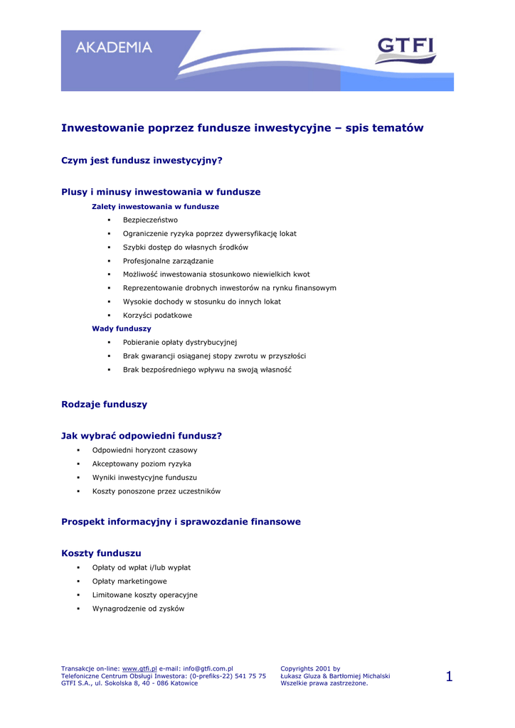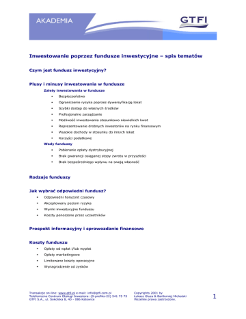 Inwestowanie poprzez fundusze inwestycyjne – spis tematów Czym jest fundusz inwestycyjny? Plusy i minusy inwestowania w fundusze Zalety inwestowania w fundusze Bezpieczeństwo Ograniczenie ryzyka poprzez dywersyfikację lokat Szybki dostęp do własnych środków Profesjonalne zarządzanie Możliwość inwestowania stosunkowo niewielkich kwot Reprezentowanie drobnych inwestorów na rynku finansowym Wysokie dochody w stosunku do innych lokat Korzyści podatkowe Wady funduszy Pobieranie opłaty dystrybucyjnej Brak gwarancji osiąganej stopy zwrotu w przyszłości Brak bezpośredniego wpływu na swoją własność Rodzaje funduszy Jak wybrać odpowiedni fundusz? Odpowiedni horyzont czasowy Akceptowany poziom ryzyka Wyniki inwestycyjne funduszu Koszty ponoszone przez uczestników Prospekt informacyjny i sprawozdanie finansowe Koszty funduszu Opłaty od wpłat i/lub wypłat Opłaty marketingowe Limitowane koszty operacyjne Wynagrodzenie od zysków Transakcje on-line: www.gtfi.pl e-mail: [email protected] Telefoniczne Centrum Obsługi Inwestora: (0-prefiks-22) 541 75 75 GTFI S.A., ul. Sokolska 8, 40 - 086 Katowice Copyrights 2001 by Łukasz Gluza & Bartłomiej Michalski Wszelkie prawa zastrzeżone. 1 Czym jest fundusz inwestycyjny? Fundusz inwestycyjny (dawniej fundusz powierniczy) to podmiot finansowy zajmujący się lokowaniem środków powierzonych mu przez inwestorów. Fundusze inwestycyjne są tworzone przez towarzystwa funduszy inwestycyjnych, które będąc ich organami zarządzają nimi i reprezentują w stosunkach z osobami trzecimi. W zamian za wpłaty do funduszu inwestorzy otrzymują w zależności od rodzaju funduszu jednostki uczestnictwa lub certyfikaty inwestycyjne. Zmiany wartości jednostek lub certyfikatów, które można na bieżąco obserwować w gazetach lub na internetowych stronach finansowych pokazują, jak zmienia się wartość zainwestowanych środków. Zakończenie inwestycji odbywa się poprzez zbycie jednostek uczestnictwa funduszowi lub sprzedaż certyfikatów inwestycyjnych na giełdzie. Tak jest w przypadku funduszy tezauryzujących, czyli reinwestujących na bieżąco wszystkie dochody funduszu. Istnieją również fundusze dywidendowe, które mogą wypłacać swoim uczestnikom dochody bez odkupywania jednostek uczestnictwa lub wykupywania certyfikatów inwestycyjnych. Podstawową kwestią w przypadku funduszy inwestycyjnych jest fakt, iż ich działalność jest ściśle określona przez przepisy prawne – ustawę o funduszach inwestycyjnych wraz z odpowiednimi rozporządzeniami. Ma to duże znaczenie dla bezpieczeństwa powierzonych środków. Po pierwsze, fundusz stanowi odrębną masę majątkową w stosunku do towarzystwa, które go utworzyło. W przypadku ewentualnych kłopotów finansowych towarzystwa środki inwestorów nie są zagrożone, gdyż nie wchodzą w skład jego majątku. Po drugie, działalność inwestycyjna funduszu jest poddana wielu ograniczeniom ustawowym, co m.in. zapobiega podejmowaniu nadmiernego ryzyka przez zarządzających. Po trzecie, nad działalnością funduszy inwestycyjnych stały nadzór sprawuje Komisja Papierów Wartościowych i Giełd. Ma on postać obowiązku przekazywania Komisji okresowych sprawozdań i bieżących informacji, dotyczących działalności i sytuacji finansowej funduszy oraz możliwości dokonywania przez Komisję kontroli w siedzibie funduszu. W krajach o rozwiniętych rynkach finansowych fundusze inwestycyjne stanowią bardzo ważną część systemu finansowego. Przykładowo w Stanach Zjednoczonych jest ponad 5 tysięcy różnego rodzaju funduszy, których łączne aktywa liczone są w bilionach dolarów. W Polsce obecnie jest ich obecnie 100, a łączne aktywa wynoszą około 11,9 mld złotych na koniec 2001 roku. Plusy i minusy inwestowania w fundusze Do podstawowych zalet inwestowania w fundusze inwestycyjne należą: Bezpieczeństwo, Ograniczenie ryzyka poprzez dywersyfikację lokat, Szybki dostęp do własnych środków, Profesjonalne zarządzanie, Możliwość inwestowania stosunkowo niewielkich kwot, Reprezentowanie inwestorów na rynku finansowym, Wysokie dochody w stosunku do innych lokat, Korzyści podatkowe. Transakcje on-line: www.gtfi.pl e-mail: [email protected] Telefoniczne Centrum Obsługi Inwestora: (0-prefiks-22) 541 75 75 GTFI S.A., ul. Sokolska 8, 40 - 086 Katowice Copyrights 2001 by Łukasz Gluza & Bartłomiej Michalski Wszelkie prawa zastrzeżone. 2 Bezpieczeństwo Rygory prawne, jakim podlegają fundusze inwestycyjne powodują, że bankructwo funduszu jest praktycznie niemożliwe. Co więcej bankructwo towarzystwa funduszy inwestycyjnych, które zarządza funduszem lub banku depozytariusza, w którym przechowywane są aktywa funduszu nie stanowi zagrożenia dla uczestników funduszu, gdyż (inaczej niż np. w bankach) majątek funduszu nie wchodzi w skład tzw. masy upadłościowej, czyli nie może być użyty do zaspokojenia długów wobec wierzycieli banku lub towarzystwa. Dodatkowo bankiem depozytariuszem może zostać wyłącznie renomowany bank, dysponujący odpowiednio wysokim kapitałem własnym, a towarzystwo funduszy inwestycyjnych podlega surowemu nadzorowi ze strony Komisji Papierów Wartościowych i Giełd, która dba o interes uczestników funduszu, między innymi poprzez monitorowanie sytuacji finansowej towarzystwa. W drastycznych przypadkach komisja może nawet cofnąć towarzystwu zezwolenie na prowadzenie działalności. Wyeliminowanie ryzyka bankructwa nie chroni oczywiście uczestnika przed wszelkim ryzykiem. Przepisy prawne nie zabezpieczają przed błędami popełnionymi przez zarządzających funduszem oraz ryzykiem charakterystycznym dla lokat funduszu (tzw. ryzykiem inwestycyjnym). Czynniki ryzyka są szczegółowo opisane w statucie każdego funduszu. Ograniczenie ryzyka poprzez dywersyfikację lokat Fundusz inwestycyjny gromadzi oszczędności bardzo wielu uczestników, dzięki czemu może łatwo (i tanio) inwestować posiadane środki w wiele r