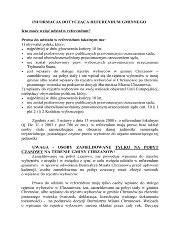 INFORMACJA DOTYCZĄCA REFERENDUM GMINNEGO Kto może wziąć udział w referendum? Prawo do udziału w referendum lokalnym ma: 1) obywatel polski, który: najpóźniej w dniu głosowania kończy 18 lat, nie został pozbawiony praw publicznych prawomocnym orzeczeniem sądu, nie został ubezwłasnowolniony prawomocnym orzeczeniem sądu, nie został pozbawiony praw wyborczych prawomocnym orzeczeniem Trybunału Stanu, jest wpisany do stałego rejestru wyborców w gminie Chrzanów – zameldowany na pobyt stały i nie wpisał się do rejestru wyborców w innej gminie albo został wpisany do rejestru wyborców w Chrzanowie po złożeniu pisemnego wniosku na podstawie decyzji Burmistrza Miasta Chrzanowa; 2) wpisany do rejestru wyborców na swój wniosek obywatel Unii Europejskiej, niebędący obywatelem polskim, który: najpóźniej w dniu głosowania kończy 18 lat, nie został pozbawiony praw publicznych prawomocnym orzeczeniem sądu, nie został ubezwłasnowolniony prawomocnym orzeczeniem sądu (art. 10 § 1 pkt 2 i § 2 Kodeksu wyborczego). Zgodnie z art. 3 ustawy z dnia 15 września 2000 r. o referendum lokalnym (tj. Dz. U. z 2003 r. poz 706 ze zm.) w referendum mają prawo brać udział osoby stale zamieszkujące na obszarze danej jednostki samorządu terytorialnego, posiadające czynne prawo wyborcze do organu stanowiącego tej jednostki UWAGA - OSOBY ZAMELDOWANE TYLKO NA POBYT CZASOWY NA TERENIE GMINY CHRZANÓW: Zameldowanie na pobyt czasowy, nie powoduje wpisania do rejestru wyborców z urzędu i w związku z tym, w celu wzięcia udziału w referendum gminnym w sprawie odwołania Burmistrza Miasta Chrzanowa przed upływem kadencji, osoba zameldowana na pobyt czasowy musi złożyć wniosek o wpisanie do rejestru wyborców. Prawo do udziału w referendum mają tylko osoby wpisane do stałego rejestru wyborców w Chrzanowie, tzn. zameldowane na pobyt stały w gminie Chrzanów, albo wpisane do rejestru wyborców w gminie Chrzanów po złożeniu pisemnego wniosku (wniosek, deklaracja, kserokopia ważnego dokumentu tożsamości) - na podstawie decyzji Burmistrza Miasta Chrzanowa. Wniosek o wpisanie do rejestru wyborców można składać przez cały rok. Decyzję o wpisaniu lub odmowie wpisania do stałego rejestru wyborców Burmistrz Miasta Chrzanowa wydaje w terminie 3 dni od dnia wniesienia wniosku. W referendum lokalnym można GŁOSOWAĆ KORESPONDENCYJNIE: Dotyczy to tylko osób niepełnosprawnych o znacznym lub umiarkowanym stopniu niepełnosprawności (orzeczenie o niepełnosprawności należy dołączyć do zgłoszenia zamiaru głosowania korespondencyjnego); w tym przy użyciu nakładki na kartę do głosowania sporządzonej w alfabecie Braille'a - wniosek należy złożyć do 28 listopada 2015r. W referendum lokalnym można GŁOSOWAĆ PRZEZ PEŁNOMOCNIKA: Przez pełnomocnika mogą głosować osoby niepełnosprawne o znacznym lub umiarkowanym stopniu niepełnosprawności oraz osoby, które najpóźniej w dniu głosowania kończą 75 lat. (Pełnomocnikiem może być tylko osoba wpisana do rejestru wyborców w gminie Chrzanów ) – wniosek należy złożyć do 4 grudnia 2015 r. W referendum lokalnym można dopisać się do spisu wyborców w wybranym przez siebie obwodzie głosowania - dotyczy to tylko osób, które są zameldowanie na pobyt stały na terenie gminy Chrzanów lub wpisane są do stałego rejestru wyborców - wniosek należy złożyć do 8 grudnia 2015 r. Nie ma możliwości głosowania w referendum lokalnym poza granicami miasta ani poza granicami kraju.