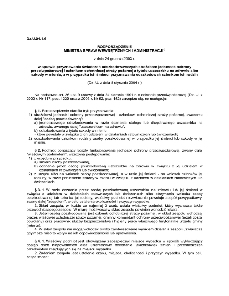 Dz.U.04.1.6 ROZPORZĄDZENIE MINISTRA SPRAW WEWNĘTRZNYCH I ADMINISTRACJI1) z dnia 24 grudnia 2003 r. w sprawie przyznawania świadczeń odszkodowawczych strażakom jednostek ochrony przeciwpożarowej i członkom ochotniczej straży pożarnej z tytułu uszczerbku na zdrowiu albo szkody w mieniu, a w przypadku ich śmierci przyznawania odszkodowań członkom ich rodzin (Dz. U. z dnia 8 stycznia 2004 r.) Na podstawie art. 26 ust. 9 ustawy z dnia 24 sierpnia 1991 r. o ochronie przeciwpożarowej (Dz. U. z 2002 r. Nr 147, poz. 1229 oraz z 2003 r. Nr 52, poz. 452) zarządza się, co następuje: § 1. Rozporządzenie określa tryb przyznawania: 1) strażakowi jednostki ochrony przeciwpożarowej i członkowi ochotniczej straży pożarnej, zwanemu dalej "osobą poszkodowaną": a) jednorazowego odszkodowania w razie doznania stałego lub długotrwałego uszczerbku na zdrowiu, zwanego dalej "uszczerbkiem na zdrowiu", b) odszkodowania z tytułu szkody w mieniu - które powstały w związku z ich udziałem w działaniach ratowniczych lub ćwiczeniach; 2) odszkodowania członkom rodziny osoby poszkodowanej w przypadku jej śmierci lub szkody w jej mieniu. § 2. Podmiot ponoszący koszty funkcjonowania jednostki ochrony przeciwpożarowej, zwany dalej "właściwym podmiotem", wszczyna postępowanie: 1) z urzędu w przypadku: a) śmierci osoby poszkodowanej, b) doznania przez osobę poszkodowaną uszczerbku na zdrowiu w związku z jej udziałem w działaniach ratowniczych lub ćwiczeniach; 2) z urzędu albo na wniosek osoby poszkodowanej, a w razie jej śmierci - na wniosek członków jej rodziny, w razie poniesienia szkody w mieniu w związku z udziałem w działaniach ratowniczych lub ćwiczeniach. § 3. 1. W razie doznania przez osobę poszkodowaną uszczerbku na zdrowiu lub jej śmierci w związku z udziałem w działaniach ratowniczych lub ćwiczeniach albo otrzymania wniosku osoby poszkodowanej lub członka jej rodziny, właściwy podmiot niezwłocznie powołuje zespół powypadkowy, zwany dalej "zespołem", w celu ustalenia okoliczności i przyczyn wypadku. 2. Skład zespołu, w liczbie co najmniej 3 osób, ustala właściwy podmiot, który wyznacza także przewodniczącego zespołu. W miarę możliwości w skład zespołu powinien wchodzić lekarz. 3. Jeżeli osobą poszkodowaną jest członek ochotniczej straży pożarnej, w skład zespołu wchodzą: prezes właściwej ochotniczej straży pożarnej, gminny komendant ochrony przeciwpożarowej (jeżeli został powołany) oraz pracownik służby bezpieczeństwa i higieny pracy właściwego terytorialnie urzędu gminy (miasta). 4. W skład zespołu nie mogą wchodzić osoby zainteresowane wynikiem działania zespołu, zwłaszcza gdy może mieć to wpływ na ich odpowiedzialność lub uprawnienia. § 4. 1. Właściwy podmiot jest obowiązany zabezpieczyć miejsce wypadku w sposób wykluczający dostęp osób niepowołanych oraz uniemożliwić dokonanie jakichkolwiek zmian i przemieszczeń przedmiotów znajdujących się na miejscu wypadku. 2. Zadaniem zespołu jest ustalenie czasu, miejsca, okoliczności i przyczyn wypadku. W tym celu zespół może: 1) 2) 3) 4) 5) 6) dokonać oględzin miejsca wypadku; sporządzić szkice lub wykonać fotografie miejsca wypadku; przeglądać dokumentację przeprowadzonej akcji ratowniczej lub ćwiczeń; przesłuchać osobę poszkodowaną, jeżeli jej stan zdrowia na to pozwala; przesłuchać świadków wypadku; zasięgać opinii lekarza, w miarę możliwości sprawującego opiekę medyczną nad osobą poszkodowaną, oraz, w razie potrzeby, innych specjalistów; 7) przeglądać akta postępowania karnego na zasadach określonych w przepisach o postępowaniu karnym; 8) zbierać inne dowody dotyczące wypadku. 3. Z oględzin miejsca wypadku oraz przesłuchania osoby poszkodowanej i świadków sporządza się protokoły. § 5. W razie poniesienia przez osobę poszkodowaną, w związku z jej udziałem w działaniach ratowniczych lub ćwiczeniach, szkody w mieniu polegającej na utracie, całkowitym zniszczeniu lub uszkodzeniu tego mienia, zespół jest obowiązany ustalić: 1) rodzaj mienia; 2) czy mienie zostało utracone, całkowicie zniszczone, czy też uszkodzone i w jakim stopniu; 3) stan mienia przed i po zaistnieniu wypadku (stopień jego zużycia) oraz wartość szkody. § 6. 1. Po ustaleniu okoliczności i przyczyn wypadku zespół sporządza protokół powypadkowy najpóźniej w ciągu 14 dni od dnia powołania. 2. Ustalenie okoliczności i przyczyn wypadku w terminie późniejszym niż określony w ust. 1, wskutek uzasadnionych przeszkód lub trudności, wymaga podania przyczyn tego opóźnienia w protokole powypadkowym. 3. Protokół powypadkowy zawiera w szczególności: 1) stopień, imię i nazwisko osoby poszkodowanej; 2) datę i miejsce wypadku; 3) opis okoliczności i przyczyn wypadku; 4) opis doznanych przez osobę poszkodowaną obrażeń lub podanie faktu jej śmierci; 5) ustalenia, o których mowa w § 5; 6) pouczenie o prawie zgłoszenia uwag i zastrzeżeń do ustaleń zawartych w protokole; 7) podpisy członków zespołu. 4. Opis doznanego przez osobę poszkodowaną uszczerbku na zdrowiu wpisuje się do protokołu powypadkowego na podstawie dokumentacji lekarskiej lub opinii lekarza. 5. Członek zespołu ma prawo złożyć do protokołu powypadkowego zdanie odrębne wraz z jego uzasadnieniem. 6. W przypadku rozbieżności zdań członków zespołu o treści protokołu powypadkowego decyduje przewodniczący zespołu. § 7. 1. Stwierdzenie w protokole powypadkowym, że doznany przez osobę poszkodowaną uszczerbek na zdrowiu lub jej śmierć albo powstanie szkody w mieniu nie ma związku z udziałem w akcji ratowniczej lub ćwiczeniach albo że zachodzą okoliczności, które mogą mieć wpływ na prawo osoby poszkodowanej do odszkodowania, wymaga szczegółowego uzasadnienia i wskazania dowodów stanowiących podstawę takiego stwierdzenia. 2. Osoba poszkodowana, a w razie jej śmierci - członkowie r
