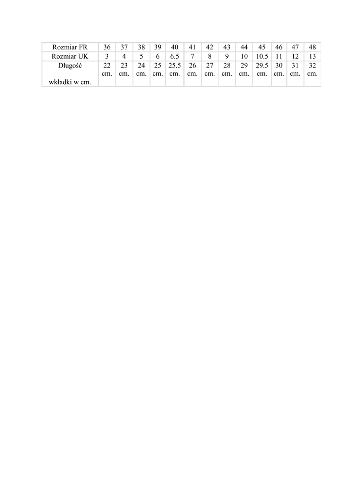 Rozmiar FR Rozmiar UK Długość wkładki w cm. 36 37 38 39 40 41 42 43 44 45 46 47 48 3 4 5 6 6.5 7 8 9 10 10.5 11 12 13 22 23 24 25 25.5 26 27 28 29 29.5 30 31 32 cm. cm. cm. cm. cm. cm. cm. cm. cm. cm. cm. cm. cm.