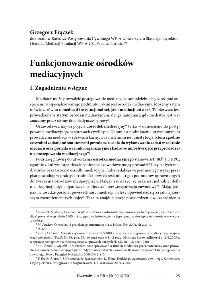 Grzegorz Frączek doktorant w Katedrze Postępowania Cywilnego WPiA Uniwersytetu Śląskiego; dyrektor Ośrodka Mediacji Fundacji WPiA UŚ „Facultas Iuridica”1 Funkcjonowanie ośrodków mediacyjnych I. Zagadnienia wstępne Mediator może prowadzić postępowanie mediacyjne samodzielnie bądź też pod auspicjami wyspecjalizowanego podmiotu, jakim jest ośrodek mediacyjny. Możemy zatem mówić zarówno o mediacji instytucjonalnej, jak i mediacji ad hoc 2. Ta pierwsza jest prowadzona w stałym ośrodku mediacyjnym, druga natomiast, gdy mediator jest wyznaczony przez strony do pojedynczej sprawy3. Ustawodawca używa pojęcia „ośrodek mediacyjny” tylko w odniesieniu do postępowania mediacyjnego w sprawach cywilnych. Natomiast podmiotem uprawnionym do prowadzenia mediacji w sprawach karnych i z nieletnimi jest „instytucja, która zgodnie ze swoimi zadaniami statutowymi powołana została do wykonywania zadań w zakresie mediacji oraz posiada warunki organizacyjne i kadrowe umożliwiające przeprowadzenie postępowania mediacyjnego”4. Podstawę prawną do utworzenia ośrodka mediacyjnego stanowi art. 1832 § 3 KPC, zgodnie z którym organizacje społeczne i zawodowe mogą prowadzić listy stałych mediatorów oraz tworzyć ośrodki mediacyjne. Taka redakcja wspomnianego wyżej przepisu powoduje w praktyce trudności przy określaniu kręgu podmiotów uprawnionych do tworzenia ośrodków mediacyjnych. Należy zauważyć, że brak jest jednolitej definicji legalnej pojęć „organizacja społeczna” oraz „organizacja zawodowa”5. Mając jednak na uwadze postulat powszechności mediacji, należy opowiedzieć się za jak najszerszym rozumieniem tych pojęć6. Teza ta znajduje swoje potwierdzenie w uzasadnieniu 1 Ośrodek Mediacji Fundacji Wydziału Prawa i Administracji Uniwersytetu Śląskiego „Facultas Iuridica” powstał w grudniu 2005 r. Szczegółowe informacje na jego temat są dostępne na stronie www.wpia. .us.edu.pl. 2 M. Pazdan, O mediacji i projekcie jej unormowania w Polsce, Rej. 2004, Nr 2, s. 16. 3 Ibidem. 4 Zob. § 1 i 3 rozp. Ministra Sprawiedliwości z 18.5.2001 r. w sprawie postępowania mediacyjnego w sprawach nieletnich (Dz.U. Nr 56, poz. 591 ze zm.) oraz § 1 i 2 rozp. Ministra Sprawiedliwości z 13.6.2003 r. w sprawie postępowania mediacyjnego w sprawach karnych (Dz.U. Nr 108, poz. 1020). 5 M. Cherka, J. Jagielski, Dopuszczalność sprawowania funkcji mediatora przez notariuszy oraz prowadzenia ośrodków mediacyjnych przez rady izb notarialnych – uwagi na tle nowelizacji kodeksu postępowania cywilnego, Nowy Przegląd Notarialny 2006, Nr 2, s. 7. 6 T. Ereciński (red.), J. Gudowski, M. Jędrzejewska, K. Weitz, Kodeks postępowania cywilnego. Komentarz. Część pierwsza. Postępowanie rozpoznawcze, t. I, Warszawa 2009, s. 518. Kwartalnik ADR • Nr 2(14)/2011 25 Frączek rządowego projekty ustawy z 20.8.2004 r., w którym mowa jest o prowadzeniu list „poza sądem”. Wydaje się, że można zatem uznać, iż w wymienionym przepisie chodzi o wszelkie organizacje pozasądowe7. Warto zwrócić uwagę, że najnowszy projekt nowelizacji Kodeksu postępowania cywilnego zakłada, iż ośrodki mediacyjne będą mogły być tworzone przez organizacje pozarządowe, w zakresie ich zadań statutowych, oraz uczelnie8. Z pewnością pozytywnie należy ocenić dopuszczenie uczelni do kręgu podmiotów uprawnionych do tworzenia ośrodków mediacyjnych. Jak zauważa T. Ereciński, odnosząc się do aktualnego stanu prawnego, nieuzasadnione jest ograniczenie możliwości tworzenia ośrodków mediacyjnych przy szkołach wyższych9. Należy podkreślić, że ustawodawca nie postawił żadnych wymogów, jakie miałby spełniać ośrodek mediacyjny. Odmiennie rzecz ma się w postępowaniu mediacyjnym w sprawach karnych, gdzie do prowadzenia postępowania mediacyjnego uprawniona jest instytucja, która m.in. zgodnie ze swoimi zadaniami statutowymi powołana została do wykonywania zadań w zakresie mediacji oraz posiada warunki organizacyjne i kadrowe umożliwiające przeprowadzenie postępowania mediacyjnego10. Biorąc pod uwagę fakt, że społeczeństwo polskie jest dopiero na etapie budowania zaufania do procedur mediacyjnych w zakresie rozwiązywania sporów, ośrodki mediacyjne powinny spełniać wysokie standardy. II. Lista stałych mediatorów ośrodka mediacyjnego Podstawowym źródłem informacji dla stron oraz sądu o osobach świadczących usługi mediacyjne jest lista stałych mediatorów. W zależności od tego, czy mamy do czynienia z mediatorem wpisanym na listę, należy mówić o stałym mediatorze bądź mediatorze ad hoc. Trzeba zwrócić uwagę na różnicę w sytuacji procesowej zachodzącą między tymi sytuacjami. Stały mediator może odmówić prowadzenia mediacji tylko z ważnych powodów, o których jest obowiązany powiadomić strony, a także sąd, gdy ten skierował strony do mediacji. Mediator ad hoc może natomiast odmówić prowadzania mediacji bez podania przyczyny. Jak już wspomniano, do prowadzenia list stałych mediatorów oraz tworzenia ośrodków mediacyjnych uprawnione są organizacje społeczne oraz zawodowe. W praktyce, istnieją organizacje, które prowadzą tylko listy stałych mediatorów, jak i takie które poza prowadzeniem list, utworzyły ośrodek mediacyjny. Z reguły ośrodek nie jest podmiotem zewnętrznym w stosunku do organizacji społecznej bądź zawodowej, która go utworzyła. Zazwyczaj stanowi jednostkę organizacyjną określonej organizacji społecznej lub 7 J. Bodio, T. Demendecki, A. Jakubecki (red.), O. Marcewicz, P. Telenga, M.P. Wójcik, Kodeks postępowania cywilnego. Komentarz, Warszawa 2008, s. 270. 8 Zob. projekt ustawy o zmianie ustawy – Kodeks postępowania cywilnego oraz niektórych innych ustaw przesłany pismem z 15.2.2011 r. celem rozpatrzenia na najbliższym posiedzeniu Stałego Komitetu Rady Ministrów, dostępny na stronie www.ms.gov.pl. 9 T. Ereciński (red.), op. cit., s. 518. 10 Zob. 