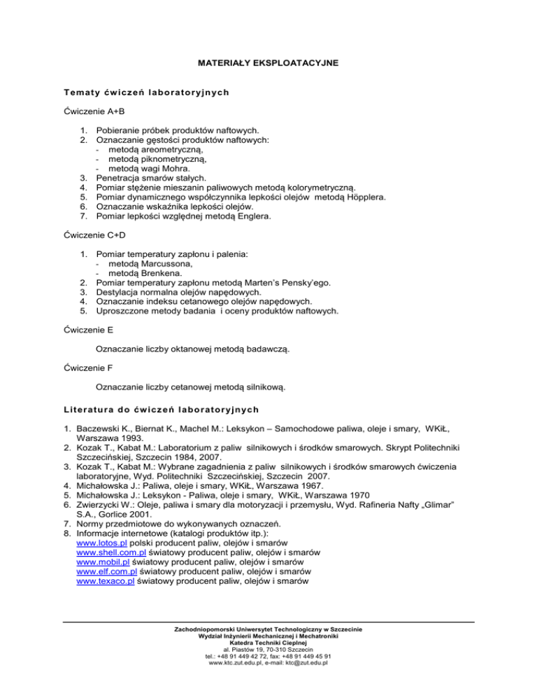 MATERIAŁY EKSPLOATACYJNE T emat y ćw icz eń l ab o ra t o r yjn yc h Ćwiczenie A+B 1. Pobieranie próbek produktów naftowych. 2. Oznaczanie gęstości produktów naftowych: - metodą areometryczną, - metodą piknometryczną, - metodą wagi Mohra. 3. Penetracja smarów stałych. 4. Pomiar stężenie mieszanin paliwowych metodą kolorymetryczną. 5. Pomiar dynamicznego współczynnika lepkości olejów metodą Höpplera. 6. Oznaczanie wskaźnika lepkości olejów. 7. Pomiar lepkości względnej metodą Englera. Ćwiczenie C+D 1. Pomiar temperatury zapłonu i palenia: - metodą Marcussona, - metodą Brenkena. 2. Pomiar temperatury zapłonu metodą Marten’s Pensky’ego. 3. Destylacja normalna olejów napędowych. 4. Oznaczanie indeksu cetanowego olejów napędowych. 5. Uproszczone metody badania i oceny produktów naftowych. Ćwiczenie E Oznaczanie liczby oktanowej metodą badawczą. Ćwiczenie F Oznaczanie liczby cetanowej metodą silnikową. L it er at u r a d o ćw icz e ń l ab o r at o r yjn yc h 1. Baczewski K., Biernat K., Machel M.: Leksykon – Samochodowe paliwa, oleje i smary, WKiŁ, Warszawa 1993. 2. Kozak T., Kabat M.: Laboratorium z paliw silnikowych i środków smarowych. Skrypt Politechniki Szczecińskiej, Szczecin 1984, 2007. 3. Kozak T., Kabat M.: Wybrane zagadnienia z paliw silnikowych i środków smarowych ćwiczenia laboratoryjne, Wyd. Politechniki Szczecińskiej, Szczecin 2007. 4. Michałowska J.: Paliwa, oleje i smary, WKiŁ, Warszawa 1967. 5. Michałowska J.: Leksykon - Paliwa, oleje i smary, WKiŁ, Warszawa 1970 6. Zwierzycki W.: Oleje, paliwa i smary dla motoryzacji i przemysłu, Wyd. Rafineria Nafty „Glimar” S.A., Gorlice 2001. 7. Normy przedmiotowe do wykonywanych oznaczeń. 8. Informacje internetowe (katalogi produktów itp.): www.lotos.pl polski producent paliw, olejów i smarów www.shell.com.pl światowy producent paliw, olejów i smarów www.mobil.pl światowy producent paliw, olejów i smarów www.elf.com.pl światowy producent paliw, olejów i smarów www.texaco.pl światowy producent paliw, olejów i smarów Zachodniopomorski Uniwersytet Technologiczny w Szczecinie Wydział Inżynierii Mechanicznej i Mechatroniki Katedra Techniki Cieplnej al. Piastów 19, 70-310 Szczecin tel.: +48 91 449 42 72, fax: +48 91 449 45 91 www.ktc.zut.edu.pl, e-mail: [email protected]