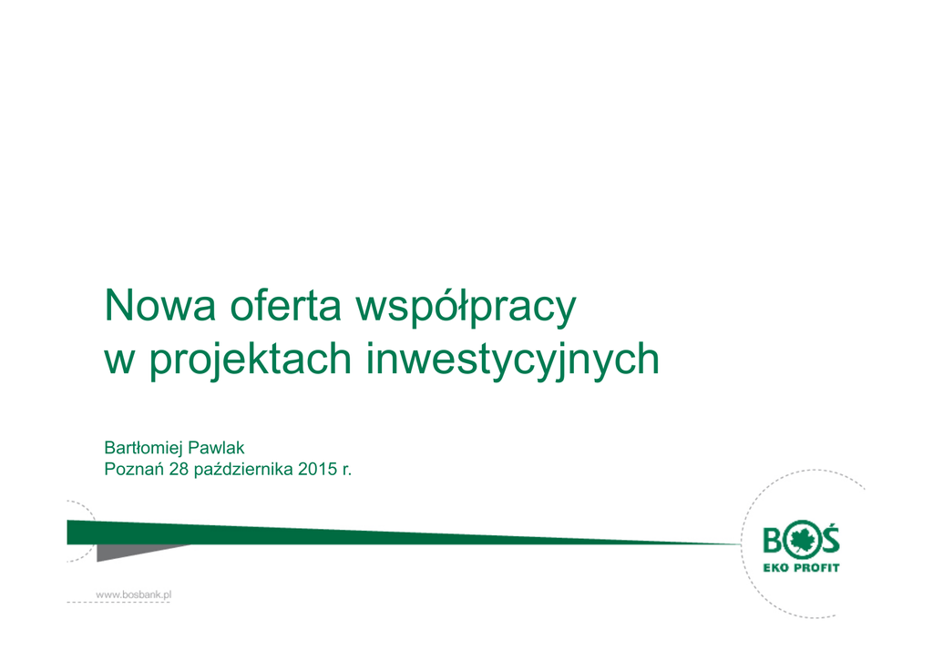 Nowa oferta współpracy w projektach inwestycyjnych Bartłomiej Pawlak Poznań 28 października 2015 r. Kim jesteśmy? Spółka BOŚ Eko Profit od 2009 r. zrealizowała ok dużych 40 projektów Nasze bezpośrednie inwestycje umożliwiły realizację projektów o wartości ponad 200 mln zł. Dzięki zorganizowanemu przez BEP finansowaniu dłużnemu powstały projekty o łącznej wartości ponad 2 mld zł. Tylko w roku 2014, w którym pomogliśmy finansować projekty OZE o łącznej mocy ponad 200 MW. Nasze zaangażowanie oraz relacje w branży bankowej, energetycznej – w tym energetyki cieplnej - usprawniają proces zarówno na etapie przygotowania, strukturyzacji finansowania oraz realizacji inwestycji. Kim jesteśmy? BOŚ Eko Profit S.A. jest spółką inwestycyjną, która rozszerza i uzupełnia ofertę Banku Ochrony Środowiska o: inwestycje kapitałowe, zarządzanie procesem, organizowanie finansowania, doradztwo biznesowe. Koncentrujemy się na inwestycjach w: czyste technologie, ochronę środowiska, odnawialne źródła energii. Nasza strategia dopuszcza inwestycje zapewniające rozwój przedsiębiorstw jak i w nowe projekty („start upy”). Kim jesteśmy? W zależności od oceny projektu, jego rodzaju oraz celu inwestycyjnego możemy pełnić funkcje: bezpośredniego inwestora, pośrednika finansowego, Uzupełnieniem działalności inwestycyjnej oraz pośrednictwa finansowego Spółki są usługi: doradztwa biznesowego: strukturyzacja finansowana, transakcji, poszukiwanie inwestora strategicznego, wyjście z inwestycji, wsparcia w pozyskiwaniu środków pomocowych, Doświadczenie – fabryka peletu DIN + Budowa zakładu produkcji paliwa drzewnego typu pelet wysokogatunkowy DIN + z modułem kogeneracyjnym Struktura finansowania: • Dotacja PARP - 28,3% • Kredyt inwestycyjny BOŚ (NIB) - 25,9% • Kredyt inwestycyjny BOŚ - 27,3% • Środki własne inwestora + BEP - 18,5% • Całkowity koszt inwestycji 77 mln złotych, • Inwestycja zakończona w 2013 r. Rola BOŚ Eko Profit: • strukturyzacja transakcji, • pośrednictwo w procesie pozyskania kredytu z BOŚ, • udzielenie pożyczki podporządkowanej, • przeprowadzenie procedury pozyskania firmy monitorującej realizację inwestycji. Inwestycja własna – farma wiatrowa 6 MW DEWELOPER PROJEKTU: RAPORT WIETRZNOŚCI: DOMREL Biuro Usług Inwestycyjnych Sp. z o.o. Anemos-Jacob GmbH DUE DILIGENCE TECHNICZNOPRAWNE: DUE DILIGENCE FINANSOWOKSIĘGOWE: W4E FK Partner Sp. z o.o. DORADZTWO PODATKOWE: RAPORT OTWARCIA: Axon Tax Sp. z o.o. Garrad Hassan GL INŻYNIER KONTRAKTU: MS WIND Sp. z o.o. (SPV) farma wiatrowa 6 MW DOMREL Biuro Usług Inwestycyjnych Sp. z o.o. PROJECT MONITOR: Garrad Hassan GL koszt inwestycji: 41 mln PLN Bezpieczna i pełna struktura realizacji Pełen zakres odpowiedzialności WYKONAWCA ROBÓT BUDOWLANYCH I DROGOWYCH: Przedsiębiorstwo Robót Inżynieryjnych i Mostowych PYLON Sp. z o.o., PBU KOPPI WYKONAWCA ROBÓT ELEKTRYCZNYCH : PKP Energetyka S.A. INŻYNIER KONTRAKTU: DOSTAWCA TURBIN: DOMREL Biuro Usług Inwestycyjnych Sp. z o.o. GAMESA Eolica S.L. Oferta dla MŚP: kapitał, kredyt, konsulting Dostarczamy kompleksowych rozwiązań zarówno w pozyskiwaniu finansowania (kapitał + kredyt), doradztwa biznesowego (przygotowanie biznes planu, wniosku kredytowego, utworzenie spółki celowej – SPV, optymalizacja kosztowa i podatkowa), jak i branżowego (organizacja całości procesów m.in.: przejmowania/zakupu projektów, budowy, itp.). Oferujemy: unikalną możliwość pozyskania kapitału dla rozpoczynających projekty inwestycyjne różnorodne formy finansowania: kredyt, kapitał, pożyczki podporządkowane oraz pożyczki konwertowane (mezzanine) innowacyjną ofertę pakietową 3K: kapitał + kredyt + konsulting szeroką wiedzę konsultingową; od biznesplanu po wyjście z inwestycji, od modelu zarządzania po strategię rozwoju możliwość skorzystania z bogatego doświadczenia w finansowaniu projektów ekologicznych Banku Ochrony Środowiska Czego oczekujemy od partnerów? potencjału rozwoju i dynamiki wzrostu projektów inwestycyjnych, potwierdzonych rzetelnym biznes-planem gotowości partnerów do ponoszenia wspólnej odpowiedzialności za inwestycje; tak w obszarze ryzyk, jak późniejszych benefitów doświadczenia w biznesie lub w dziedzinie wiedzy, w której partner chce dokonać inwestycji Oferta: pośrednictwo finansowe Pośrednictwo w zapewnieniu finansowania dłużnego dla projektów inwestycyjnych (kredyt komercyjny z banku/konsorcjum banków, analiza możliwości pozyskania finansowania preferencyjnego) w tym: przygotowujemy pełną dokumentację dla klienta wraz z przygotowaniem projekcji finansowych zgodnych ze standardami banku, dokonujemy wstępnej oceny projektu inwestycyjnego i dokonujemy jego strukturyzacji, co pozwala na oszczędność czasu i kosztów związanych z procesem przyznawania kredytu pomagamy zidentyfikować mocne strony projektu w zakresie udziału własnego oraz możliwych form zabezpieczenia kredytu prowadzimy negocjacje z bankami w wyżej wymienionych zakresach Kompleksowe oferty dla dużych podmiotów 2 czyli oferty „szyte na miarę”: BOŚ Eko Profit przygotowuje rozwiązania dostosowane do wymagań konkretnego klienta, np. koncernów energetycznych, zakładów energetyki cieplnej i firm zajmujących się dewelopowaniem projektów inwestycyjnych. Przedmiotem oferty jest przejęcie na siebie zarówno roli podmiotu organizującego finansowanie oraz roli zarządzającego projektem – od koncepcji, poprzez umowę, szczegółowo określającą warunki i zasady współpracy, aż po realizację/nadzór nad realizacją. Kompleksowa oferta Grupy Kapitałowej BOŚ dotyczy: analizy projektów organizacji procesu zapewnienia finansowania (kapitał + dług) nadzoru nad procesem Oferta dla JST oraz spółek komunalnych BOŚ Eko Profit identyfikuje duży potencjał w inwestycjach lokalnych, np.: rynek ciepłowniczy, efektywność energetyczna. Jesteśmy gotowi realizować i
