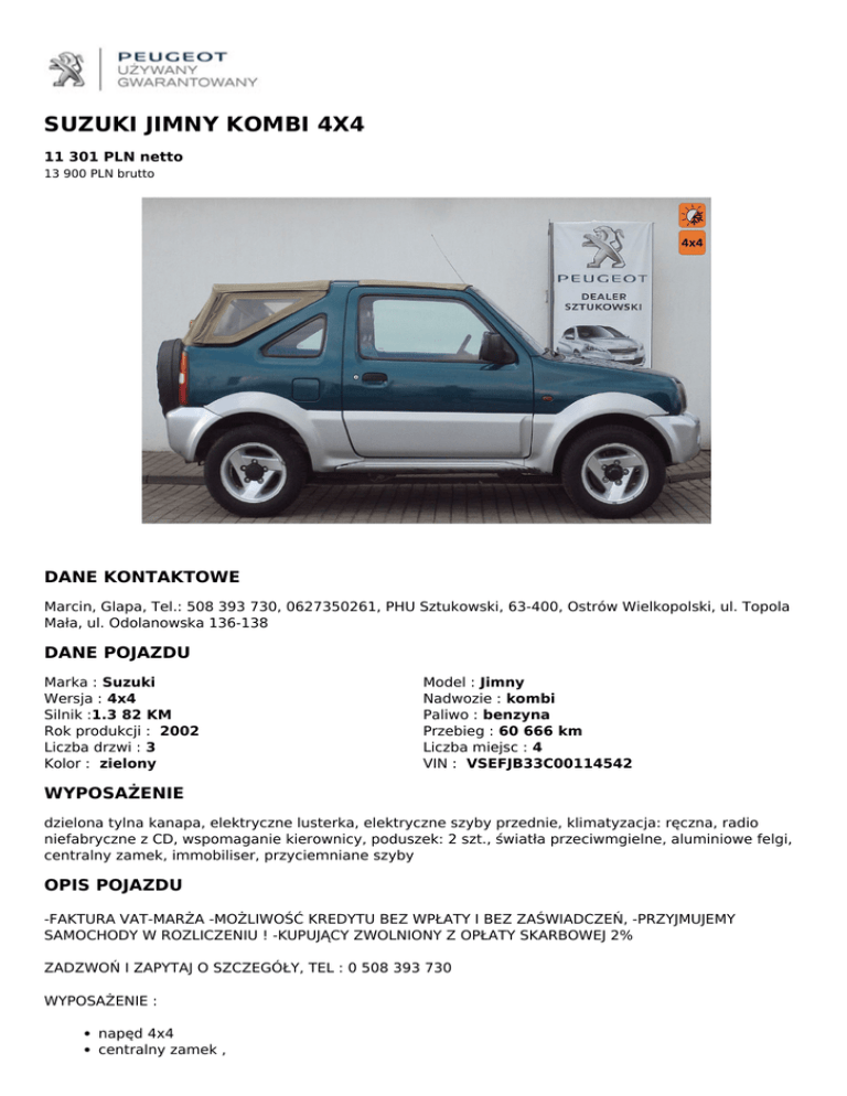 SUZUKI JIMNY KOMBI 4X4 11 301 PLN netto 13 900 PLN brutto DANE KONTAKTOWE Marcin, Glapa, Tel.: 508 393 730, 0627350261, PHU Sztukowski, 63-400, Ostrów Wielkopolski, ul. Topola Mała, ul. Odolanowska 136-138 DANE POJAZDU Marka : Suzuki Wersja : 4x4 Silnik :1.3 82 KM Rok produkcji : 2002 Liczba drzwi : 3 Kolor : zielony Model : Jimny Nadwozie : kombi Paliwo : benzyna Przebieg : 60 666 km Liczba miejsc : 4 VIN : VSEFJB33C00114542 WYPOSAŻENIE dzielona tylna kanapa, elektryczne lusterka, elektryczne szyby przednie, klimatyzacja: ręczna, radio niefabryczne z CD, wspomaganie kierownicy, poduszek: 2 szt., światła przeciwmgielne, aluminiowe felgi, centralny zamek, immobiliser, przyciemniane szyby OPIS POJAZDU -FAKTURA VAT-MARŻA -MOŻLIWOŚĆ KREDYTU BEZ WPŁATY I BEZ ZAŚWIADCZEŃ, -PRZYJMUJEMY SAMOCHODY W ROZLICZENIU ! -KUPUJĄCY ZWOLNIONY Z OPŁATY SKARBOWEJ 2% ZADZWOŃ I ZAPYTAJ O SZCZEGÓŁY, TEL : 0 508 393 730 WYPOSAŻENIE : napęd 4x4 centralny zamek , el. szyby, klimatyzacja , radio CD, wspomaganie kierownicy, 2 x poduszka powietrzna, ZADZWOŃ I ZAPYTAJ O SZCZEGÓŁY, TEL : 0 508 393 730 Dane zawarte w cenniku nie stanowią oferty w rozumieniu przepisów prawa polskiego. Treść ogłoszenia ma charakter wyłącznie informacyjny, w szczególności nie należy jej traktować jako wiążącego prawnie zobowiązania lub zapewnienia gwarancyjnego w rozumieniu art. 13. Ustawy z 27 lipca 2002 r. o szczególnych warunkach sprzedaży konsumenckiej – gwarancję stanowi wyłącznie dokument gwarancyjny wydany przez sprzedawcę.Zachęcamy do sprawdzenia samochodu przed zakupem i wykonania jazdy próbnej QR CODE DLA OGŁOSZENIA W SERWISIE UZYWANYGWARANTOWANY.PL Powered by TCPDF (www.tcpdf.org)