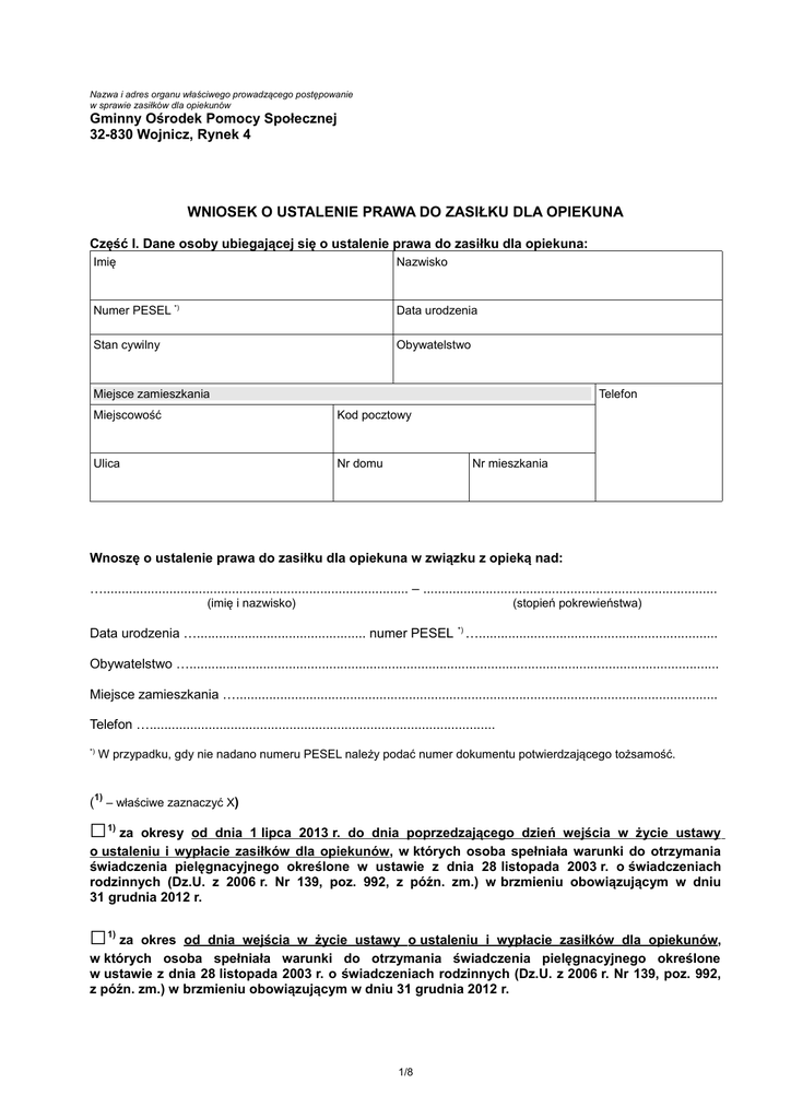 Nazwa i adres organu właściwego prowadzącego postępowanie w sprawie zasiłków dla opiekunów Gminny Ośrodek Pomocy Społecznej 32-830 Wojnicz, Rynek 4 WNIOSEK O USTALENIE PRAWA DO ZASIŁKU DLA OPIEKUNA Część I. Dane osoby ubiegającej się o ustalenie prawa do zasiłku dla opiekuna: Imię Nazwisko Numer PESEL *) Data urodzenia Stan cywilny Obywatelstwo Miejsce zamieszkania Telefon Miejscowość Kod pocztowy Ulica Nr domu Nr mieszkania Wnoszę o ustalenie prawa do zasiłku dla opiekuna w związku z opieką nad: …................................................................................... – ................................................................................ (imię i nazwisko) (stopień pokrewieństwa) Data urodzenia ….............................................. numer PESEL *) …................................................................. Obywatelstwo …................................................................................................................................................ Miejsce zamieszkania …................................................................................................................................... Telefon ….............................................................................................. *) W przypadku, gdy nie nadano numeru PESEL należy podać numer dokumentu potwierdzającego tożsamość. (1) – właściwe zaznaczyć X) □ 1) □ 1) za okresy od dnia 1 lipca 2013 r. do dnia poprzedzającego dzień wejścia w życie ustawy o ustaleniu i wypłacie zasiłków dla opiekunów, w których osoba spełniała warunki do otrzymania świadczenia pielęgnacyjnego określone w ustawie z dnia 28 listopada 2003 r. o świadczeniach rodzinnych (Dz.U. z 2006 r. Nr 139, poz. 992, z późn. zm.) w brzmieniu obowiązującym w dniu 31 grudnia 2012 r. za okres od dnia wejścia w życie ustawy o ustaleniu i wypłacie zasiłków dla opiekunów, w których osoba spełniała warunki do otrzymania świadczenia pielęgnacyjnego określone w ustawie z dnia 28 listopada 2003 r. o świadczeniach rodzinnych (Dz.U. z 2006 r. Nr 139, poz. 992, z późn. zm.) w brzmieniu obowiązującym w dniu 31 grudnia 2012 r. 1/8 Część II. Oświadczenia służące ustaleniu prawa do zasiłku dla opiekuna: Oświadczam, że w okresie od 1 lipca 2013 r. do dnia poprzedzającego dzień wejścia w życie ustawy o ustaleniu i wypłacie zasiłków dla opiekunów spełniałam / spełniałem warunki do otrzymania świadczenia pielęgnacyjnego na podstawie ustawy z dnia 28 listopada 2003 r. o świadczeniach rodzinnych (Dz.U. z 2006 r. Nr 139, poz. 992, z późn. zm.) w brzmieniu obowiązującym w dniu 31 grudnia 2012 r. Jestem świadomy odpowiedzialności karnej za złożenie fałszywego oświadczenia. ….................................................................. (data, podpis osoby ubiegającej się) Oświadczam, że w dniu składania wniosku o ustalenie prawa do zasiłku dla opiekuna spełniam warunki do otrzymania świadczenia pielęgnacyjnego na podstawie ustawy z dnia 28 listopada 2003 r. o świadczeniach rodzinnych (Dz.U. z 2006 r. Nr 139, poz. 992, z późn. zm.) w brzmieniu obowiązującym w dniu 31 grudnia 2012 r. Jestem świadomy odpowiedzialności karnej za złożenie fałszywego oświadczenia. ….................................................................. (data, podpis osoby ubiegającej się) Oświadczam, że: (1) – właściwe zaznaczyć X; * – niewłaściwe skreślić) a) powyższe dane są prawdziwe, b) zapoznałem(am) się z warunkami uprawniającymi do zasiłku dla opiekuna, c) w okresie od 01 lipca 2013 r. do dnia złożenia wniosku oraz w dniu składania wniosku: □ □ □ 1) nie mam ustalonego prawa do zasiłku dla opiekuna 1) mam ustalone prawo do zasiłku dla opiekuna za okres od …..………………… do ……..………………. 1) nie byłem / nie jestem* zatrudniony(a) ani nie wykonuję / wykonywałem(am) innej pracy zarobkowej (przez zatrudnienie lub wykonywanie innej pracy zarobkowej rozumie się: wykonywanie pracy na podstawie stosunku pracy, stosunku służbowego, umowy o pracę nakładczą oraz wykonywanie pracy lub świadczenie usług na podstawie umowy agencyjnej, umowy zlecenia, umowy o dzieło albo w okresie członkostwa w rolniczej spółdzielni produkcyjnej, spółdzielni kółek rolniczych lub spółdzielni usług rolniczych, a także prowadzenie pozarolniczej działalności gospodarczej), □ 1) □ 1) □ 1) jestem / byłem(am)* zatrudniony(a) i/lub wykonywałem(am) inną pracę zarobkową w okresie od ……………………….. do …..…………………, sprawuję / sprawowałem(am)* opiekę nad w/w osobą (wymienioną w cz. I wniosku) legitymującą się orzeczeniem o niepełnosprawności łącznie ze wskazaniami, o których mowa w art. 17 ust. 1 ustawy o świadczeniach rodzinnych lub orzeczeniem o znacznym stopniu niepełnosprawności nie sprawuję / nie sprawowałem(am)* opieki nad w/w osobą (wymienioną w cz. I wniosku) legitymującą się orzeczeniem o niepełnosprawności łącznie ze wskazaniami, o których mowa w art. 17 ust. 1 ustawy o świadczeniach rodzinnych lub orzeczeniem o znacznym stopniu niepełnosprawności w okresie od ……………………… do ………………………, 2/8 □ 1) □ 1) □ 1) □ 1) nie mam / nie miałem(am)* ustalonego prawa do emerytury, renty, renty rodzinnej z tytułu śmierci małżonka przyznanej w przypadku zbiegu prawa do renty rodzinnej i innego świadczenia emerytalno– rentowego, renty socjalnej, zasiłku stałego, nauczycielskiego świadczenia kompensacyjnego, zasiłku przedemerytalnego i świadczenia przedemerytalnego, mam / miałem(am)* ustalone prawo do emerytury, renty, renty rodzinnej z tytułu śmierci małżonka przyznanej w przypadku zbiegu prawa do renty rodzinnej i innego świadczenia emerytalno–rentowego, renty socjalnej, zasiłku stałego, nauczycielskiego świadczenia kompensacyjnego, 