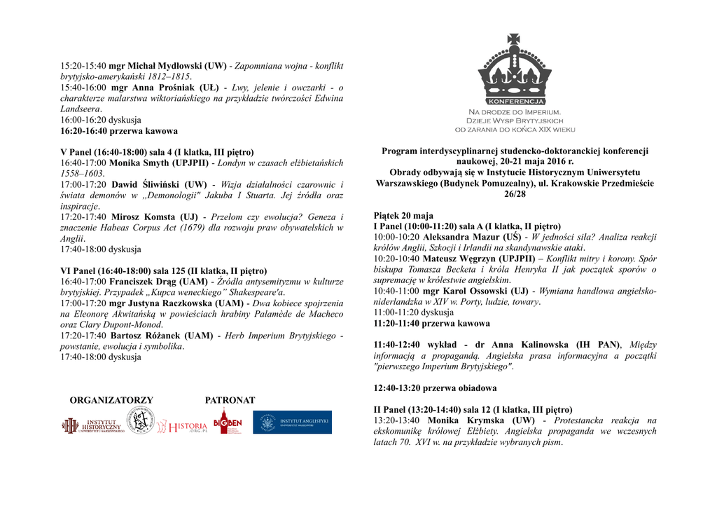 15:20-15:40 mgr Michał Mydłowski (UW) - Zapomniana wojna - konflikt brytyjsko-amerykański 1812–1815. 15:40-16:00 mgr Anna Prośniak (UŁ) - Lwy, jelenie i owczarki - o charakterze malarstwa wiktoriańskiego na przykładzie twórczości Edwina Landseera. 16:00-16:20 dyskusja 16:20-16:40 przerwa kawowa V Panel (16:40-18:00) sala 4 (I klatka, III piętro) 16:40-17:00 Monika Smyth (UPJPII) - Londyn w czasach elżbietańskich 1558–1603. 17:00-17:20 Dawid Śliwiński (UW) - Wizja działalności czarownic i świata demonów w ,,Demonologii" Jakuba I Stuarta. Jej źródła oraz inspiracje. 17:20-17:40 Mirosz Komsta (UJ) - Przełom czy ewolucja? Geneza i znaczenie Habeas Corpus Act (1679) dla rozwoju praw obywatelskich w Anglii. 17:40-18:00 dyskusja VI Panel (16:40-18:00) sala 125 (II klatka, II piętro) 16:40-17:00 Franciszek Drąg (UAM) - Źródła antysemityzmu w kulturze brytyjskiej. Przypadek „Kupca weneckiego” Shakespeare'a. 17:00-17:20 mgr Justyna Raczkowska (UAM) - Dwa kobiece spojrzenia na Eleonorę Akwitańską w powieściach hrabiny Palamède de Macheco oraz Clary Dupont-Monod. 17:20-17:40 Bartosz Różanek (UAM) - Herb Imperium Brytyjskiego powstanie, ewolucja i symbolika. 17:40-18:00 dyskusja Program interdyscyplinarnej studencko-doktoranckiej konferencji naukowej, 20-21 maja 2016 r. Obrady odbywają się w Instytucie Historycznym Uniwersytetu Warszawskiego (Budynek Pomuzealny), ul. Krakowskie Przedmieście 26/28 Piątek 20 maja I Panel (10:00-11:20) sala A (I klatka, II piętro) 10:00-10:20 Aleksandra Mazur (UŚ) - W jedności siła? Analiza reakcji królów Anglii, Szkocji i Irlandii na skandynawskie ataki. 10:20-10:40 Mateusz Węgrzyn (UPJPII) – Konflikt mitry i korony. Spór biskupa Tomasza Becketa i króla Henryka II jak początek sporów o supremację w królestwie angielskim. 10:40-11:00 mgr Karol Ossowski (UJ) - Wymiana handlowa angielskoniderlandzka w XIV w. Porty, ludzie, towary. 11:00-11:20 dyskusja 11:20-11:40 przerwa kawowa 11:40-12:40 wykład - dr Anna Kalinowska (IH PAN), Między informacją a propagandą. Angielska prasa informacyjna a początki "pierwszego Imperium Brytyjskiego". 12:40-13:20 przerwa obiadowa ORGANIZATORZY PATRONAT II Panel (13:20-14:40) sala 12 (I klatka, III piętro) 13:20-13:40 Monika Krymska (UW) - Protestancka reakcja na ekskomunikę królowej Elżbiety. Angielska propaganda we wczesnych latach 70. XVI w. na przykładzie wybranych pism. 13:40-14:00 Aleksandra Gajewska (UW) - Ustawodawstwo Parlamentu angielskiego po udaremnieniu Spisku Prochowego w 1605 r. jako przejaw antykatolickich działań w Anglii Jakuba I. 14:00-14:20 Przemysław Lewicki (UAM) - Królestwo bez królów - istota i znaczenie angielskiego Protektoratu (1653–1659) dla dziejów brytyjskiej państwowości. 14:20-14:40 dyskusja 14:40-15:00 przerwa kawowa III Panel (15:00-16:20) sala A (I klatka, II piętro) 15:00-15:20 mgr Adrian Wesołowski (UW) - Pojęcie filantropa w prewiktoriańskiej myśli brytyjskiej i jego transgresje. 15:20-15:40 Marta Michalska (UW) - Penny Dreadful. Groszowa literatura lat 30. i 40. XIX w. jako źródło do badania mentalności społeczeństwa początku epoki wiktoriańskiej. 15:40-16:00 Piotr Kruze (UW) - Brytyjskie metody likwidacji afrykańskiego oporu na przykładzie działań prowadzonych przeciwko plemieniu Nandi w 1905 i 1906 r. 16:00-16:20 Patryk Gacka (UW) - Kilka słów o zniesieniu niewolnictwa w Imperium Brytyjskim z perspektywy orzecznictwa i prawodawstwa angielskiego. 16:20-16:40 dyskusja Sobota 21 maja I Panel (10:00-11:40) sala 125 (II klatka, II piętro) 10:00-10:20 Klaudia Gumieniak (UW) - W pogoni za nowym światem ewolucja charakteru wypraw morskich Anglików w II poł. XVI i na początku XVII w. 10:20-10:40 Anna Czerwińska (UAM) – Nowa Zelandia jako kolonia brytyjska. Od wyprawy Cooka do Traktatu z Waitangi. 10:40-11:00 mgr Emil Hoff (UW) - Brytyjczycy w Egipcie – Egipt w Brytanii. 11:00-11:20 mgr Piotr Strzałkowski (UW) - Geneza i charakter brytyjskiego nieformalnego imperium w XIX w. Chinach. 11:20-11:40 dyskusja 11:40-12:00 przerwa kawowa II Panel (12:00-13:40) sala 4 (I klatka, III piętro) 12:00-12:20 Adam Lubocki (UG) - Rzeczywistość i wizja artystyczna, czyli „Makbet” Szekspira a prawda historyczna. 12:20-12:40 Maria Plucińska (UW) - Patrick Sellar a szkocka emigracja w pierwszej połowie XIX wieku. 12:40-13:00 mgr Daria Rzeczkowska (UAM) - Muzyka ludowa narodowa - tradycyjna. Wokół polityki tożsamości i ruchów odrodzeniowych w Irlandii XVIII i XIX w. 13:00-13:20 mgr Filip Walczyna (UW) - Emigranci irlandzcy w krajobrazie XIX-wiecznej Brytanii. 13:20-13:40 dyskusja 13:40-14:40 przerwa obiadowa III Panel (14:40-16:20) sala 4 (I klatka, III piętro) 14:40-15:00 Maciej Dawczyk (UŁ) - Św. Augustyn z Canterbury i jego misja chrystianizacyjna w Anglii. 15:00-15:20 Marcin Krasuski (UPH) - Rządy Wilhelma II Zdobywcy i dynastii normandzkiej fundamentem przyszłego imperium. 15:20-15:40 mgr Marcin Lichota (UPH) - Hadrian IV - jedyny Anglik na Tronie Piotrowym. 15:40-16:00 mgr Piotr Goltz (UW) - Angielskość i brytyjskość. Jana z Salisbury koncepcja tożsamości etnicznej w traktacie „Policraticus”. 16:00-16:20 dyskusja 16:20-16:40 przerwa kawowa IV Panel (14:40-16:20) sala 125 (II klatka, II piętro) 14:40-15:00 Justyna Białobrzeska (UW) - Na drodze ku rewolucji przemysłowej. Rola handlu bawełną dla rozwoju brytyjskiego przemysłu tekstylnego. 15:00-15:20 mgr Agnieszka Szarafin (UMK) - Little Boney kontra John Bull. Różne twarze Napoleona Bonaparte w angielskiej karykaturze.