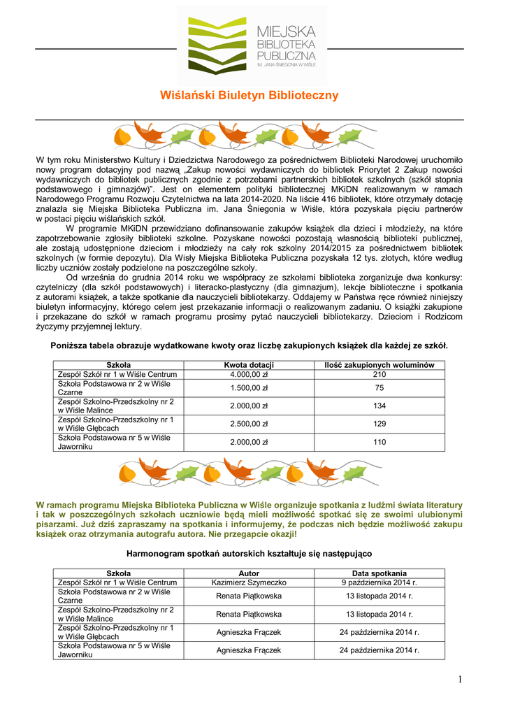 Wiślański Biuletyn Biblioteczny W tym roku Ministerstwo Kultury i Dziedzictwa Narodowego za pośrednictwem Biblioteki Narodowej uruchomiło nowy program dotacyjny pod nazwą „Zakup nowości wydawniczych do bibliotek Priorytet 2 Zakup nowości wydawniczych do bibliotek publicznych zgodnie z potrzebami partnerskich bibliotek szkolnych (szkół stopnia podstawowego i gimnazjów)”. Jest on elementem polityki bibliotecznej MKiDN realizowanym w ramach Narodowego Programu Rozwoju Czytelnictwa na lata 2014-2020. Na liście 416 bibliotek, które otrzymały dotację znalazła się Miejska Biblioteka Publiczna im. Jana Śniegonia w Wiśle, która pozyskała pięciu partnerów w postaci pięciu wiślańskich szkół. W programie MKiDN przewidziano dofinansowanie zakupów książek dla dzieci i młodzieży, na które zapotrzebowanie zgłosiły biblioteki szkolne. Pozyskane nowości pozostają własnością biblioteki publicznej, ale zostają udostępnione dzieciom i młodzieży na cały rok szkolny 2014/2015 za pośrednictwem bibliotek szkolnych (w formie depozytu). Dla Wisły Miejska Biblioteka Publiczna pozyskała 12 tys. złotych, które według liczby uczniów zostały podzielone na poszczególne szkoły. Od września do grudnia 2014 roku we współpracy ze szkołami biblioteka zorganizuje dwa konkursy: czytelniczy (dla szkół podstawowych) i literacko-plastyczny (dla gimnazjum), lekcje biblioteczne i spotkania z autorami książek, a także spotkanie dla nauczycieli bibliotekarzy. Oddajemy w Państwa ręce również niniejszy biuletyn informacyjny, którego celem jest przekazanie informacji o realizowanym zadaniu. O książki zakupione i przekazane do szkół w ramach programu prosimy pytać nauczycieli bibliotekarzy. Dzieciom i Rodzicom życzymy przyjemnej lektury. Poniższa tabela obrazuje wydatkowane kwoty oraz liczbę zakupionych książek dla każdej ze szkół. Szkoła Zespół Szkół nr 1 w Wiśle Centrum Szkoła Podstawowa nr 2 w Wiśle Czarne Zespół Szkolno-Przedszkolny nr 2 w Wiśle Malince Zespół Szkolno-Przedszkolny nr 1 w Wiśle Głębcach Szkoła Podstawowa nr 5 w Wiśle Jaworniku Kwota dotacji 4.000,00 zł Ilość zakupionych woluminów 210 1.500,00 zł 75 2.000,00 zł 134 2.500,00 zł 129 2.000,00 zł 110 W ramach programu Miejska Biblioteka Publiczna w Wiśle organizuje spotkania z ludźmi świata literatury i tak w poszczególnych szkołach uczniowie będą mieli możliwość spotkać się ze swoimi ulubionymi pisarzami. Już dziś zapraszamy na spotkania i informujemy, że podczas nich będzie możliwość zakupu książek oraz otrzymania autografu autora. Nie przegapcie okazji! Harmonogram spotkań autorskich kształtuje się następująco Szkoła Zespół Szkół nr 1 w Wiśle Centrum Szkoła Podstawowa nr 2 w Wiśle Czarne Zespół Szkolno-Przedszkolny nr 2 w Wiśle Malince Zespół Szkolno-Przedszkolny nr 1 w Wiśle Głębcach Szkoła Podstawowa nr 5 w Wiśle Jaworniku Autor Kazimierz Szymeczko Data spotkania 9 października 2014 r. Renata Piątkowska 13 listopada 2014 r. Renata Piątkowska 13 listopada 2014 r. Agnieszka Frączek 24 października 2014 r. Agnieszka Frączek 24 października 2014 r. 1 Poznajcie sylwetki pisarzy, z którymi wkrótce się spotkacie… Renata Piątkowska Ukończyła socjologię na Uniwersytecie Jagiellońskim, mieszka w Bielsku Białej, a jej pasją jest jazda konna. Książka „Wieloryb” jej autorstwa otrzymała Nagrodę Literacką im. Kornela Makuszyńskiego, a „Na wszystko jest sposób” II nagrodę w konkursie im. Astrid Lindgren. Trzy kolejne książki zostały wpisane na Złotą Listę Fundacji ABC XXI Cała Polska Czyta Dzieciom. Jest autorką miedzy innymi: „Opowiadań dla przedszkolaków”, „Opowiadań z piaskownicy”, „Nie ma nudnych dni”, „Z przysłowiami za pan brat”, „Przygoda ma kolor niebieski”. Za całokształt twórczości pisarka otrzymała Nagrodę im. Marii Weryho-Radziwiłłowicz przyznawaną przez miesięcznik „Bliżej Przedszkola”. Agnieszka Frączek Doktor habilitowana językoznawstwa, germanistka. Wykłada na Uniwersytecie Warszawskim. Specjalizuje się w dziedzinie leksykologii i leksykografii, jest autorką kilkudziesięciu prac z dziedziny językoznawstwa. Popularyzuje wiedzę o współczesnej polszczyźnie kierując szereg swych pozycji do najmłodszych czytelników. W wierszach opowiada o kulturze słowa i rozprawia się z błędami językowymi. Stworzyła także serię książek logopedycznych, m.in. „Dranie w tranie”, „Muł mądrala i innych wierszy co niemiara”. Jest laureatką Nagrody Edukacja 2008, wyróżnienia Duży Dong, przyznawanego przez Polską Sekcję IBBY oraz nagrody im. Marii Weryho-Radziwiłłowicz. Kazimierz Szymeczko Absolwent filologii polskiej na Uniwersytecie Śląskim. Był nauczycielem i doradcą szkolnych bibliotek. Z wykształcenia polonista, obecnie pracuje jako bibliotekarz. W 2013 roku zdobył Tytuł Ambasadora Polszczyzny Literatury Dziecięcej i Młodzieżowej. Laureat konkursu literackiego „Uwierz w siłę wyobraźni". Autor „Historii Polski w opowieściach”, „Pomolowanej historii…” i wielu opowiadań dla młodszych dzieci, które publikował między innymi w „Świerszczyku”. W 2011 jego powieść dla młodzieży „Czworo i kości” otrzymała nominację polskiej sekcji IBBY do nagrody Książka Roku. Chętnie odwiedza giełdy staroci, zbiera kubki i lampy naftowe, a w wolnym czasie grywa w RPG, szachy i koszykówkę. 2 Kochani uczniowie! Wasi nauczyciele bibliotekarze przygotowali dla Was recenzje książek, które warto przeczytać, a co najważniejsze, które są również dostępne w Waszych szkolnych bibliotekach. Katarzyna Majgier „Tajemnice pałacu. Duch z Niewiadomic” starego Lubicie duchy i tajemnice? A może dreszczyk emocji? Jeśli tak, to powieść Katarzyny Magier pod tytułem „Tajemnice starego pałacu. Duch z Niewadomic” z pewnością Was zainteresuje! Jest to książka przygodowa opowiadająca o