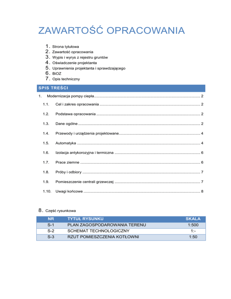 ZAWARTOŚĆ OPRACOWANIA 1. 2. 3. 4. 5. 6. 7. Strona tytułowa Zawartość opracowania Wypis i wyrys z rejestru gruntów Oświadczenie projektanta Uprawnienia projektanta i sprawdzającego BiOZ Opis techniczny SPIS TREŚCI 1. Modernizacja pompy ciepła ................................................................................................... 2 1.1. Cel i zakres opracowania .............................................................................................. 2 1.2. Podstawa opracowania ................................................................................................. 2 1.3. Dane ogólne .................................................................................................................. 2 1.4. Przewody i urządzenia projektowane............................................................................ 4 1.5. Automatyka ................................................................................................................... 4 1.6. Izolacja antykorozyjna i termiczna ................................................................................ 6 1.7. Prace ziemne ................................................................................................................ 6 1.8. Próby i odbiory .............................................................................................................. 7 1.9. Pomieszczenie centrali grzewczej ................................................................................ 7 1.10. Uwagi końcowe ............................................................................................................. 8 8. Część rysunkowa NR TYTUŁ RYSUNKU S-1 PLAN ZAGOSPODAROWANIA TERENU S-2 SCHEMAT TECHNOLOGICZNY S-3 RZUT POMIESZCZENIA KOTŁOWNI SKALA 1:500 1:1:50 1. MODERNIZACJA POMPY CIEPŁA 1.1. CEL I ZAKRES OPRACOW ANIA Celem opracowania jest modernizacja systemu z istniejącą pompą ciepła wykonanym w Wojewódzkim Szpitalu Psychiatrycznym w Gdańsku przy ul. Srebrniki 17. Modernizacja polega na budowie nowego dolnego źródła ciepła oraz zmianie technologii centrali grzewczej. 1.2. PODSTAW A OPRACOW ANIA • Zlecenie Inwestora; • Mapa sytuacyjno – wysokościowa skala 1:500; • Inwentaryzacja obecnej centrali grzewczej; • Projekt Robót Geologicznych; • Obowiązujące normy, ustawy, rozporządzenia, przepisy i literatura techniczna. 1.3. DANE OGÓLNE Obecnie źródłem ciepła w budynku nr 17 w Szpitalu Psychiatrycznym jest pompa ciepła wspomagana węzłem ciepłowniczym. Opracowanie obejmuje modernizację tego systemu wraz z przeprojektowaniem dolnego źródła. Zgodnie z projektem robót geologicznych jako dolne źródło zakłada się wykonanie 20 otworów wiertniczych, w których umieszczone zostaną wymienniki pionowe o głębokości 100 m. Dolne źródło będzie składać się z dwóch sekcji po 10 wymienników każda. Każda sekcja wyposażona będzie w studnię kolektorową serii ENERGEO typu NEW BRADO. Zład z układu solankowego z każdej studni kolektorowej wprowadzony zostanie parą rur do budynku na wysokości ok. 1 m nad posadzką (przejścia przez ścianę ASPOL 2 komplety ∅75/110 ). W celu zapewnienia możliwości zrównoważenia hydraulicznego układu, sekcje będą posiadały zawory odcinające oraz równoważące z przepływomierzami typu TACOSETTER. Połączone sekcje dolnego źródła będą podłączone do zestawu pompowego dedykowanego przez producenta do istniejącej pompy ciepła – zestaw SZB 1300E. Elementy wchodzące w skład zestawu zostały na rzucie oznaczone sufiksem –Z za oznaczeniem własnym. Odpowietrzanie obwodu dolnego źródła należy przewidzieć zarówno w studniach kolektorowych, jak i w pomieszczeniu centrali grzewczej. Wszystkie połączenia hydrauliczne z pompą ciepła należy wykonać poprzez kompensatory eliminujące przenoszenie się wibracji na rurarz centrali grzewczej. Czynnikiem grzewczym dolnego obiegu będzie glikol glicerynowy, którego karta katalogowa została załączona do projektu. Układ przygotowany jest do pracy w systemie grzania (parametry 5 25) oraz chłodzenia (parametry 10 30). Instalację zaprojektowano przy założeniu różnicy temperatur zasilania i powrotu dolnego źródła ciepła 2 równą 3. W obwodzie dolnego źródła zaprojektowano również układ do uzupełniania glikolu REFLEX FILLOCONTROL, do którego należy dodać niezbędne elementy, w tym zbiornik na solankę. Instalacja została zabezpieczona ciśnieniowo zaworem bezpieczeństwa oraz naczyniem wzbiorczym (elementy będące w składzie zestawu SZB 1300E) - dostosowane do pracy z glikolem. Na naczyniu wzbiorczym przystosowanym do pracy z glikolem należy ustawić ciśnienie robocze 1,5 bar, zawór bezpieczeństwa dostosowany do pracy z glikolem powinien się otworzyć przy ciśnieniu 3,0 bar. Pompę ciepła należy zabezpieczyć przed pracą przy zbyt niskim ciśnieniu w obwodzie solanki za pomocą dedykowanego przez producenta presostatu typu SWPR 500.Po stronie wtórnej pompy ciepła Dimplex SI 130 TUR+ projektowane są dwa obwody: 1- instalacji grzewczo-chłodniczej budynku, 2- instalacji ciepłej wody użytkowej. Do pierwszego z nich na zasilaniu włączony jest szeregowo istniejący bufor ciepła. Obieg grzewczo-chłodniczy połączony jest z pompą ciepła przez zawór czterodrogowy DIMPLEX VWU80, który odpowiednio kieruje przepływem czynnika w zależności od trybu pracy: ogrzewanie lub chłodzenie. W obwodzie grzewczo-chłodniczym znajduje się układ pompowy oraz naczynie wzbiorcze 35 l. W trybie ogrzewania instalacja pracuje z parametrami 55/45. Maksymalna przewidziana temperatura pracy wynosi 58 2. W trybie chłodzenia, którego uruchomienie planuje się w przyszłości wymagane będą parametry 7/12. Wyprowadzenia instalacji grzewczo-chłodniczej znajdują się w posadzce, gdzie modernizowaną instalację obwodu grzewczo-chłodniczego należy włączyć. Obwód przygotowania ciepłej wody użytkowej zaprojektowany zos