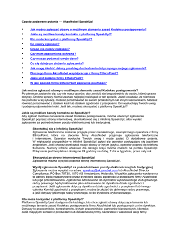 Często zadawane pytania — AkzoNobel SpeakUp! • • • • • • • • • • • • Jak można zgłaszać obawy o możliwym złamaniu zasad Kodeksu postępowania? Jakie są możliwe kanały kontaktu z platformą SpeakUp!? Kto może korzystać z platformy SpeakUp!? Co należy zgłaszać? Czego nie należy zgłaszać? Czy mam zapewnioną ochronę? Czy muszę podawać swoje dane? Co się dzieje po złożeniu zgłoszenia? Jak mogę śledzić dalszy przebieg dochodzenia dotyczącego mojego zgłoszenia? Dlaczego firma AkzoNobel współpracuje z firmą EthicsPoint? Jakie jest zadanie firmy EthicsPoint? W jaki sposób firma EthicsPoint zapewnia poufność? Jak można zgłaszać obawy o możliwym złamaniu zasad Kodeksu postępowania? Po pierwsze zastanów się, czy nie masz oporów, aby zwrócić się bezpośrednio do osoby, której sprawa dotyczy. Drobne sprawy niemal zawsze najlepiej rozwiązać w ten sposób. Jeżeli uważasz, że rozmowa nie pomoże w tej sytuacji, możesz porozmawiać ze swoim przełożonym lub innym kierownikiem. Możesz również porozmawiać z działem kadr lub działem zgodności z przepisami. Oni wysłuchają Twoich uwag i podejmą odpowiednie kroki. Jeśli tak, możesz skorzystać z platformy SpeakUp!? Jakie są możliwe kanały kontaktu ze SpeakUp!? Aby zgłosić możliwe naruszenia zasad Kodeksu postępowania, można utworzyć zgłoszenie SpeakUp! poprzez stronę internetową, skontaktować się z infolinią SpeakUp!, albo wysłać zgłoszenie za pośrednictwem poczty elektronicznej lub tradycyjnej. Skontaktuj się z infolinią SpeakUp! Zgłoszenie telefoniczne zostanie przyjęte przez niezależnego, zewnętrznego operatora z firmy EthicsPoint, która na zlecenie firmy AkzoNobel przyjmuje zgłoszenia telefoniczne i internetowe. Operator wysłucha Twoich uwag i może zadać Ci dodatkowe pytania. W większości przypadków w infolinii SpeakUp! zgłosi się operator posługujący się językiem angielskim. Jeśli chcesz przekazać swoje obawy w innym języku, operator poprosi do telefonu tłumacza. Numery infolinii właściwe dla danego kraju można znaleźć na portalu SpeakUp!. Połączenie jest bezpłatne i dostępne 24 godziny na dobę, 7 dni w tygodniu, przez cały rok. Skorzystaj ze strony internetowej SpeakUp! Zgłoszenia można wysyłać poprzez stronę internetową SpeakUp!. Wyślij zgłoszenie SpeakUp! za pośrednictwem poczty elektronicznej lub tradycyjnej Zgłoszenia można wysyłać na adres: [email protected] lub AkzoNobel Director Compliance, PO Box 75730, 1070 AS Amsterdam, Holandia. Wszelkie zgłoszenia wysłane na te adresy będą rozpatrywane przez dyrektora działu zgodności z przepisami firmy AkzoNobel lub jego przedstawiciela. Zgłoszenia adresowane do dyrektora wykonawczego i/lub głównego radcy prawnego będą traktowane jako adresowane do dyrektora działu zgodności z przepisami. Jeśli zgłoszenie dotyczy dyrektora działu zgodności z przepisami lub innego członka Komisji zgodności z przepisami, można je złożyć do głównego radcy prawnego, a jeśli dotyczy głównego radcy prawnego, to do dyrektora wykonawczego. Kto może korzystać z platformy SpeakUp!? Platforma SpeakUp! jest dostępna dla każdego, kto chce zgłosić obawy dotyczące łamania lub możliwego łamania zasad Kodeksu postępowania firmy AkzoNobel lub powiązanych z nim dyrektyw. Dotyczy to pracowników, kontrahentów, byłych pracowników, partnerów biznesowych, klientów, osób mających kontakt z produktami lub działalnością firmy AkzoNobel i właścicieli akcji firmy. Co należy zgłaszać? Zgłaszać można wszelkie obawy dotyczące zgodności z zasadami Kodeksu postępowania firmy AkzoNobel. Przykładami mogą być: łapówki i korupcja, gratyfikacje pieniężne, prezenty i zaproszenia, które są niezgodne z naszymi wytycznymi niewłaściwe przeprowadzanie audytów i prowadzenie księgowości łamanie przepisów dotyczących konkurencji, kontroli handlu lub sankcji łamanie przepisów i zagadnienia dotyczące bezpieczeństwa środowiskowego, osób, produktu i procesu nieuprawnione ujawnianie informacji poufnych konflikt interesów insider trading niewłaściwe wykorzystanie zasobów spółki defraudacja dyskryminacja i molestowanie łamanie praw człowieka zemsta Celowe składanie fałszywych oskarżeń lub celowe zakłócanie procesu rozpatrywania zgłoszeń SpeakUp! będzie uważane za naruszenie zasad naszego Kodeksu. W niektórych krajach przepisy dotyczące ochrony prywatności ograniczają, jakie informacje można zgłaszać poprzez infolinię lub stronę internetową SpeakUp!. Kontaktując się poprzez infolinię lub za pośrednictwem strony internetowej SpeakUp! otrzymasz ograniczoną liczbę opcji zgłoszeń. Aby zgłosić sprawę nieuwzględnioną w opcjach dostępnych na infolinii lub stronie internetowej SpeakUp! należy zwrócić się do przełożonego, działu zgodności z przepisami lub działu ALG-Compliance. Czego nie należy zgłaszać? Poprzez platformę SpeakUp! nie należy zgłaszać uwag dotyczących jakości produktów lub usług. Takie uwagi można zgłaszać zgodnie ze specjalnymi procedurami dotyczącymi reklamacji i obsługi klienta. Platforma SpeakUp! nie służy do zgłaszania wypadków (w tym wypadków nagłych, zagrażających bezpieczeństwu, medycznych lub w podróży). Pomoc i wskazówki dotyczące zgłaszania wypadków można znaleźć w witrynie dotyczącej bezpieczeństwa podróży i w Zasadach 12.01.5 na temat reagowania w nagłych wypadkach. Platforma SpeakUp! nie służy również do zgłaszania przypadków niezgadzania się z decyzjami przełożonych, chyba że podjęta decyzja może łamać zasady Kodeksu. Czy mam zapewnioną ochronę? Firma AkzoNobel surowo zakazuje jakichkolwiek działań odwetowych wobec osób składających zgłoszenia. Zgłaszanie obaw w dobrej wierze nie narazi Cię na żadne sankcje, bez względu na to, czy podejrzenia zostaną potwierdzone w wyniku podjętych działań. Jeżeli s