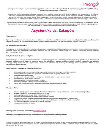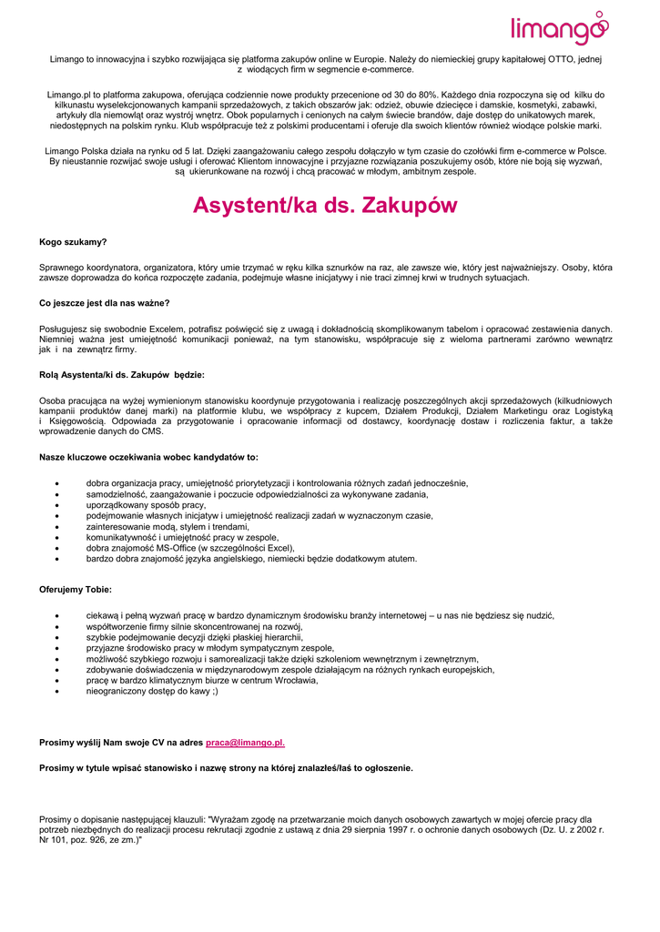 Limango to innowacyjna i szybko rozwijająca się platforma zakupów online w Europie. Należy do niemieckiej grupy kapitałowej OTTO, jednej z wiodących firm w segmencie e-commerce. Limango.pl to platforma zakupowa, oferująca codziennie nowe produkty przecenione od 30 do 80%. Każdego dnia rozpoczyna się od kilku do kilkunastu wyselekcjonowanych kampanii sprzedażowych, z takich obszarów jak: odzież, obuwie dziecięce i damskie, kosmetyki, zabawki, artykuły dla niemowląt oraz wystrój wnętrz. Obok popularnych i cenionych na całym świecie brandów, daje dostęp do unikatowych marek, niedostępnych na polskim rynku. Klub współpracuje też z polskimi producentami i oferuje dla swoich klientów również wiodące polskie marki. Limango Polska działa na rynku od 5 lat. Dzięki zaangażowaniu całego zespołu dołączyło w tym czasie do czołówki firm e-commerce w Polsce. By nieustannie rozwijać swoje usługi i oferować Klientom innowacyjne i przyjazne rozwiązania poszukujemy osób, które nie boją się wyzwań, są ukierunkowane na rozwój i chcą pracować w młodym, ambitnym zespole. Asystent/ka ds. Zakupów Kogo szukamy? Sprawnego koordynatora, organizatora, który umie trzymać w ręku kilka sznurków na raz, ale zawsze wie, który jest najważniejszy. Osoby, która zawsze doprowadza do końca rozpoczęte zadania, podejmuje własne inicjatywy i nie traci zimnej krwi w trudnych sytuacjach. Co jeszcze jest dla nas ważne? Posługujesz się swobodnie Excelem, potrafisz poświęcić się z uwagą i dokładnością skomplikowanym tabelom i opracować zestawienia danych. Niemniej ważna jest umiejętność komunikacji ponieważ, na tym stanowisku, współpracuje się z wieloma partnerami zarówno wewnątrz jak i na zewnątrz firmy. Rolą Asystenta/ki ds. Zakupów będzie: Osoba pracująca na wyżej wymienionym stanowisku koordynuje przygotowania i realizację poszczególnych akcji sprzedażowych (kilkudniowych kampanii produktów danej marki) na platformie klubu, we współpracy z kupcem, Działem Produkcji, Działem Marketingu oraz Logistyką i Księgowością. Odpowiada za przygotowanie i opracowanie informacji od dostawcy, koordynację dostaw i rozliczenia faktur, a także wprowadzenie danych do CMS. Nasze kluczowe oczekiwania wobec kandydatów to: dobra organizacja pracy, umiejętność priorytetyzacji i kontrolowania różnych zadań jednocześnie, samodzielność, zaangażowanie i poczucie odpowiedzialności za wykonywane zadania, uporządkowany sposób pracy, podejmowanie własnych inicjatyw i umiejętność realizacji zadań w wyznaczonym czasie, zainteresowanie modą, stylem i trendami, komunikatywność i umiejętność pracy w zespole, dobra znajomość MS-Office (w szczególności Excel), bardzo dobra znajomość języka angielskiego, niemiecki będzie dodatkowym atutem. Oferujemy Tobie: ciekawą i pełną wyzwań pracę w bardzo dynamicznym środowisku branży internetowej – u nas nie będziesz się nudzić, współtworzenie firmy silnie skoncentrowanej na rozwój, szybkie podejmowanie decyzji dzięki płaskiej hierarchii, przyjazne środowisko pracy w młodym sympatycznym zespole, możliwość szybkiego rozwoju i samorealizacji także dzięki szkoleniom wewnętrznym i zewnętrznym, zdobywanie doświadczenia w międzynarodowym zespole działającym na różnych rynkach europejskich, pracę w bardzo klimatycznym biurze w centrum Wrocławia, nieograniczony dostęp do kawy ;) Prosimy wyślij Nam swoje CV na adres [email protected]. Prosimy w tytule wpisać stanowisko i nazwę strony na której znalazłeś/łaś to ogłoszenie. Prosimy o dopisanie następującej klauzuli: "Wyrażam zgodę na przetwarzanie moich danych osobowych zawartych w mojej ofercie pracy dla potrzeb niezbędnych do realizacji procesu rekrutacji zgodnie z ustawą z dnia 29 sierpnia 1997 r. o ochronie danych osobowych (Dz. U. z 2002 r. Nr 101, poz. 926, ze zm.)"