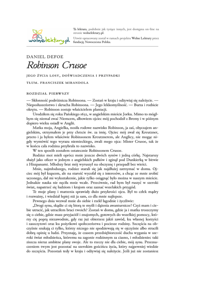 Ta lektura, podobnie jak tysiące innych, jest dostępna on-line na stronie wolnelektury.pl. Utwór opracowany został w ramach projektu Wolne Lektury przez fundację Nowoczesna Polska. DANIEL DEFOE Robinson Crusoe ż , ś ł. ł — Skłonność podróżnicza Robinsona. — Zostań w kraju i odżywiaj się należycie. — Nieposłuszeństwo i skrucha Robinsona. — Jego lekkomyślność. — Burza i rozbicie okrętu. — Robinson zostaje właścicielem plantacji. Urodziłem się roku Pańskiego , w angielskim mieście Jorku. Mimo to mógłbym się niemal zwać Niemcem, albowiem ojciec mój pochodził z Bremy i w późnym dopiero wieku osiadł w Anglii. Matka moja, Angielka, nosiła rodowe nazwisko Robinson, ja zaś, obyczajem angielskim, otrzymałem je przy chrzcie św. za imię. Ojciec mój zwał się Kreutzner, przeto i ja byłem właściwie Robinsonem Kreutznerem, ale Anglicy, nie mogąc nigdy wymówić tego wyrazu niemieckiego, zwali mego ojca: Mister Crusoe, tak że w końcu cała rodzina przybrała to nazwisko. W ten sposób zostałem ostatecznie Robinsonem Crusoe. Rodzice moi mieli oprócz mnie jeszcze dwóch synów i jedną córkę. Najstarszy służył jako oficer w jednym z angielskich pułków i zginął pod Dunkierką w bitwie z Hiszpanami. Młodszy brat mój wyruszył na obczyznę i przepadł bez wieści. Mnie, najmłodszego, rodzice starali się jak najdłużej zatrzymać w domu. Ojciec mój był kupcem, ale na starość wycofał się z interesów, a chcąc ze mnie zrobić uczonego, dał mi wykształcenie, jakie tylko osiągnąć było można w naszym mieście. Jednakże nauka nie nęciła mnie wcale. Przeciwnie, rad bym był ruszyć w szeroki świat, napatrzeć się ludziom i krajom oraz zaznać wszelakich przygód. Te moje plany i marzenia sprawiały dużo przykrości ojcu. Był to człek mądry i rozważny, i wiedział lepiej niż ja sam, co dla mnie najlepsze. Pewnego dnia wezwał mnie do siebie i rzekł łagodnie i życzliwie: „Drogi synu, skądże ci się biorą te myśli i dążenia awanturnicze? Czyż mam i ciebie utracić, jak utraciłem braci twoich? Zostań w domu, gdzie ja i matka troszczymy się o ciebie, gdzie masz przyjaciół i znajomych, gotowych do wszelkiej pomocy, którzy cię poprą niezawodnie, gdy raz już obierzesz jakiś zawód, ku własnej korzyści i zaszczytowi oraz ku pożytkowi społeczeństwa i pociesze rodziny. Szczęścia na obczyźnie szukają ci tylko, którzy niczego nie spodziewają się w ojczyźnie albo stracili dobrą opinię u ludzi. Przyznaję, że czasem przedsiębiorczość ducha wygania w szeroki świat młodzieńca, któremu na zagonie rodzinnym za ciasno, i młodzieniec taki ziszcza nieraz ambitne plany swoje. Ale to rzeczy nie dla ciebie, mój synu. Przeznaczeniem twym jest pozostać na szerokim gościńcu życia, który najpewniej wiedzie do szczęścia. Pozostań tedy w kraju i odżywiaj się należycie. Jeśli już nie zostaniesz uczonym, to masz dosyć zdolności, aby być dobrym kupcem, bo chyba nie uznajesz stanu ojca, stanu kupieckiego, za zbyt niski dla siebie”. Tymi i innymi jeszcze słowy przemawiał do mnie ojciec, ja zaś nabrałem przekonania, że ma słuszność i postanowiłem usłuchać go. Ale po kilku już dniach wrażenie nauk ojca pierzchło i jąłem na nowo snuć marzenia unoszące mnie daleko za lądy i morza, ku tajemniczym i nęcącym dalom świata. Skorzystawszy z wyjątkowo serdecznej chwili, podczas rozmowy z matką, powiedziałem jej, że nie mogę w żaden sposób opędzić się myśli wyruszenia na morze, że zakaz ojca uczynił mnie nieszczęśliwym, a pokusa może nawet sprawić, że wyjadę bez jego zezwolenia. Dodałem, że mając lat osiemnaście za stary już jestem, by wstąpić do praktyki kupieckiej, że zaś uczonym nie zostanę, przeto najlepiej będzie jeśli powolny swej skłonności ruszę w drogę. Prosiłem matkę, by mi wyrobiła u ojca zezwolenie na małą próbną podróż. Jeśli pierwsza wyprawa na morze nie ziści moich nadziei, to zrezygnuję z dalszych, wrócę do domu i zdwojoną pilnością nagrodzę czas stracony. Ale matka zapatrywała się na sprawę tak samo jak ojciec i z całą powagą odmówiła swego wstawiennictwa. Mimo to powtórzyła potem ojcu me słowa, ja zaś usłyszałem, jak odrzekł wzdychając ciężko: „Nieszczęsny to chłopiec! Mógłby być tak szczęśliwy, zostając z nami. Gdy ruszy w podróż, zostanie najnędzniejszym pod słońcem stworzeniem… Nie, za nic na to nie zezwolę!” Minął znowu rok. Ojciec i matka nalegali, bym obrał jakiś określony zawód, ja jednak głuchy byłem na ich serdeczne napomnienia i wreszcie zawrzałem gniewem z powodu tego oporu przeciw mojej woli. Pewnego dnia podjąłem małą wycieczkę do miasta portowego Hull, odległego parę tylko mil od Jorku. Tu spacerowałem po przystani, tęsknie spoglądając na rozliczne małe i wielkie okręty przybyłe z obcych krajów lub sposobiące się do odjazdu w świat daleki. Wszędzie powiewały flagi różnobarwne, a ogorzali marynarze pracowali, śpiewając. — Ach! — westchnąłem. — Czemuż ja tego samego uczynić nie mogę! Ach, czemuż mi nie wolno ruszyć w radosny, słoneczny świat! Nagle czyjaś dłoń spoczęła mi na ramieniu, a obejrzawszy się ujrzałem kolegę szkolnego tuż przy sobie. Pozdrowił mnie serdecznie, spytał, co robię w Hull i powiedział, że okręt jego ojca stoi tu na kotwicy, nazajutrz zaś rusza do Londynu. Znając jeszcze ze szkoły me skłonności marynarskie zaproponował, bym siadł na ich okręt i wraz z nim odbył tę podróż, która nic mnie kosztować nie będzie. Pokusie tej oprzeć się nie byłem w stanie. Nie myśląc o rodzicach, nie zawiadamiając ich nawet o zamiarze, nie bacząc zgoła na skutki tego nierozsądnego, lekkomyślnego i buntowniczego postępku, wsiadłem dnia września na odpływający do Londynu okręt. Zaprawdę, nigdy chyba wcześniej nie zaczęła się niedola młodego awanturnika i nie trw