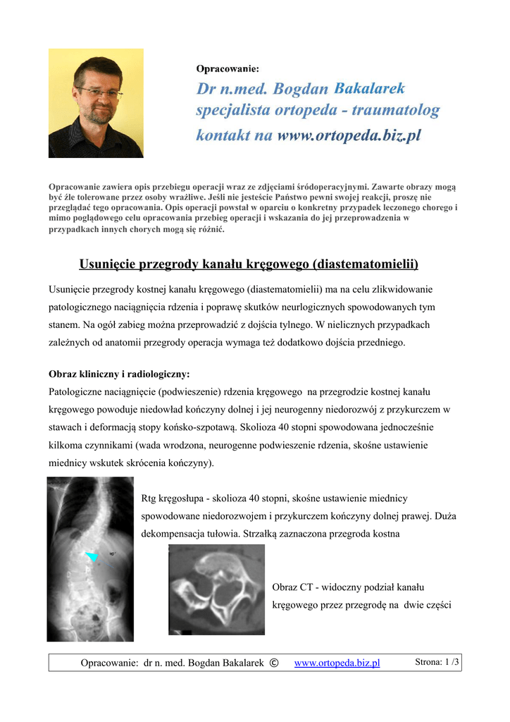 Opracowanie zawiera opis przebiegu operacji wraz ze zdjęciami śródoperacyjnymi. Zawarte obrazy mogą być źle tolerowane przez osoby wrażliwe. Jeśli nie jesteście Państwo pewni swojej reakcji, proszę nie przeglądać tego opracowania. Opis operacji powstał w oparciu o konkretny przypadek leczonego chorego i mimo poglądowego celu opracowania przebieg operacji i wskazania do jej przeprowadzenia w przypadkach innych chorych mogą się różnić. Usunięcie przegrody kanału kręgowego (diastematomielii) Usunięcie przegrody kostnej kanału kręgowego (diastematomielii) ma na celu zlikwidowanie patologicznego naciągnięcia rdzenia i poprawę skutków neurlogicznych spowodowanych tym stanem. Na ogół zabieg można przeprowadzić z dojścia tylnego. W nielicznych przypadkach zależnych od anatomii przegrody operacja wymaga też dodatkowo dojścia przedniego. Obraz kliniczny i radiologiczny: Patologiczne naciągnięcie (podwieszenie) rdzenia kręgowego na przegrodzie kostnej kanału kręgowego powoduje niedowład kończyny dolnej i jej neurogenny niedorozwój z przykurczem w stawach i deformacją stopy końsko-szpotawą. Skolioza 40 stopni spowodowana jednocześnie kilkoma czynnikami (wada wrodzona, neurogenne podwieszenie rdzenia, skośne ustawienie miednicy wskutek skrócenia kończyny). Rtg kręgosłupa - skolioza 40 stopni, skośne ustawienie miednicy spowodowane niedorozwojem i przykurczem kończyny dolnej prawej. Duża dekompensacja tułowia. Strzałką zaznaczona przegroda kostna Obraz CT - widoczny podział kanału kręgowego przez przegrodę na dwie części Opracowanie: dr n. med. Bogdan Bakalarek © www.ortopeda.biz.pl Strona: 1 /3 Na plecach widoczne charakterystyczne nieprawidłowe owłosienie nad diastematomielią Neurogenna deformacja stopy końskoszpotawa Wskazania do przeprowadzenia operacji: ➔ zaburzenia neurologiczne spowodowane narastającym podwieszeniem rdzenia na przegrodzie kanału kręgowego Cel zabiegu: ➔ usunięcie przegrody kostnej ➔ zabezpieczenie dziecka przed dalszym postępem zaburzeń neurologicznych w trakcie wzrostu, rozwoju skoliozy neurogennej i postępu deformacji kończyny ➔ usunięcie przegrody przed planowaną operacją korekcji skoliozy Uwagi: ➔ są dwa podejścia wyboru momentu, kiedy należy usunąć przegrodę. Jedno – to usunięcie w przypadku wystąpienia jakichkolwiek zaburzeń neurologicznych. Drugie - to usunięcie profilaktyczne, kiedy tych zaburzeń jeszcze nie ma. Usunięcie profilaktyczne może wydawać się lepsze, ale należy mieć na uwadze, że operacje takich wad wrodzonych kręgosłupa są obciążone najwyższym ryzykiem powikłań neurologicznych wśród operacji kręgosłupa. Rozwój zaburzeń neurologicznych w trakcie wzrostu dziecka jest bardzo prawdopodobny, ale u części chorych nigdy do nich nie dochodzi. Ryzyko musi się więc opłacać. W przypadku nawet najmniejszych zaburzeń neurologicznych u dziecka rosnącego nie należy zwlekać z zabiegiem, gdyż będą one postępować. ➔ jeśli skolioza wymaga operacji korekcyjnej przy współistniejącej diastematomielii najpierw należy usunąć przegrodę, następnie w drugim etapie przeprowadzić korekcję skoliozy. Opracowanie: dr n. med. Bogdan Bakalarek © www.ortopeda.biz.pl Strona: 2 /3 Nad miejscem przegrody wykonano laminektomię (usunięto łuki) idąc od zdrowej części kanału kręgowego. Strzałkami zielonymi zaznaczono rozdzielający się na dwie części worek oponowy. Strzałka niebieska częściowo odsłonięta przegroda kostna Większośc diastematomielii została usunięta. Dobrze widoczny jest podział worka i rdzenia na dwie części. Między nimi w dnie - resztka przegrody podwieszającej rdzeń Obraz po całkowitym usunięciu przegrody kostnej. W przypadku konieczności korekcji skoliozy po operacji usunięcia przegrody wykonuje się badanie kontrolne CT kręgosłupa, a następnie w drugim etapie przeprowadza się operację skoliozy. Można ten zabieg wykonać jednoczasowo, jeśli operator jest pewien całkowitego usunięcia przegrody i zupełnego uwolnienia rdzenia z podwieszenia. Śródoperacyjnie kontroluje się to w obrazie USG. Dowiedz się o deformacjach i wadach wrodzonych kręgosłupa: Opracowanie: dr n. med. Bogdan Bakalarek © www.ortopeda.biz.pl Strona: 3 /3