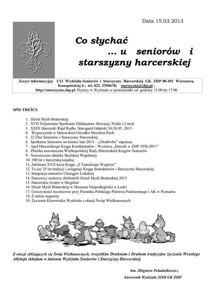 Data 15.03.2013 Co słychać … u seniorów i starszyzny harcerskiej Zeszyt informacyjny 1/13 Wydziału Seniorów i Starszyzny Harcerskiej GK ZHP 00-491 Warszawa, Konopnickiej 6 ; tel. 022. 3390678; [email protected] ; http://starszyzna.zhp.pl: Dyżury w Wydziale w poniedziałki od godziny 15.00 do 17.00 SPIS TREŚCI: 1. Dzień Myśli Braterskiej 2. XVII Trójstronne Spotkanie Oldskautów Słowacji, Polski i Czech 3. XXIX Harcerski Rajd Rodło, Starogard Gdański 24-26.05. 2013 4. Wypoczynek w Harcerskim Ośrodku Morskim Puck. 5. 22 Złaz Seniorów i Starszyzny Harcerskiej 6. Spotkanie Seniorów na koniec lata 2013 – „Głodówka” zaprasza 7. Apel Harcerskiego Kręgu Kombatantów - Wystawa „Dorośli w ZHP 1936-2011” 8. Zbiórka noworoczna Wielkopolskiej Rady Harcerskich Kręgów Seniorów 9. Noworoczna zbiórka Skulskiej Wspólnoty 10. 100 lat z harcerską książką 11. Jubileusz XXX-lecia Kręgu „Z Tumskiego Wzgórza” 12. To już 25 lat tradycji i osiągnięć Kręgu Instruktorów i Starszyzny Harcerskiej 13. Integracja seniorów Chorągwi Łódzkiej 14. Harcerscy seniorzy obchodzili Dzień Myśli Braterskiej 2013 15. Harcerskie święto w Mogilnie 16. Dzień Myśli Braterskiej w Muzeum Niepodległości w Łodzi 17. Uroczystości rocznicowe przy Pomniku Polskiego Państwa Podziemnego i AK w Poznaniu 18. Z żalem żegnamy 19. Życzenia Kierownika Wydziału z okazji Świąt Wielkanocnych Z okazji zbliżających się Świąt Wielkanocnych, wszystkim Druhnom i Druhom tradycyjne życzenia Wesołego Alleluja składam w imieniu Wydziału Seniorów i Starszyzny Harcerskiej. hm. Zbigniew Południkiewicz kierownik Wydziału SiSH GK ZHP 1. Dzień Myśli Braterskiej K ażda wersja Braterstwa zrozumiała jest w kilku swoich podstawowych elementach: Najpierw chodzi o naszą Postawę - otwartości i serdeczności wobec innych, wobec każdego, kto staje obok nas, a my wchodzimy w jego świat, jako że, wpatrzona w nas czyjaś twarz, jest miarą naszej za innych odpowiedzialności". Z tego rodzić się będzie Zrozumienie dla inności, na przykład drugiego Harcerza - i to aż do granic wyrozumienia. Nie oznacza to oddalenia się od własnej prawdy, ale dawanie wyrazu szacunku i godności wobec innego, w jego odrębności i prawdzie. To już początek wspólnego marszu - i to kształtuje Odpowiedzialność za drugiego. Tak zaczyna się dojrzałe braterstwo: wtedy nie wystarcza już tylko zgodnie patrzeć w tym samym kierunku, bo trzeba iść razem, trzeba Czynu podejmowanego dla czyjegoś dobra. Braterstwo to: postawa, zrozumienie, odpowiedzialności czyn. Instruktorski Krąg Pokoleń Romanosy 22 lutego 2013 r. Czuwaj! 2. XVII Trójstronne Spotkanie Oldskautów Słowacji, Polski i Czech W dniach 16-19 maja 2013 r. w Svatý Hostýn nad miejscowością Bystřice pod Hostýnem odbędzie się 17. międzynarodowe spotkanie seniorów i starszyzny skautowej Słowacji, Polski i Czech na które serdecznie zaprasza Junák – svaz skautů a skautek ČR Náčelnictvo Kmene dospělých. Dojazd: Stacja kolejowa Bystřice pod Hostýnem. Przed dworcem wsiąść do autobusu który wjeżdża aż na Hostýn. Samochodem: można wjechać aż na Hostýn, ALE prosimy zgłosić do 20.4.2013 numery samochodów oraz imię i nazwisko kierowcy, który pojedzie tym samochodem. Na Hostýn jest zakaz wjazdu!!! My Wam załatwimy pozwolenia wjazdu! Zakwaterowanie: Dom pątnika. Cena: 1800,-koron czeskich. W tym zakwaterowanie, pełne wyżywienie, wycieczka autokarowa, zwiedzanie zamku i parku w Kroměříři oraz coś na pamiątkę Tematy konferencii: 1./ Etyka skautowa we współczesnym świecie. 2./ Drużyna Svojsíka = wyróżnienie pracy czeskich oldskautów. Czy jest coś podobného w harcestwie? Zgłoszenia prosimy przesłać do 20.4.2013 pod adresem: Zbyszek Lajczyk Stonava č.1036 735 34 Stonava e-mail: [email protected] komórka: 608 718 150 Na wspólne spotkanie serdecznie zapraszają: Mara, Sidžo, Lišák i Pajtáš 3. XXIX Harcerski Rajd Rodło, Starogard Gdański 24-26.05. 2013 X XIX Harcerski Rajd Rodło odbędzie się w dniach 24-26 maja 2013 r. na Kociewiu w Starogardzie Gdańskim. W programie Trasy Seniorów przewidujemy: • W piątek - po południu poznanie centrum Starogardu, historii i zabytków miasta. Wieczorem Ognisko Trasy w Skansenie w Owidzu . • W sobotę - wycieczka do Pelplina, miejsca studiów i formacji duchowej bł. Ks. Stefana Wincentego Frelichowskiego, patrona Harcerstwa. Zwiedzanie najstarszego w Polsce Leśnego Ogrodu Dendrologicznego Wirty. Odwiedziny w Harcerskim Ośrodku Wodnym Funka nad j. Charzykowskim. Ognisko Rajdowe w Skansenie w Owidzu. • W niedzielę - harcerska, polowa msza św. i tradycyjne zakończenie rajdu w centrum miasta. Noclegi w pokojach 2 i 3 osobowych oraz wyżywienie zapewniamy w internacie szkolnym w Owidzu i w hotelu turystycznym w Starogardzie GD. Limit miejsc noclegowych 140. Uczestnicy rajdu będą odbierani z dworca PKP w Starogardzie Gdańskim. Całkowity koszt uczestnictwa 190 zł/ osobę. Wstępne zgłoszenia (ilość osób) z Kręgu, przyjmujemy do 15 marca 2013. Imienne zgłoszenia oraz opłatę uczestnictwa na konto Chorągwi Gdańskiej należy dokonać do 15 kwietnia 2013. ZHP CHORĄGIEW GDAŃSKA, 80-823 GDAŃSK ul. ZA MURAMI 2-10, nr rach. 51 1160 2202 0000 0000 5248 0766 Ze względu na ograniczenie miejsc noclegowych, proszę o bezwzględne dotrzymanie terminów zgłoszeń i opłat. przyjęciu uczestników na rajd, zadecyduje kolejność zgłoszeń! hm. Bogdan Radys 4. Wypoczynek w Harcerskim Ośrodku Morskim Puck. P roponujemy przedłużenie pobytu seniorów na Wybrzeżu w formie wypoczynku w Harcerskim Ośrodku Morskim w Pucku, zaraz po zakończeniu Rajdu Rodło, w dniach 26 – 31 maja 2012 r. W programie: pływanie jachtem, wycieczki i kominki harcerskie. Koszt pobytu 350 zł / osobę. Zgłoszenia na Rajd Rodło i wypoczynek w HOM Puck należy kierować w tym samym terminach na adres: hm. Bogdan Radys, ZHP Komenda Chorągwi Gdańskiej ul