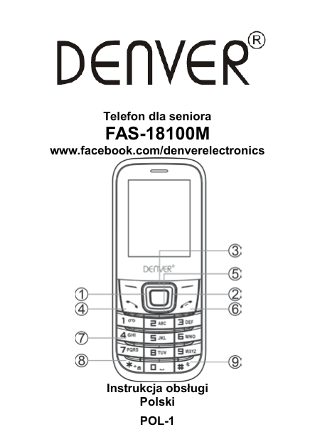 Telefon dla seniora FAS-18100M www.facebook.com/denverelectronics Instrukcja obsługi Polski POL-1 Rozpoczęcie użytkowania Wkładanie/wyjmowanie baterii Wkładanie baterii 1. Otworzyć pokrywę baterii 2. Włożyć baterię w gniazdo. Przyłożyć trzy punkty metalowe baterii skierowane do dołu i dopasować je do trzech metalowych punktów łączeniowych w telefonie. POL-2 3. Zamknąć pokrywę. Upewnić się, że pokrywa jest dokładnie dopasowana i słychać dźwięk dopasowania pokrywy. Uwaga: Wyłączyć wszystkie urządzenia i odłączyć ładowarkę podczas wyjmowania baterii. Należy stosować wyłącznie baterię dostosowaną do tego telefonu. Wkładanie/wyjmowanie karty SIM 1. Wkładanie karty SIM: Zdjąć pokrywę baterii, włożyć i wsunąć kartę SIM metalową częścią skierowaną do dołu zgodnie z kierunkiem strzałki do dołu w gnieździe baterii, aż karta SIM całkowicie znajdzie się we właściwej pozycji. POL-3 2. Wyjmowanie karty SIM: Przytrzymać wycięcie karty SIM i unieść ją delikatnie jedną ręką, a następnie wyjąć. Uwaga: Pamiętaj, że należy korzystać wyłącznie z kart SIM GSM, gdyż 3G nie są obsługiwane. Uwaga: Telefon musi być odłączony od zasilania podczas wkładania i wyjmowania baterii. Karta SIM i punkt stykowy mogą łatwo ulec uszkodzeniu z powodu zadrapań i wyginania. Należy zachować ostrożność podczas wkładania i wyjmowania karty SIM. Ładowanie baterii Telefon można ładować, kiedy jest odłączony lub POL-4 podłączony do zasilania. Przed rozpoczęciem ładowania upewnić się, że bateria jest włożona do telefonu. 1. Podłączyć ładowarkę. 2. Po naładowaniu najpierw odłączyć ładowarkę od wtyczki zasilania. Następnie odłączyć ładowarkę od telefonu. POL-5 Uwaga: Wskaźnik baterii wyświetli się po kilku minutach w przypadku zbyt dużego naładowania baterii. Powiadomienie o niewystarczającym poziomie naładowania baterii Na telefonie pojawi się powiadomienie o niskim poziomie naładowania baterii, a na ekranie wyświetli się komunikat. Należy naładować baterię. Aby zachować możliwość telefonowania, baterię należy naładować, kiedy pojawi się powiadomienie o niskim poziomie naładowania baterii. Telefon WŁĄCZANIE, WYŁĄCZANIE i blokada klawiatury: Aby włączyć i wyłączyć telefon, naciśnij i przytrzymaj klawisz z czerwoną słuchawką. Naciśnij i przytrzymaj klawisz *, by zablokować klawiaturę POL-6 Tryb gotowości Gdy telefon jest gotowy do użycia, lecz nie są wykonywane na nim żadne czynności, to przejdzie on w tryb gotowości. Ikony na ekranie Ikony mogą być wyświetlane na ekranie. Stan baterii Stan sygnału Budzik Wiadomość Tryb cichy Tryb ogólny Tryb wibracji Połączenie nieodebrane POL-7 Klawisz 1 2 3 4 Funkcje klawiszy Nazwa Funkcje klawisza Tryb gotowości: naciśnij Lewy by wpisać wiadomość klawisz Obsługa: naciśnij, by nawigacji przesunąć kursor w lewo Tryb gotowości: naciśnij Prawy by wejść do profili klawisz Obsługa: naciśnij, by nawigacji przesunąć kursor w prawo Tryb gotowości: naciśnij Klawisz by wejść do głównego nawigacji w menu Obsługa: górę naciśnij, by przesunąć kursor w górę Klawisz Naciśnij, by wykonać odpowiedzi połączenie lub (zielony naciśnij, by odebrać POL-8 klawisz) 5 Klawisz nawigacji w dół 6 Klawisz zakończenia (czerwony klawisz) 7 Klawisze numeryczne połączenie przychodzące. Tryb uśpienia: naciśnięcie powoduje przejście do listy połączeń Tryb uśpienia: naciśnięcie powoduje przejście do książki telefonicznej Działanie: naciśnięcie przesuwa kursor w dół Wyłączony telefon: Naciśnij na długo, by włączyć; Włączony telefon: Naciśnij na długo, by wyłączyć; Obsługa: Naciśnij, by powrócić do ekranu bezczynności Naciśnięcie powoduje wpisanie liczb lub liter POL-9 8 Klawisz * 9 Przycisk # Tryb gotowości: Naciśnij na długo, by zablokować klawiaturę. Naciśnij na krótko, by wprowadzić *, +, P. Tryb edycji: Naciśnij, by użyć zwykłego symbolu. Tryb gotowości: Długie naciśnięcie ustawia telefon w trybie cichym; krótkie naciśnięcie powoduje wpisanie #. Tryb edycji: Naciśnięcie przełącza metodę wpisywania. Wybieranie głosowe Wykonywanie połączeń międzynarodowych POL-10 1. Nacisnąć dwa razy klawisz 0, pojawi się znak „+”. Należy wprowadzić numer kierunkowy kraju, lokalny numer kierunkowy i numer telefonu (bez zera przed numerem telefonu komórkowego) Nacisnąć klawisz Wyślij, aby przejść do wybierania głosowego i wykonać połączenie wychodzące. 2. Wybieranie numeru stacjonarnego: „+” kod kraju + cały numer telefonu + klawisz Wyślij. Wybieranie numeru wewnętrznego sieci stacjonarnej. Na niektóre numery wewnętrznej sieci stacjonarnej nie można zadzwonić bezpośrednio. Należy najpierw zadzwonić na centralę telefoniczną, a następnie wybrać numer wewnętrzny. Wpisać symbol P między numerem centrali telefonicznej a numerem wewnętrznym, telefon wybierze numer wewnętrzny automatycznie. Poniższa metoda wpisania symbolu P: naciśnij na krótko trzy razy klawisz *. Na ekranie pojawi się symbol P. Skróty: Menu > Ustawienia > Ustawienia telefonu > Ustawienia skrótów. Klawisze wyboru GÓRA i DÓŁ mogą otwierać pewne skróty. POL-11 Domyślnie klawisz wyboru GÓRA przechodzi bezpośrednio do menu odtwarzacza muzyki, a DÓŁ do listy alarmowej. Menu główne: Aby wejść do Menu głównego w telefonie, naciśnij przycisk wyboru w góry po lewej. - Wiadomości: Pisanie i czytanie wiadomości tekstowych SMS. - Kontakty: Zarządzanie i zapisywanie kontaktów. - Zarejestrowane połączenia: Połączenia nieodebrane, wybrane itd. - Multimedia: Odtwarzacz wideo, Nagrywanie - Odtwarzacz audio: Można odtwarzać muzykę, to lepiej, aby włożyć kartę SD. - Moje pliki: Można otworzyć / usuwać / view / edytować plik tutaj. - Ustawienia: Personalizacja telefonu. - Narzędzia: Kalendarz, Kalkulator, Budzik, STK itp. - Pr