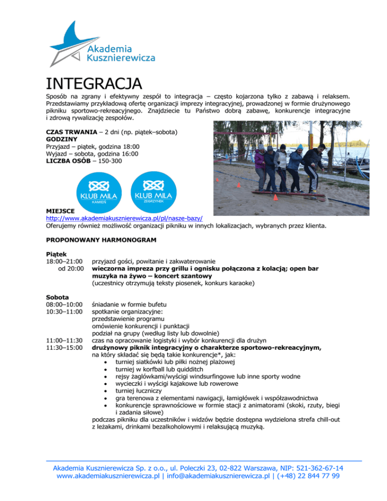 INTEGRACJA Sposób na zgrany i efektywny zespół to integracja ‒ często kojarzona tylko z zabawą i relaksem. Przedstawiamy przykładową ofertę organizacji imprezy integracyjnej, prowadzonej w formie drużynowego pikniku sportowo-rekreacyjnego. Znajdziecie tu Państwo dobrą zabawę, konkurencje integracyjne i zdrową rywalizację zespołów. CZAS TRWANIA – 2 dni (np. piątek‒sobota) GODZINY Przyjazd ‒ piątek, godzina 18:00 Wyjazd ‒ sobota, godzina 16:00 LICZBA OSÓB – 150-300 MIEJSCE http://www.akademiakusznierewicza.pl/pl/nasze-bazy/ Oferujemy również możliwość organizacji pikniku w innych lokalizacjach, wybranych przez klienta. PROPONOWANY HARMONOGRAM Piątek 18:00‒21:00 od 20:00 Sobota 08:00‒10:00 10:30‒11:00 11:00–11:30 11:30–15:00 przyjazd gości, powitanie i zakwaterowanie wieczorna impreza przy grillu i ognisku połączona z kolacją; open bar muzyka na żywo – koncert szantowy (uczestnicy otrzymują teksty piosenek, konkurs karaoke) śniadanie w formie bufetu spotkanie organizacyjne: przedstawienie programu omówienie konkurencji i punktacji podział na grupy (według listy lub dowolnie) czas na opracowanie logistyki i wybór konkurencji dla drużyn drużynowy piknik integracyjny o charakterze sportowo-rekreacyjnym, na który składać się będą takie konkurencje*, jak: turniej siatkówki lub piłki nożnej plażowej turniej w korfball lub quidditch rejsy żaglówkami/wyścigi windsurfingowe lub inne sporty wodne wycieczki i wyścigi kajakowe lub rowerowe turniej łuczniczy gra terenowa z elementami nawigacji, łamigłówek i współzawodnictwa konkurencje sprawnościowe w formie stacji z animatorami (skoki, rzuty, biegi i zadania siłowe) podczas pikniku dla uczestników i widzów będzie dostępna wydzielona strefa chill-out z leżakami, drinkami bezalkoholowymi i relaksującą muzyką. Akademia Kusznierewicza Sp. z o.o., ul. Poleczki 23, 02-822 Warszawa, NIP: 521-362-67-14 www.akademiakusznierewicza.pl | [email protected] | (+48) 22 844 77 99 UWAGA! Zawodnicy będą podzieleni na zespoły, a następnie sami podejmą decyzję, które osoby będą reprezentowały dany zespół w poszczególnych konkurencjach. Zaangażowanie wszystkich będzie kluczowe, by zdobyć jak najwięcej punktów i zmieścić się w wyznaczonym czasie. 15:00 16:30 lunch w formie bufetu uroczyste rozdanie nagród, podsumowanie imprezy, wręczenie pamiątkowych zdjęć *Konkurencje z pikniku sportowego wybiera klient w zależności od czasu trwania pikniku i liczby uczestników. PROGRAM W TEJ WERSJI SCENARIUSZA ZAWIERA: zakwaterowanie uczestników w Klubie Mila w Kamieniu lub Zegrzynku (pokoje 1-, 2-, 3- i 4-osobowe) wyżywienie zgodnie z programem, według ustalonego wcześniej menu muzyka oraz teksty do konkursu karaoke przy ognisku organizacja aktywności pikniku sportowo-rekreacyjnego, prowadzonych przez instruktorów i animatorów wykorzystanie sprzętu wodnego, boisk i sprzętu sportowego niezbędnego do organizacji wydarzenia nagrody dla uczestników pikniku ubezpieczenie uczestników komentator (konferansjer) prowadzący relację ze zmagań drużyn DODATKOWO PROPONUJEMY: upominki z kolekcji Akademii Kusznierewicza: kurtki, czapki, koszulki, akcesoria – możliwy branding odzieży logotypem firmy klienta relację fotograficzną oraz wideo z wydarzenia organizację drugiego noclegu po zmaganiach wybór terminu gwarantujący ośrodek na wyłączność dla Państwa grupy! Zapraszam! Mateusz Kusznierewicz KONTAKT Aneta Żebrowska +48 605 533 363 [email protected] Akademia Kusznierewicza Sp. z o.o., ul. Poleczki 23, 02-822 Warszawa, NIP: 521-362-67-14 www.akademiakusznierewicza.pl | [email protected] | (+48) 22 844 77 99