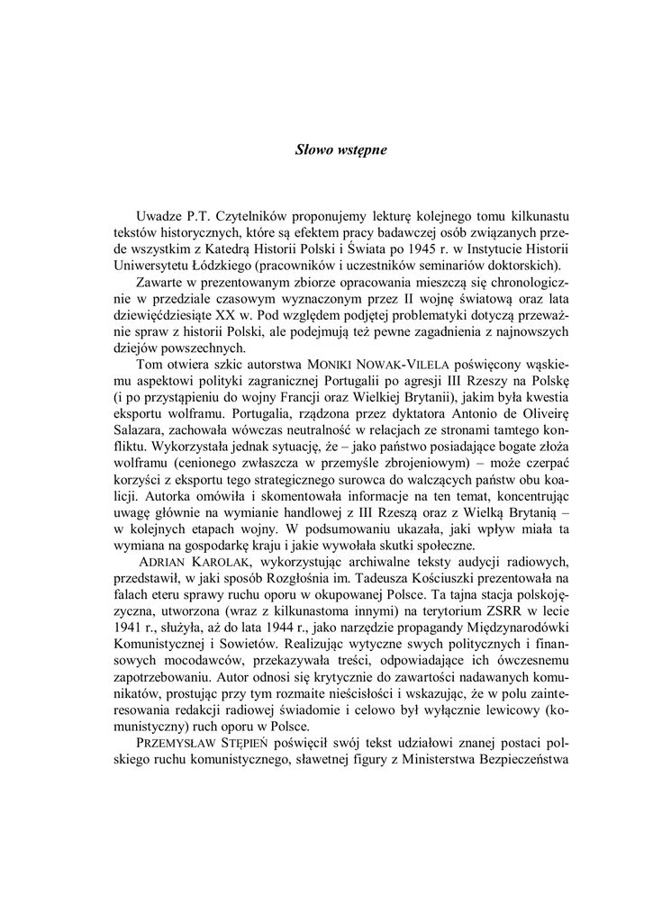 Słowo wstępne Uwadze P.T. Czytelników proponujemy lekturę kolejnego tomu kilkunastu tekstów historycznych, które są efektem pracy badawczej osób związanych przede wszystkim z Katedrą Historii Polski i Świata po 1945 r. w Instytucie Historii Uniwersytetu Łódzkiego (pracowników i uczestników seminariów doktorskich). Zawarte w prezentowanym zbiorze opracowania mieszczą się chronologicznie w przedziale czasowym wyznaczonym przez II wojnę światową oraz lata dziewięćdziesiąte XX w. Pod względem podjętej problematyki dotyczą przeważnie spraw z historii Polski, ale podejmują też pewne zagadnienia z najnowszych dziejów powszechnych. Tom otwiera szkic autorstwa MONIKI NOWAK-VILELA poświęcony wąskiemu aspektowi polityki zagranicznej Portugalii po agresji III Rzeszy na Polskę (i po przystąpieniu do wojny Francji oraz Wielkiej Brytanii), jakim była kwestia eksportu wolframu. Portugalia, rządzona przez dyktatora Antonio de Oliveirę Salazara, zachowała wówczas neutralność w relacjach ze stronami tamtego konfliktu. Wykorzystała jednak sytuację, że – jako państwo posiadające bogate złoża wolframu (cenionego zwłaszcza w przemyśle zbrojeniowym) – może czerpać korzyści z eksportu tego strategicznego surowca do walczących państw obu koalicji. Autorka omówiła i skomentowała informacje na ten temat, koncentrując uwagę głównie na wymianie handlowej z III Rzeszą oraz z Wielką Brytanią – w kolejnych etapach wojny. W podsumowaniu ukazała, jaki wpływ miała ta wymiana na gospodarkę kraju i jakie wywołała skutki społeczne. ADRIAN KAROLAK, wykorzystując archiwalne teksty audycji radiowych, przedstawił, w jaki sposób Rozgłośnia im. Tadeusza Kościuszki prezentowała na falach eteru sprawy ruchu oporu w okupowanej Polsce. Ta tajna stacja polskojęzyczna, utworzona (wraz z kilkunastoma innymi) na terytorium ZSRR w lecie 1941 r., służyła, aż do lata 1944 r., jako narzędzie propagandy Międzynarodówki Komunistycznej i Sowietów. Realizując wytyczne swych politycznych i finansowych mocodawców, przekazywała treści, odpowiadające ich ówczesnemu zapotrzebowaniu. Autor odnosi się krytycznie do zawartości nadawanych komunikatów, prostując przy tym rozmaite nieścisłości i wskazując, że w polu zainteresowania redakcji radiowej świadomie i celowo był wyłącznie lewicowy (komunistyczny) ruch oporu w Polsce. PRZEMYSŁAW STĘPIEŃ poświęcił swój tekst udziałowi znanej postaci polskiego ruchu komunistycznego, sławetnej figury z Ministerstwa Bezpieczeństwa 4 ALBIN GŁOWACKI Państwowego, Julii Brystygierowej (1902–1975), w pracach nad utworzeniem w Moskwie Polskiego Komitetu Narodowego, a następnie Centralnego Biura Komunistów Polski. Tamte wydarzenia to ważny aspekt naszej ojczystej historii, głównie w kontekście późniejszych narodzin Polski „ludowej”. W oparciu o materiały archiwalne z Archiwum Akt Nowych, źródła publikowane, memuarystykę oraz literaturę przedmiotu Autor prześledził rolę (niewielką) i rzeczywisty wkład swojej bohaterki w tworzenie wspomnianych struktur organizacyjnych. Omawiane fakty są zaprezentowane na tle wydarzeń tamtego okresu, odnoszących się do spraw polskich, co pozwala lepiej rozumieć sens i społeczno-polityczną wagę opisywanych kwestii. Problematyka działalności lewicy polskiej w ZSRR jest przedmiotem badań także RAFAŁA KAZIMIERZA NOWAKA. Jego opracowanie dotyczy bowiem dokonań działaczy Związku Patriotów Polskich (ZPP) we Lwowie na niwie kulturalno-oświatowej w latach 1944–1946. Autor najpierw omówił sprawy organizacyjne i personalne, a następnie różnorodne formy aktywności lwowskiej placówki ZPP w interesującej go tu dziedzinie (akcja pomocy dla mieszkańców wyzwolonej Warszawy, zbiórka książek dla polskich bibliotek w kraju, prace naukowobadawcze, Teatr Małych Form „Miniatury”, audycje radiowe w języku polskim, referaty do odczytów, artykuły w „Czerwonym Sztandarze”, patriotyczne akademie, opieka nad świetlicami). Na zupełnie inną scenę wydarzeń międzynarodowych przenosi czytelnika tekst SEBASTIANA ZAWISTOWSKIEGO. Przypomina on, że faszystowska Hiszpania lawirowała podczas II wojny światowej od pozycji państwa neutralnego po status strony niewalczącej (ale „Błękitną Dywizję” jednak posłała na front wschodni) i – mimo klęski państw „Osi” – zachowała dotychczasowy system społeczno-polityczny. Sytuacja ta mobilizowała Sowietów do „dokończenia wojny z faszyzmem” i do podejmowania prób przywrócenia w Hiszpanii republiki. Wobec tego, że niemożliwe było dokonanie tego z użyciem wojska lub (i) hiszpańskiej opozycji antyfaszystowskiej, Kreml wybrał mobilizowanie opinii światowej przeciwko reżimowi gen. Francisco Franco (np. na forum ONZ). Autor ukazał na konkretnych przykładach z lat 1944–1946 tego rodzaju działania (także z wykorzystaniem polskiej dyplomacji), zauważając, że straszenie przez propagandę radziecką zagrożeniem jądrowym (przeniesienie hitlerowskich prac nad bronią atomową do Hiszpanii) – miało pomóc w zaakceptowaniu przez społeczeństwo w ZSRR wydatków zbrojeniowych i konsolidować je pod egidą partii komunistycznej. HELENA KONIUSZEK zajęła się kwestią przesiedlenia Białorusinów z Polski do Białoruskiej SRR na podstawie porozumienia w tej sprawie z 9 września 1944 r. Tematykę tę świadomie zawęziła do przykładu powiatu bielskiego (Bielsk Podlaski), w którym to mniejszość białoruska stanowiła najliczniejszą w Białostockiem grupę narodowościową. Najpierw jednak Autorka dokonała porównania Słowo wstępne 5 składu narodowościowego mieszkańców Białostocczyzny przed wybuchem wojny w 1939 r. i po jej zakończeniu (dane z 1948 r.), a następnie przytoczyła liczby obrazujące liczebność poszczególnych konfesji na tymże terenie. Na tle tych danych naszkicowała sytuację ekonomiczną Białorusinów w województwie białost