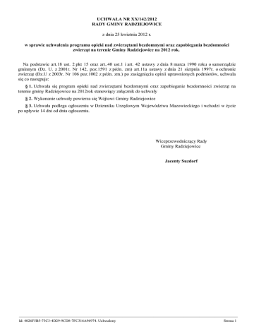UCHWAŁA NR XX/142/2012 RADY GMINY RADZIEJOWICE z dnia 25 kwietnia 2012 r. w sprawie uchwalenia programu opieki nad zwierzętami bezdomnymi oraz zapobiegania bezdomności zwierząt na terenie Gminy Radziejowice na 2012 rok. Na podstawie art.18 ust. 2 pkt 15 oraz art..40 ust.1 i art. 42 ustawy z dnia 8 marca 1990 roku o samorządzie gminnym (Dz. U. z 2001r. Nr 142, poz.1591 z późn. zm) art.11a ustawy z dnia 21 sierpnia 1997r. o ochronie zwierząt (Dz.U z 2003r. Nr 106 poz.1002 z późn. zm.) po zasięgnięciu opinii uprawnionych podmiotów, uchwala się co następuje: § 1. Uchwala się program opieki nad zwierzętami bezdomnymi oraz zapobieganie bezdomności zwierząt na terenie gminy Radziejowice na 2012rok stanowiący załącznik do uchwały § 2. Wykonanie uchwały powierza się Wójtowi Gminy Radziejowice § 3. Uchwała podlega ogłoszeniu w Dzienniku Urzędowym Województwa Mazowieckiego i wchodzi w życie po upływie 14 dni od dnia ogłoszenia. Wiceprzewodniczący Rady Gminy Radziejowice Jacenty Suzdorf ————————————————————————————————————————————————————————— Id: 4026F5B5-73C3-4D29-9CD8-7FC316A96974. Uchwalony Strona 1 Załącznik do Uchwały Nr XX/142/2012 Rady Gminy Radziejowice z dnia 25 kwietnia 2012 r. Gminny program opieki nad domowymi zwierzętami bezdomnymi oraz zapobiegania bezdomności zwierząt na terenie gminy Radziejowice § 1. 1. Celami Programu są: 1) zapewnienie opieki nad zwierzętami bezdomnymi w rozumieniu art. 4 pkt 16 ustawy o ochronie zwierząt ( Dz.U z 2003r. Nr 106 poz.1002 z późn.zmianami); 2) zapobieganie bezdomności zwierząt; 3) zapewnienie bezpieczeństwa mieszkańcom Gminy; 4) edukacja mieszkańców Gminy w zakresie humanitarnego traktowania zwierząt. 2. Wykonawcami Programu są: 1) Gmina Radziejowice; 2) Schronisko dla Bezdomnych Zwierząt Domowych ,, Przyjaciel ‘’ w Kotliskach 13, 99-300 poczta Kutno; 3) organizacje społeczne, stowarzyszenia, fundacje, których statutowym celem działania jest przeciwdziałanie bezdomności zwierząt we współpracy z organami gminy; 4) jednostki oświatowe z terenu gminy Radziejowice. § 2. 1. Zapewnienie bezdomnym zwierzętom domowym miejsca w schronisku dla zwierząt, gmina realizuje poprzez współpracę z działającym schroniskiem dla zwierząt w Kotliskach Schronisko prowadzi wszelkie działania mające na celu przeciwdziałanie problemowi bezdomności wśród zwierząt domowych m.in. przyjmowanie oraz zapewnienie zwierzętom przebywającym w schronisku właściwych warunków bytowania , zgodnych z ich podstawowymi potrzebami , zabezpieczenie weterynaryjne przyjętych i przetrzymywanych zwierząt, przekazywanie ze schroniska zwierząt do adopcji. 2. Pomoc w finansowaniu kastracji czy sterylizacji bezpańskich zwierząt,( do wyczerpania środków w budżecie Gminy przeznaczonych na ten cel) które zaadoptują mieszkańcy gminy § 3. 1. Opieka nad kotami wolnożyjącymi realizowana jest poprzez: 1) ustalenie miejsc, w których przebywają koty wolnożyjące; 2) zapewnianie dokarmiania oraz zapewnienia im wody pitnej w miejscach ustalonych jak wyżej; 3) w miarę możliwości zapewnienie miejsca schronienia, w szczególności na okres zimowy; 4) powierzenie realizacji w/w zadań organizacjom społecznym. § 4. 1. Na terenie Gminy Radziejowice obowiązuje wyłapywanie bezdomnych zwierząt na interwencje Policji lub mieszkańców. Na wyłapywanie bezdomnych zwierząt została zawarta umowa z uprawnionym podmiotem tj. Firma Usługowa ,,HERKULES’’ Zbigniew Szczechowicz, Kotliska 6. Wyłapane bezdomne zwierzęta przewożone będą do Schroniska dla Bezdomnych Zwierząt w Kotliskach, 99-300 Kutno. 2. Wyłapywaniem będą objęte bezdomne zwierzęta pozostawione bez opieki, w stosunku, do których nie istnieje możliwość ustalenia ich właściciela lub innej osoby, pod której opieką dotychczas pozostawały, a w szczególności chore lub zagrażające życiu, zdrowiu i bezpieczeństwu ludzi. 3. W celu zapewnienia dalszej opieki nad wyłapanymi bezdomnymi zwierzętami Gmina Radziejowice podpisała umowę na przyjęcie oraz utrzymanie bezdomnych zwierząt w Schronisku dla Bezdomnych Zwierząt w Kotliskach 99-300 Kutno. ————————————————————————————————————————————————————————— Id: 4026F5B5-73C3-4D29-9CD8-7FC316A96974. Uchwalony Strona 1 § 5. 1. Poszukiwanie właścicieli dla bezdomnych zwierząt realizowane jest poprzez: 1) informowanie o możliwości adopcji zamieszczenie informacje w mediach; bezdomnych zwierząt przebywających w schronisku poprzez 2) współdziałanie z organizacjami społecznymi w zakresie poszukiwania nowych właścicieli zwierząt. § 6. 1. Usypianie ślepych miotów: 1) usypianie ślepych miotów może nastąpić wyłącznie przez lekarza weterynarii; 2) zwierzę usypiane musi być traktowane - do ostatniej chwili życia - łagodnie i przyjaźnie, należy zaoszczędzić mu trwogi i dodatkowych udręczeń, sam zabieg uśpienia powinien być wykonany przez lekarza weterynarii w sposób humanitarny i dopuszczający przez Towarzystwo Opieki nad Zwierzętami w Polsce; 3) zwłoki uśpionych zwierząt muszą być odpowiednio zabezpieczone do czasu zabrania ich przez odpowiednie służby do tego przeznaczone. § 7. 1. Zapewnienie bezpieczeństwa mieszkańcom Gminy w odniesieniu do zwierząt domowych realizowane jest poprzez: 1) egzekwowanie we współpracy z Inspekcją Weterynaryjną obowiązku szczepienia psów przeciwko wściekliźnie; 2) wypełnianie obowiązków zawartych w Regulaminie utrzymania czystości i porządku na terenie Gminy Radziejowice. § 8. Edukacja mieszkańców gminy w zakresie humanitarnego traktowania zwierząt realizowana jest poprzez: 1) zachęcenie nauczycieli w szkołach i przedszkolach z terenu gminy do włączenia treści programowyc