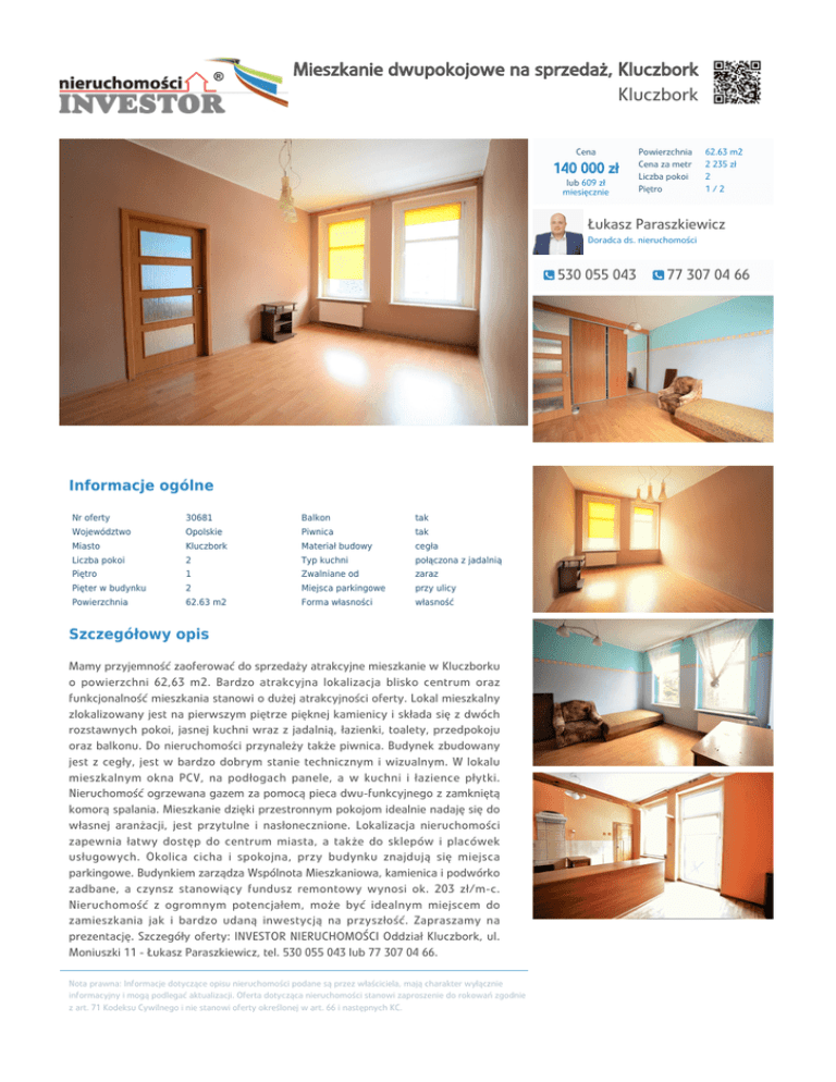 Mieszkanie dwupokojowe na sprzedaż, Kluczbork Kluczbork Cena 140 000 zł lub 609 zł miesięcznie Powierzchnia Cena za metr Liczba pokoi Piętro 62.63 m2 2 235 zł 2 1/2 Łukasz Paraszkiewicz Doradca ds. nieruchomości 530 055 043 Informacje ogólne Nr oferty 30681 Balkon tak Województwo Opolskie Piwnica tak Miasto Kluczbork Materiał budowy cegła Liczba pokoi 2 Typ kuchni połączona z jadalnią Piętro 1 Zwalniane od zaraz Pięter w budynku 2 Miejsca parkingowe przy ulicy Powierzchnia 62.63 m2 Forma własności własność Szczegółowy opis Mamy przyjemność zaoferować do sprzedaży atrakcyjne mieszkanie w Kluczborku o powierzchni 62,63 m2. Bardzo atrakcyjna lokalizacja blisko centrum oraz funkcjonalność mieszkania stanowi o dużej atrakcyjności oferty. Lokal mieszkalny zlokalizowany jest na pierwszym piętrze pięknej kamienicy i składa się z dwóch rozstawnych pokoi, jasnej kuchni wraz z jadalnią, łazienki, toalety, przedpokoju oraz balkonu. Do nieruchomości przynależy także piwnica. Budynek zbudowany jest z cegły, jest w bardzo dobrym stanie technicznym i wizualnym. W lokalu mieszkalnym okna PCV, na podłogach panele, a w kuchni i łazience płytki. Nieruchomość ogrzewana gazem za pomocą pieca dwu-funkcyjnego z zamkniętą komorą spalania. Mieszkanie dzięki przestronnym pokojom idealnie nadaję się do własnej aranżacji, jest przytulne i nasłonecznione. Lokalizacja nieruchomości zapewnia łatwy dostęp do centrum miasta, a także do sklepów i placówek usługowych. Okolica cicha i spokojna, przy budynku znajdują się miejsca parkingowe. Budynkiem zarządza Wspólnota Mieszkaniowa, kamienica i podwórko zadbane, a czynsz stanowiący fundusz remontowy wynosi ok. 203 zł/m-c. Nieruchomość z ogromnym potencjałem, może być idealnym miejscem do zamieszkania jak i bardzo udaną inwestycją na przyszłość. Zapraszamy na prezentację. Szczegóły oferty: INVESTOR NIERUCHOMOŚCI Oddział Kluczbork, ul. Moniuszki 11 - Łukasz Paraszkiewicz, tel. 530 055 043 lub 77 307 04 66. Nota prawna: Informacje dotyczące opisu nieruchomości podane są przez właściciela, mają charakter wyłącznie informacyjny i mogą podlegać aktualizacji. Oferta dotycząca nieruchomości stanowi zaproszenie do rokowań zgodnie z art. 71 Kodeksu Cywilnego i nie stanowi oferty określonej w art. 66 i następnych KC. 77 307 04 66 Oddział Kluczbork, ul. Moniuszki 11 , 46-200 Kluczbork 77 400 01 76 • [email protected] • www.investor.net.pl 2017-03-03 15:03:25 Strona 1 z 1