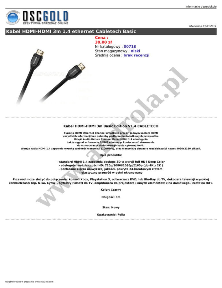 Informacje o produkcie Utworzono 03-03-2017 Kabel HDMI-HDMI 3m 1.4 ethernet Cabletech Basic Cena : 30,00 zł ro la .p l Nr katalogowy : 00718 Stan magazynowy : niski Średnia ocena : brak recenzji Kabel HDMI-HDMI 3m Basic Edition V1.4 CABLETECH nd Funkcja HDMI Ethernet Channel umożliwia przesył jednym kablem HDMI wszystkich informacji bez potrzeby podłączania dodatkowych przewodów. Dzięki Audio Return Channel Kabel HDMI 1.4 udostępnia także sygnał w formacie S/PDiF eliminując konieczność stosowania do wzmacniacza dodatkowego kabla cyfrowej fonii. Wersja kabla HDMI 1.4 zapewnia wysoką szybkość transmisji (100Mb/s), oraz transmisję obrazu o rozdzielczości nawet 4096x2160 pikseli. w .a Opis produktu: - standard HDMI 1.4 zapewnia obsługę 3D w wersji full HD i Deep Color - obsługuje rozdzielczości HD: 720p/1080i/1080p/2160p (do 4K x 2K ) - pozłacane złącza najwyższej jakości, pokryte 24-karatowym złotem - elastyczny przewód w pełni ekranowany w w Przewód może służyć do połączenia: konsoli Xbox, Playstation 3, odtwarzacz DVD, lub Blu-Ray do TV, dekodera telewizji wysokiej rozdzielczości (np. N-ka, Cyfra+, Cyfrowy Polsat) do TV, amplitunera do projektora i innych elementów kina domowego / zestawu HiFi. Kolor: Czarny Długość: 3m Stan: Nowy Opakowanie: Folia Wygenerowano w programie www.oscGold.com