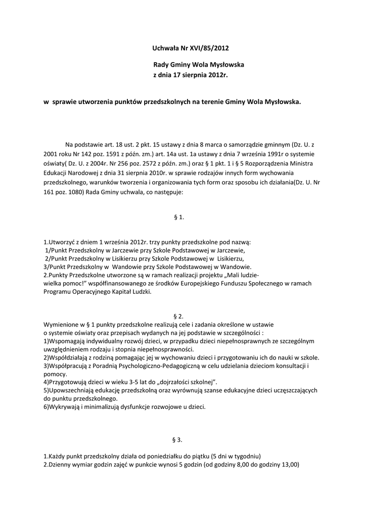 Uchwała Nr XVI/85/2012 Rady Gminy Wola Mysłowska z dnia 17 sierpnia 2012r. w sprawie utworzenia punktów przedszkolnych na terenie Gminy Wola Mysłowska. Na podstawie art. 18 ust. 2 pkt. 15 ustawy z dnia 8 marca o samorządzie gminnym (Dz. U. z 2001 roku Nr 142 poz. 1591 z późn. zm.) art. 14a ust. 1a ustawy z dnia 7 września 1991r o systemie oświaty( Dz. U. z 2004r. Nr 256 poz. 2572 z późn. zm.) oraz § 1 pkt. 1 i § 5 Rozporządzenia Ministra Edukacji Narodowej z dnia 31 sierpnia 2010r. w sprawie rodzajów innych form wychowania przedszkolnego, warunków tworzenia i organizowania tych form oraz sposobu ich działania(Dz. U. Nr 161 poz. 1080) Rada Gminy uchwala, co następuje: § 1. 1.Utworzyć z dniem 1 września 2012r. trzy punkty przedszkolne pod nazwą: 1/Punkt Przedszkolny w Jarczewie przy Szkole Podstawowej w Jarczewie, 2/Punkt Przedszkolny w Lisikierzu przy Szkole Podstawowej w Lisikierzu, 3/Punkt Przedszkolny w Wandowie przy Szkole Podstawowej w Wandowie. 2.Punkty Przedszkolne utworzone są w ramach realizacji projektu „Mali ludziewielka pomoc!” współfinansowanego ze środków Europejskiego Funduszu Społecznego w ramach Programu Operacyjnego Kapitał Ludzki. § 2. Wymienione w § 1 punkty przedszkolne realizują cele i zadania określone w ustawie o systemie oświaty oraz przepisach wydanych na jej podstawie w szczególności : 1)Wspomagają indywidualny rozwój dzieci, w przypadku dzieci niepełnosprawnych ze szczególnym uwzględnieniem rodzaju i stopnia niepełnosprawności. 2)Współdziałają z rodziną pomagając jej w wychowaniu dzieci i przygotowaniu ich do nauki w szkole. 3)Współpracują z Poradnią Psychologiczno-Pedagogiczną w celu udzielania dzieciom konsultacji i pomocy. 4)Przygotowują dzieci w wieku 3-5 lat do „dojrzałości szkolnej”. 5)Upowszechniają edukację przedszkolną oraz wyrównują szanse edukacyjne dzieci uczęszczających do punktu przedszkolnego. 6)Wykrywają i minimalizują dysfunkcje rozwojowe u dzieci. § 3. 1.Każdy punkt przedszkolny działa od poniedziałku do piątku (5 dni w tygodniu) 2.Dzienny wymiar godzin zajęć w punkcie wynosi 5 godzin (od godziny 8,00 do godziny 13,00) a )godzina zajęć opiekuńczo-wychowawczych w punkcie przedszkolnym wynosi 60 min. § 4. Do punktu przedszkolnego przyjmowane są dzieci w wieku 3-5 lat zgodnie z warunkami określonymi w Regulaminie rekrutacji dzieci do punktów przedszkolnych prowadzonej w ramach projektu „Mali ludzie – wielka pomoc!” stanowiącego załącznik do uchwały. § 5. 1.Dzieci uczęszczające do przedszkola mają prawo do: a)Właściwie zorganizowanego procesu wychowawczo – dydaktyczno -opiekuńczego zgodnie z ich rozwojem psychofizycznym, b)Opieki wychowawczej oraz ochrony przed wszelkimi formami przemocy fizycznej bądź psychicznej, c)Poszanowania godności osobistej, d)Życzliwego podmiotowego traktowania , e)Swobody wyrażania myśli i przekonań, f)Rozwijania własnych zainteresowań i zdolności, g)Pomocy w wyrównywaniu różnego rodzaju braków i deficytów rozwojowych, h)Bezpłatnego korzystania z dodatkowych zajęć edukacyjnych: język angielski, rytmika, i)Przygotowania umożliwiającego osiągnięcie „gotowości szkolnej”, j)Wychowania w tolerancji dla samego siebie i innych ludzi, bez względu na rasę, płeć, wiek, stan zdrowia, narodowość, akceptowanie ich potrzeb, k)Zaspokajania poczucia bezpieczeństwa, l)Wprowadzania w kulturę bycia, m)Zaspokajania podstawowych potrzeb fizjologicznych. 2.Obowiązkiem dzieci uczęszczających do przedszkola jest: a)Współdziałanie z nauczycielami w procesie wychowania i nauczania, b)Podporządkowanie się obowiązującym w grupie umowom i zasadom współżycia społecznego, c)Szanowania wytworów innych dzieci, d)Szanowanie sprzętów i zabawek jako wspólnej własności, e)Uczestniczenie w pracach porządkowych i samoobsługowych, pełnienie dyżurów, f)Przestrzeganie zasad równego prawa do korzystania ze wspólnych zabawek, g)Kulturalne zwracanie się do innych: używanie form grzecznościowych, h)Zdyscyplinowanie zgłaszania się na zbiórki, zwłaszcza w czasie spacerów i wycieczek, i)Przestrzeganie zasad higieny osobistej, j)Przestrzeganie wartości uniwersalnych , takich jak: dobro, prawda, miłość i piękno. 3.Na wniosek nauczyciela prowadzącego punkt przedszkolny organ prowadzący w rozumieniu wyżej powołanych przepisów może dokonać skreślenia dziecka z listy wychowanków punktu przedszkolnego, gdy dziecko nie uczęszcza na zajęcia przez okres ponad 2 tygodnie a rodzice nie zgłoszą pisemnie przyczyny nieobecności dziecka oraz w przypadku wyraźnego żądania rodziców skreślenia dziecka z listy wychowanków punktu przedszkolnego. § 6. 1.Punkt przedszkolny zapewnia stałą opiekę pedagogiczną w czasie zajęć. 2.Za zdrowie i bezpieczeństwo dzieci w czasie zajęć odpowiada nauczyciel zatrudniony w punkcie. 3.Nauczycielowi pomaga osoba zatrudniona na stanowisku pomocy nauczyciela oraz mogą pomagać rodzice i wolontariusze. §7. 1.Obowiązkiem rodziców lub opiekunów jest: 1)Punktualne przyprowadzanie i odbieranie dziecka z punktu przedszkolnego. 2)Rodzic zobowiązany jest do wcześniejszego przedłożenia upoważnienia w przypadku odbierania dziecka przez inną osobę niż rodzic. 3)Informowania o przyczynach nieobecności dziecka w punkcie przedszkolnym. 4)Współdziałania z nauczycielem prowadzącym punkt w celu skutecznego oddziaływania wychowawczego na dziecko i określenia drogi jego indywidualnego rozwoju. 2.Rodzice mogą uczestniczyć w zajęciach organizowanych w punkcie przedszkolnym. § 8. 1.W punkcie przedszkolnym organizowane są zajęcia z języka angielskiego i rytmiki – 1 godzina tygodniowo 45min. 2.Osoby prowadzące zajęcia dodatkowe powinny posiadać odpowiednie kwalifikacje . § 9. Punkt funkcjonuje w dni robocze przez okres 11 miesięcy w roku z wyjątkiem dni ustawowo wolnych od pracy oraz przerwy wakacyjnej od 15 lipca do 15 sierpnia. § 10. Nau