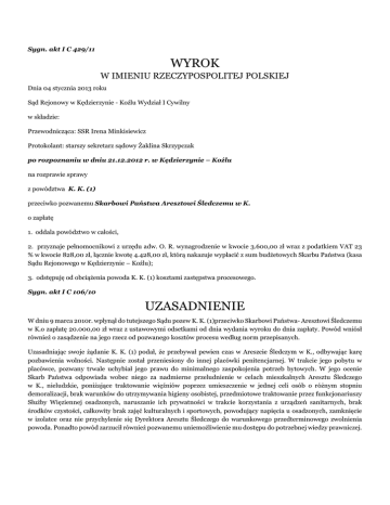 Sygn. akt I C 429/11 WYROK W IMIENIU RZECZYPOSPOLITEJ POLSKIEJ Dnia 04 stycznia 2013 roku Sąd Rejonowy w Kędzierzynie - Koźlu Wydział I Cywilny w składzie: Przewodnicząca: SSR Irena Minkisiewicz Protokolant: starszy sekretarz sądowy Żaklina Skrzypczak po rozpoznaniu w dniu 21.12.2012 r. w Kędzierzynie – Koźlu na rozprawie sprawy z powództwa K. K. (1) przeciwko pozwanemu Skarbowi Państwa Aresztowi Śledczemu w K. o zapłatę 1. oddala powództwo w całości, 2. przyznaje pełnomocnikowi z urzędu adw. O. R. wynagrodzenie w kwocie 3.600,00 zł wraz z podatkiem VAT 23 % w kwocie 828,00 zł, łącznie kwotę 4.428,00 zł, którą nakazuje wypłacić z sum budżetowych Skarbu Państwa (kasa Sądu Rejonowego w Kędzierzynie – Koźlu); 3. odstępuję od obciążenia powoda K. K. (1) kosztami zastępstwa procesowego. Sygn. akt I C 106/10 UZASADNIENIE W dniu 9 marca 2010r. wpłynął do tutejszego Sądu pozew K. K. (1)przeciwko Skarbowi Państwa- Aresztowi Śledczemu w K.o zapłatę 20.000,00 zł wraz z ustawowymi odsetkami od dnia wydania wyroku do dnia zapłaty. Powód wniósł również o zasądzenie na jego rzecz od pozwanego kosztów procesu według norm przepisanych. Uzasadniając swoje żądanie K. K. (1) podał, że przebywał pewien czas w Areszcie Śledczym w K., odbywając karę pozbawienia wolności. Następnie został przeniesiony do innej placówki penitencjarnej. W trakcie jego pobytu w placówce, pozwany trwale uchybiał jego prawu do minimalnego zaspokojenia potrzeb bytowych. W jego ocenie Skarb Państwa odpowiada wobec niego za nadmierne przeludnienie w celach mieszkalnych Aresztu Śledczego w K., nieludzkie, poniżające traktowanie więźniów poprzez umieszczenie w jednej celi osób o różnym stopniu demoralizacji, brak warunków do utrzymywania higieny osobistej, przedmiotowe traktowanie przez funkcjonariuszy Służby Więziennej osadzonych, naruszanie ich prywatności w trakcie korzystania z urządzeń sanitarnych, brak środków czystości, całkowity brak zajęć kulturalnych i sportowych, powodujący napięcia u osadzonych, zamknięcie w izolatce oraz nie przychylenie się Dyrektora Aresztu Śledczego do warunkowego przedterminowego zwolnienia powoda. Ponadto powód zarzucił również pozwanemu uniemożliwienie mu dostępu do potrzebnej wiedzy prawniczej. W ocenie powoda dopuszczając się powyższych zachowań Rzeczpospolita Polska nie uczyniła zadość swoim zobowiązaniom międzynarodowym do przestrzegania praw i wolności człowieka. Pozwany nie przestrzegał nadto krajowego porządku prawnego, w szczególności ustawy zasadniczej. W związku z powyższym zażądał on zadośćuczynienie za poniesioną przez niego szkodę niematerialną w kwocie 20.000,00 zł. W reakcji na pozew odpowiedź wniósł Skarb Państwa-Areszt Śledczy w K., domagając się oddalenia powództwa oraz zasądzenia na jego rzecz od powoda kosztów procesu według norm przepisanych. Ustosunkowując się do stanowiska powoda, Skarb Państwa przyznał, iż K. K. (1) przebywał okresowo w warunkach przeludnienia. Taki stan miał miejsce od 15 września 2008r. do 17 września 2008r., od 23 września 2008r. do 8 października 2008r., od 23 czerwca 2009r. do 12 sierpnia 2009r. oraz od 25 września 2009r. do 9 października 2009r. Powód został o tym fakcie poinformowany przez Dyrektora Aresztu Śledczego. Według pozwanego przywoływane przez powoda uregulowania z zakresu prawa Unii Europejskiej mają charakter zaleceń i nie są wiążące dla Rzeczpospolitej Polskiej. Tymczasem na gruncie ustawodawstwa krajowego dopuszcza się możliwość ograniczonego przeludnienia więźniów. Ponadto Skarb Państwa nie zgodził się, że powód odbywał karę pozbawienie wolności z osobami o wiele bardziej zdemoralizowanymi niż on, gdyż były to osoby na podobnym poziomie demoralizacji, dopasowane pod względem kwalifikacji prawnej czynów oraz kryterium recydywy. Zachowanie powoda w czasie pobytu w Areszcie Śledczym było zmienne. Był karany dyscyplinarnie, w tym raz na karę umieszczenia w celi izolacyjnej. Za nieprawdzie uznał pozwany twierdzenia powoda w zakresie braku środków czystości oraz powstawania napięć pomiędzy więźniami na skutek braku zajęć kulturalnych. Okoliczności te zostały potwierdzone w notatkach służbowych funkcjonariuszy Służby Więziennej, z których wynika, że więźniowie mają do dyspozycji szereg środków czystości dla utrzymania higieny osobistej, zaś powód korzystał z programów readapcyjnych, wykazując się zdolnościami manualnymi. Dodał nadto, iż nie jest- wbrew stanowisku powoda- obowiązany do prowadzenia biblioteki prawnej dla skazanych i udzielania im porad prawnych, aczkolwiek teksty niezbędnych dla skazanych aktów prawnych są dla nich dostępne, zaś przy ich przyjęciu w placówce są oni informowani o podstawowych prawach i obowiązkach osób osadzonych. Pozwany nie podzielił również innych zarzutów powoda w zakresie warunków korzystania z urządzeń sanitarnych oraz nie przychylenia się przez Dyrektora Aresztu Śledczego do jego warunkowego przedterminowego zwolnienia. Pozwany podniósł, że powód odbywał wiele widzeń, w tym widzeń bez osoby dozorującej. W piśmie przygotowawczym z dnia 5 listopada 2011r. K. K. (1) poza powtórzeniem wcześniej przywołanych zarzutów, rozszerzył żądanie pozwu o czas pobytu u pozwanego od 2001r. a ponadto zarzucił mu również brak dostarczenia osadzonym w jednej celi dostatecznej ilości egzemplarzy gazet, naruszenie jego dóbr osobistych poprzez skracanie widzeń o 15 minut, gdy musiał w tym czasie załatwić potrzebę fizjologiczną, nieudzielanie mu nagród raz w miesiąc, pomimo takiego obowiązku, zły stan koców, brak dbałości o jego stan zdrowia oraz niespełnienia obowiązku dostarczenia do celi telewizora. W piśmie procesowym z dnia 05 listopada 2011r. oraz w trakcie posiedzenia Sądu w dniu 18 listopada 2011r. powód rozszerzył powództwo do kwoty 60.00