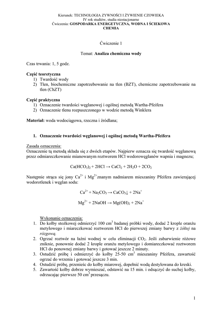 1, 5 godz. Część teoretyczna 1) Twardość wody 2) Tlen, biochemiczn