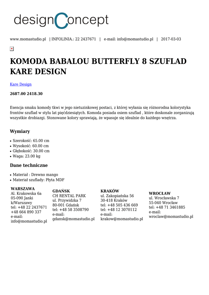 www.momastudio.pl | INFOLINIA.: 22 2437671 | e-mail: [email protected] | 2017-03-03 KOMODA BABALOU BUTTERFLY 8 SZUFLAD KARE DESIGN Kare Design 2687.00 2418.30 Esencja smaku komody tkwi w jego nietuzinkowej postaci, z której wyłania się różnorodna kolorystyka frontów szuflad w stylu lat pięćdziesiątych. Komoda posiada osiem szuflad , które doskonale zorganizują wszystkie drobiazgi. Stonowane kolory sprawiają, że wpasuje się idealnie do każdego wnętrza. Wymiary ● ● ● ● Szerokość: 65.00 cm Wysokość: 60.00 cm Głębokość: 30.00 cm Waga: 23.00 kg Dane techniczne ● ● Materiał : Drewno mango Materiał szuflady: Płyta MDF WARSZAWA Al. Krakowska 6a 05-090 Janki k/Warszawy tel: +48 22 2437671 +48 664 890 337 e-mail: [email protected] GDAŃSK CH RENTAL PARK ul. Przywidzka 7 80-001 Gdańsk tel: +48 58 3508790 e-mail: [email protected] KRAKÓW ul. Zakopiańska 56 30-418 Kraków tel: +48 505 436 669 tel: +48 12 3070112 e-mail: [email protected] WROCŁAW ul. Wrocławska 7 55-040 Wrocław tel: +48 71 3461885 e-mail: [email protected]