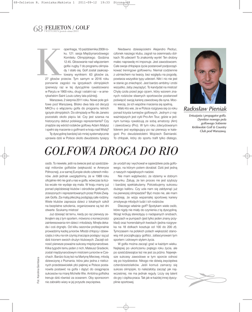 68-felieton R. Pieniaka:Makieta 1 2011-09-12 19:33 Strona 68 68 FELIETON / GOLF WITTCHEN/jesień–zima 2011 K openhaga, 10 października 2009 roku. 121. sesja Międzynarodowego Komitetu Olimpijskiego. Godzina 12.45. Głosowanie nad włączeniem golfa i rugby 7 do programu olimpiady. I stało się. Golf został zaakceptowany wynikiem: 63 głosów za, 27 głosów przeciw. Tym samym w 2016 roku ponownie zagości na igrzyskach olimpijskich (pierwszy raz w tej dyscyplinie rywalizowano w Paryżu w 1900 roku, drugi i ostatni raz – w amerykańskim Saint Louis cztery lata później). Warszawa, 2 sierpnia 2011 roku. Nowe pole golfowe pod Warszawą. Blisko dwa lata od decyzji MKOl-u o włączeniu golfa do programu letnich igrzysk olimpijskich. Do olimpiady w Rio de Janeiro pozostało około pięciu lat. Czy jest szansa na historyczny debiut polskiego reprezentanta? Czy znajdzie się wśród rodaków golfowy Adam Małysz i spełni się marzenie o golfmanii w kraju nad Wisłą? Tę dyscyplinę bardziej lub mniej systematycznie uprawia dziś w Polsce około dwudziestu tysięcy Niedawno dziesięcioletni Alejandro Pedryc, członek naszego klubu, zagrał na osiemnastu dołkach 76 uderzeń! To znakomity wynik! Ten drobny malec naprawdę mi imponuje. Jest zawodowcem. Całe swoje chłopięce życie postanowił podporządkować treningowi golfowemu. Niemal codziennie z uśmiechem na twarzy, bez względu na pogodę, powtarza wszystkie typy uderzeń. Nikt i nic nie jest w stanie go zniechęcić. Jest bardzo ambitny i zrobi wszystko, żeby zwyciężyć. To kandydat na mistrza! Chylę czoła przed jego ojcem, który wzorem znanych rodziców sławnych sportowców postanowił poświęcić swoją karierę zawodową dla syna. Mocno wierzę, że ich wspólne marzenia się spełnią. Mało kto wie, że w Polsce rozgrywa się co roku ponad trzysta turniejów golfowych. Jednym z najważniejszych jest cykl Pro-Am Tour, gdzie w jednym turnieju rywalizują ze sobą amatorzy (Am) i zawodowcy (Pro). W tym roku zdecydowanym liderem jest występujący po raz pierwszy w kategorii Pro dwudziestoletni Wojciech Świniarski. To chłopak, który do sportu trafił tylko dlatego, Fot. Karolina Gembara GOLFOWA DROGA DO RIO osób. To niewiele, jeśli na świecie jest aż sześćdziesiąt milionów golfistów (większość w Ameryce Północnej), a w samej Europie około czterech milionów. Jeśli jednak uwzględnimy, że w 1989 roku oficjalnie nikt nie grał u nas w golfa, wówczas ta liczba wcale nie wydaje się mała. W kraju mamy już ponad pięćdziesiąt klubów i ośrodków golfowych, zrzeszonych i reprezentowanych przez Polski Związek Golfa. Za małą piłeczką podążają całe rodziny. Wiele klubów zaprasza dzieci z lokalnych szkół na bezpłatne szkolenia, organizowane są też dni otwarte. Szukamy mistrza! Już dziesięć lat temu, kiedy po raz pierwszy zetknąłem się z tym sportem, mówiono o konieczności zainteresowania nim dzieci i młodzieży. Minęła dekada i coś drgnęło. Od kilku sezonów profesjonalnie prowadzimy kadrę juniorów. Młodzi chłopcy i dziewczęta z roku na rok czynią znaczące postępy i są już dziś trzonem swoich drużyn klubowych. Zaczęli odnosić pierwsze poważne sukcesy międzynarodowe. Kilka tygodni temu jeden z nich, Mateusz Gradecki, został międzynarodowym mistrzem juniorów w Czechach. Bardzo liczę też na Martynę Mierzwę, młodą dziewczynę z Poznania, która jako jedna z nielicznych przedstawicielek płci pięknej w Polsce postanowiła postawić na golfa i dążyć do osiągnięcia sukcesów na miarę Michelle Wie. Ambitna golfistka trenuje dziś również za oceanem. Oby sponsorom nie zabrakło wiary w jej przyszłe zwycięstwa. że urodził się i wychował w sąsiedztwie pola golfowego, na którym potem dorabiał. Dziś jest jedną z naszych największych nadziei. Nie mam wątpliwości, że idziemy w dobrym kierunku. Żałuję, że ten proces nie jest szybszy i bardziej spektakularny. Potrzebujemy sukcesu dużego kalibru. Czy uda nam się zabłysnąć już na pierwszej olimpiadzie? Być może nie, ale mam nadzieję, że wizja wspaniałej sportowej kariery zmotywuje młodych ludzi i ich rodziców. Dlaczego właśnie golf? Spotykam wiele osób, które nigdy nie miały do czynienia z tą dyscypliną. Wciąż królują stereotypy o nadąsanych snobach, graczach w pumpach (jest tylko jeden znany przykład) oraz horrendalnych kwotach (jedna rozgrywka na 18 dołkach kosztuje od 100 do 200 zł). Tymczasem na polskich polach większość stanowią mili początkujący golfiści, zafascynowani tym sportem i zdrowym stylem życia. W golfa można zacząć grać w każdym wieku. Najlepiej po ukończeniu piątego roku życia, ale po sześćdziesiątce też nie jest za późno. Największe sukcesy zawodowe w tym sporcie odnosi się po trzydziestce. Nikogo nie dziwią zwycięstwa czterdziestolatków. Jeśli komuś zamarzy się sukces olimpijski, to należałoby zacząć jak najwcześniej, nie ma jednak reguły. Liczy się talent do gry i ciężka praca. Tak jak w każdej innej dyscyplinie sportowej. Radosław Pieniak Entuzjasta i propagator golfa. Dyrektor nowego pola golfowego Sobienie Królewskie Golf & Country Club pod Warszawą.