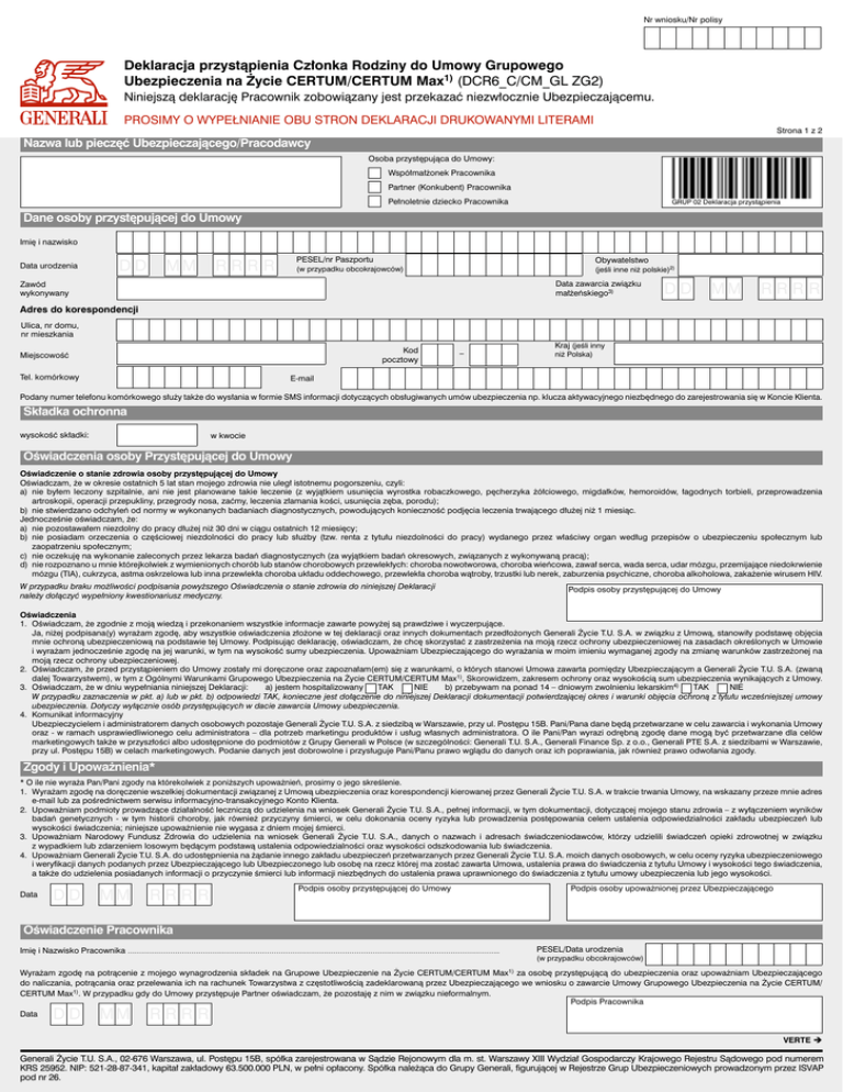 Nr wniosku/Nr polisy Deklaracja przystąpienia Członka Rodziny do Umowy Grupowego Ubezpieczenia na Życie CERTUM/CERTUM Max1) (DCR6_C/CM_GL ZG2) Niniejszą deklarację Pracownik zobowiązany jest przekazać niezwłocznie Ubezpieczającemu. PROSIMY O WYPEŁNIANIE OBU STRON DEKLARACJI DRUKOWANYMI LITERAMI Strona 1 z 2 Nazwa lub pieczęć Ubezpieczającego/Pracodawcy Osoba przystępująca do Umowy: Współmałżonek Pracownika Partner (Konkubent) Pracownika Pełnoletnie dziecko Pracownika GRUP 02 Deklaracja przystąpienia Dane osoby przystępującej do Umowy Imię i nazwisko Data urodzenia DD MM PESEL/nr Paszportu RRRR Obywatelstwo (w przypadku obcokrajowców) (jeśli inne niż polskie)2) Data zawarcia związku małżeńskiego3) Zawód wykonywany DD MM RRRR Adres do korespondencji Ulica, nr domu, nr mieszkania Kod pocztowy Miejscowość Tel. komórkowy _ Kraj (jeśli inny niż Polska) E-mail Podany numer telefonu komórkowego służy także do wysłania w formie SMS informacji dotyczących obsługiwanych umów ubezpieczenia np. klucza aktywacyjnego niezbędnego do zarejestrowania się w Koncie Klienta. Składka ochronna wysokość składki: w kwocie Oświadczenia osoby Przystępującej do Umowy Oświadczenie o stanie zdrowia osoby przystępującej do Umowy Oświadczam, że w okresie ostatnich 5 lat stan mojego zdrowia nie uległ istotnemu pogorszeniu, czyli: a) nie byłem leczony szpitalnie, ani nie jest planowane takie leczenie (z wyjątkiem usunięcia wyrostka robaczkowego, pęcherzyka żółciowego, migdałków, hemoroidów, łagodnych torbieli, przeprowadzenia artroskopii, operacji przepukliny, przegrody nosa, zaćmy, leczenia złamania kości, usunięcia zęba, porodu); b) nie stwierdzano odchyleń od normy w wykonanych badaniach diagnostycznych, powodujących konieczność podjęcia leczenia trwającego dłużej niż 1 miesiąc. Jednocześnie oświadczam, że: a) nie pozostawałem niezdolny do pracy dłużej niż 30 dni w ciągu ostatnich 12 miesięcy; b) nie posiadam orzeczenia o częściowej niezdolności do pracy lub służby (tzw. renta z tytułu niezdolności do pracy) wydanego przez właściwy organ według przepisów o ubezpieczeniu społecznym lub zaopatrzeniu społecznym; c) nie oczekuję na wykonanie zaleconych przez lekarza badań diagnostycznych (za wyjątkiem badań okresowych, związanych z wykonywaną pracą); d) nie rozpoznano u mnie którejkolwiek z wymienionych chorób lub stanów chorobowych przewlekłych: choroba nowotworowa, choroba wieńcowa, zawał serca, wada serca, udar mózgu, przemijające niedokrwienie mózgu (TIA), cukrzyca, astma oskrzelowa lub inna przewlekła choroba układu oddechowego, przewlekła choroba wątroby, trzustki lub nerek, zaburzenia psychiczne, choroba alkoholowa, zakażenie wirusem HIV. W przypadku braku możliwości podpisania powyższego Oświadczenia o stanie zdrowia do niniejszej Deklaracji należy dołączyć wypełniony kwestionariusz medyczny. Podpis osoby przystępującej do Umowy Oświadczenia 1. Oświadczam, że zgodnie z moją wiedzą i przekonaniem wszystkie informacje zawarte powyżej są prawdziwe i wyczerpujące. Ja, niżej podpisana(y) wyrażam zgodę, aby wszystkie oświadczenia złożone w tej deklaracji oraz innych dokumentach przedłożonych Generali Życie T.U. S.A. w związku z Umową, stanowiły podstawę objęcia mnie ochroną ubezpieczeniową na podstawie tej Umowy. Podpisując deklarację, oświadczam, że chcę skorzystać z zastrzeżenia na moją rzecz ochrony ubezpieczeniowej na zasadach określonych w Umowie i wyrażam jednocześnie zgodę na jej warunki, w tym na wysokość sumy ubezpieczenia. Upoważniam Ubezpieczającego do wyrażania w moim imieniu wymaganej zgody na zmianę warunków zastrzeżonej na moją rzecz ochrony ubezpieczeniowej. 2. Oświadczam, że przed przystąpieniem do Umowy zostały mi doręczone oraz zapoznałam(em) się z warunkami, o których stanowi Umowa zawarta pomiędzy Ubezpieczającym a Generali Życie T.U. S.A. (zwaną dalej Towarzystwem), w tym z Ogólnymi Warunkami Grupowego Ubezpieczenia na Życie CERTUM/CERTUM Max1), Skorowidzem, zakresem ochrony oraz wysokością sum ubezpieczenia wynikających z Umowy. 3. Oświadczam, że w dniu wypełniania niniejszej Deklaracji: a) jestem hospitalizowany TAK NIE b) przebywam na ponad 14 – dniowym zwolnieniu lekarskim4) TAK NIE W przypadku zaznaczenia w pkt. a) lub w pkt. b) odpowiedzi TAK, konieczne jest dołączenie do niniejszej Deklaracji dokumentacji potwierdzającej okres i warunki objęcia ochroną z tytułu wcześniejszej umowy ubezpieczenia. Dotyczy wyłącznie osób przystępujących w dacie zawarcia Umowy ubezpieczenia. 4. Komunikat informacyjny Ubezpieczycielem i administratorem danych osobowych pozostaje Generali Życie T.U. S.A. z siedzibą w Warszawie, przy ul. Postępu 15B. Pani/Pana dane będą przetwarzane w celu zawarcia i wykonania Umowy oraz - w ramach usprawiedliwionego celu administratora – dla potrzeb marketingu produktów i usług własnych administratora. O ile Pani/Pan wyrazi odrębną zgodę dane mogą być przetwarzane dla celów marketingowych także w przyszłości albo udostępnione do podmiotów z Grupy Generali w Polsce (w szczególności: Generali T.U. S.A., Generali Finance Sp. z o.o., Generali PTE S.A. z siedzibami w Warszawie, przy ul. Postępu 15B) w celach marketingowych. Podanie danych jest dobrowolne i przysługuje Pani/Panu prawo wglądu do danych oraz ich poprawiania, jak również prawo odwołania zgody. Zgody i Upoważnienia* * O ile nie wyraża Pan/Pani zgody na którekolwiek z poniższych upoważnień, prosimy o jego skreślenie. 1. Wyrażam zgodę na doręczenie wszelkiej dokumentacji związanej z Umową ubezpieczenia oraz korespondencji kierowanej przez Generali Życie T.U. S.A. w trakcie trwania Umowy, na wskazany przeze mnie adres e-mail lub za pośrednictwem serwisu informacyjno-transakcyjnego Konto Klienta. 2. Upoważniam podmioty prowadzące działalność leczniczą do udzielenia