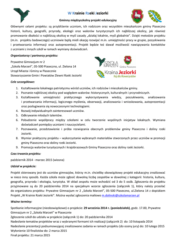 W Krainie Rzeki Jeziorki Gminny międzyszkolny projekt edukacyjny Głównymi celami projektu: są przybliżenie uczniom, ich rodzicom oraz wszystkim mieszkańcom gminy Piaseczno historii, kultury, geografii, przyrody, ekologii oraz walorów turystycznych ich najbliższej okolicy, jak również promowanie dbałości o najbliższą okolicę w myśl zasady „działaj lokalnie, myśl globalnie”. Dzięki metodzie projektu (m.in. projektu badawczego) uczniowie będą mieli okazję rozwijać m.in. umiejętności pracy w grupie, pozyskiwania i przetwarzania informacji oraz autoprezentacji. Projekt będzie też dawał możliwość nawiązywania kontaktów z uczniami z innych szkół w ramach wymiany doświadczeń. Organizatorzy i partnerzy projektu: Prywatne Gimnazjum nr 2 „Szkoła Marzeń”, 05-500 Piaseczno, ul. Zielona 14 Urząd Miasta i Gminy w Piasecznie Stowarzyszenie Gmin i Powiatów Zlewni Rzeki Jeziorki Cele szczegółowe: 1. Kształtowanie lokalnego patriotyzmu wśród uczniów, ich rodziców i mieszkańców gminy. 2. Poznanie najbliższej okolicy pod względem walorów: historycznych, kulturalnych i przyrodniczych. 3. Kształtowanie umiejętności praktycznego wykorzystywania wiedzy, poszukiwania, analizowania i przetwarzania informacji, logicznego myślenia, obserwacji, analizowania i wnioskowania, autoprezentacji oraz posługiwania się nowoczesnymi technologiami. 4. Rozwój indywidualnych zainteresowań uczniów. 5. Odkrywanie młodych talentów. 6. Pobudzenie współpracy między szkołami w celu tworzenie wspólnych inicjatyw lokalnych. Wymiana doświadczeń pomiędzy uczniami i nauczycielami. 7. Poznawanie, przedstawienie i próba rozwiązania obecnych problemów gminy Piaseczno i doliny rzeki Jeziorki. 8. Wymiar praktyczny projektu – wykorzystanie wybranych materiałów stworzonych przez uczniów w promocji gminy Piaseczno oraz doliny rzeki Jeziorki. 9. Promocja walorów turystycznych i krajobrazowych Gminy Piaseczno oraz doliny rzeki Jeziorki. Czas trwania projektu: październik 2014 - marzec 2015 (wiosna) Udział w projekcie: Projekt skierowany jest do uczniów gimnazjów, którzy m.in. chcieliby obowiązkowy projekt edukacyjny zrealizować w nieco inny sposób. Każda szkoła może zgłosić dowolną liczbę zespołów w dowolnej z kategorii: historia, kultura, geografia, przyroda i ekologia, turystyka. W skład zespołu może wchodzić od 3 do 5 osób. Zgłoszenia do projektu przyjmowane są do 20 października 2014 na specjalnym wzorze zgłoszenia (załącznik 1), który należy przesłać do organizatora projektu: Prywatne Gimnazjum nr 2 „Szkoła Marzeń”, 05-500 Piaseczno, ul.Zielona 14 z dopiskiem Projekt „W Krainie Rzeki Jeziorki”. Można wysłać zgłoszenia mailowo [email protected] Ważne terminy: Spotkanie informacyjne (nieobowiązkowe) o projekcie: 29 września 2014 r. (poniedziałek), godz. 17.00, Prywatne Gimnazjum nr 2 „Szkoła Marzeń” w Piasecznie Zgłoszenie szkół do udziału w projekcie (załącznik 1) do: 20 października 2014 Nadesłanie tematów projektów wraz z wybranymi formami ich realizacji (załącznik 2) do: 10 listopada 2014 Nadesłanie prezentacji podsumowującej zrealizowane zadania w ramach projektu (do oceny jury) do: 10 lutego 2015 Wyłonienie 10 finalistów do: 2 marca 2015 Finał projektu: 21 marca 2015 Działania w ramach projektu: Spotkanie informacyjne dla nauczycieli oraz zainteresowanych uczniów. Uruchomienie forum projektu na Facebooku (aktywność szkół na Facebooku: zdjęcia, krótkie relacje z działań). Uruchomienie forum dla nauczycieli uczestniczących w projekcie. Otwarta konferencja podsumowująca projekt – Wielki Finał (stanowiska dla zespołów tak, aby mogły się zaprezentować, wykłady, debaty, konkursy). Możliwe obszary realizacji: Zespoły chcące wziąć udział w projekcie mogą wybrać temat z zaproponowanych kategorii lub zaproponować własny temat projektu związany z jedną z kategorii: historia, kultura, geografia, przyroda i ekologia, turystyka. Najważniejsze jest, aby temat projektu związany był z gminą Piaseczno lub doliną rzeki Jeziorki. Historia 1. 2. 3. 4. 5. 6. Wczesne osadnictwo Miejsca pamięci znane i nieznane Oblicza I i II wojny światowej Moja okolica wczoraj i dziś Nieznani bohaterowie W świetle wydarzeń rocznicowych Kultura 1. 2. 3. 4. Tradycje i zwyczaje regionu Wielokulturowość Baśnie i legendy Mój pomysł na imprezę kulturalną Geografia 1. 2. 3. 4. 5. Wody powierzchniowe i podziemne i ich pochodzenie Zjawiska atmosferyczne, nasłonecznienie, pogoda, klimat Układ demograficzny miast i wsi Przemysł wczoraj i dziś Małe, większe, największe Przyroda i ekologia 1. Jaka jest nasza Jeziorka? (Co najmniej raz w tygodniu monitorowanie stanu rzeki Jeziorki i jej otoczenia – temperatura powietrza, kierunek i prędkość wiatru, ilość opadów, poziom wody w korycie rzeki, parametry fizyko-chemiczne wody (m.in. temperatura, mętność, azotany, fosforany, pH, metale ciężkie, twardość), obserwacja fauny i flory w okolicy rzeki Jeziorki 2. Odnawialne źródła energii i możliwość ich zastosowania na terenie Krainy Jeziorki 3. Sortować czy nie? Czyli wszystko, co powinniśmy wiedzieć o recyklingu Turystyka 1. 2. 3. 4. 5. Walory turystyczno-krajoznawcze regionu (zabytki architektury, rezerwaty przyrody, miejsca historyczne) Atrakcyjne miejsca do spędzania wolnego czasu Moje ulubione szlaki rowerowe, spacerowe, biegowe, rolkowe Ścieżka zdrowia Mój wymarzony plac zabaw, park, miejsce do wypoczynku Sposób realizacji projektu Uczestnicy, przygotowując swój projekt, mogą wykorzystywać różnorodne formy, tak aby ich projekt był ciekawy, ale jednocześnie stanowił pewną całość w ramach wybranego tematu. Nie jest określone tempo pracy nad projektem, ale liczą się rezultaty (bardziej ciekawy i rozbudowany projekt ma większe szanse na zwycięstwo w konkursie). Ważne jest, aby przestrzegać terminów wynikających z regulaminu: nadesłać