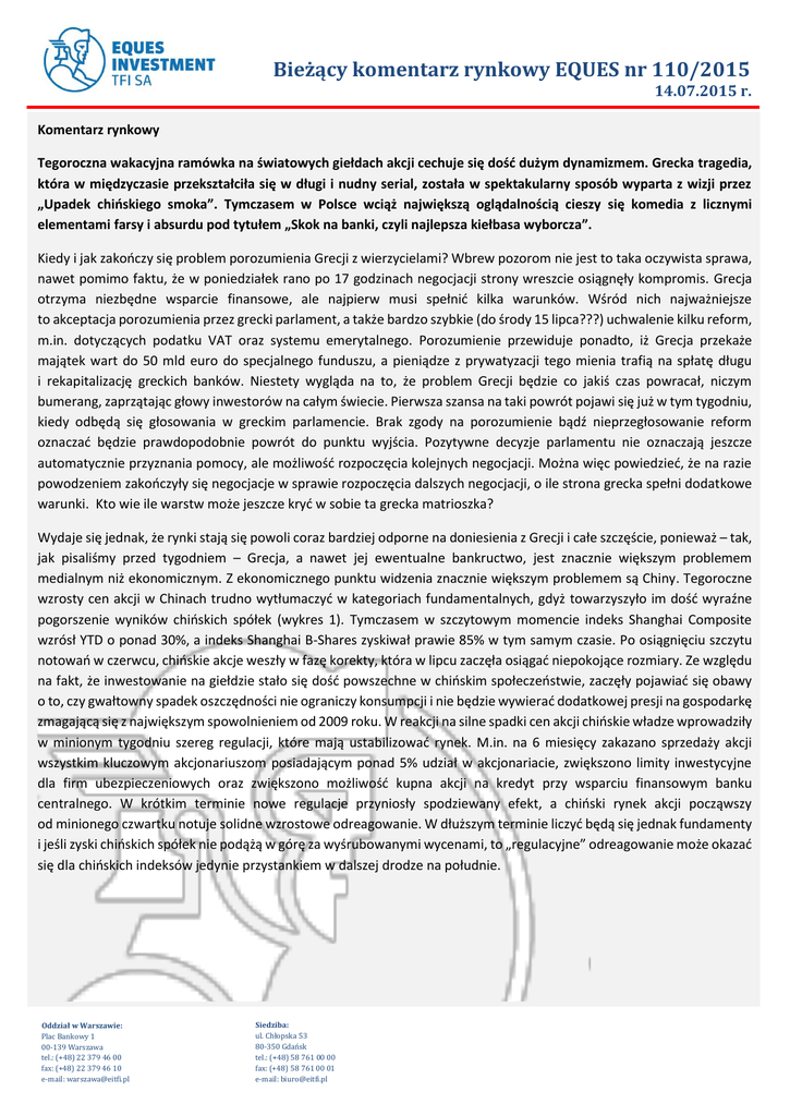 Bieżący komentarz rynkowy EQUES nr 110/2015 14.07.2015 r. Komentarz rynkowy Tegoroczna wakacyjna ramówka na światowych giełdach akcji cechuje się dość dużym dynamizmem. Grecka tragedia, która w międzyczasie przekształciła się w długi i nudny serial, została w spektakularny sposób wyparta z wizji przez „Upadek chińskiego smoka”. Tymczasem w Polsce wciąż największą oglądalnością cieszy się komedia z licznymi elementami farsy i absurdu pod tytułem „Skok na banki, czyli najlepsza kiełbasa wyborcza”. Kiedy i jak zakończy się problem porozumienia Grecji z wierzycielami? Wbrew pozorom nie jest to taka oczywista sprawa, nawet pomimo faktu, że w poniedziałek rano po 17 godzinach negocjacji strony wreszcie osiągnęły kompromis. Grecja otrzyma niezbędne wsparcie finansowe, ale najpierw musi spełnić kilka warunków. Wśród nich najważniejsze to akceptacja porozumienia przez grecki parlament, a także bardzo szybkie (do środy 15 lipca???) uchwalenie kilku reform, m.in. dotyczących podatku VAT oraz systemu emerytalnego. Porozumienie przewiduje ponadto, iż Grecja przekaże majątek wart do 50 mld euro do specjalnego funduszu, a pieniądze z prywatyzacji tego mienia trafią na spłatę długu i rekapitalizację greckich banków. Niestety wygląda na to, że problem Grecji będzie co jakiś czas powracał, niczym bumerang, zaprzątając głowy inwestorów na całym świecie. Pierwsza szansa na taki powrót pojawi się już w tym tygodniu, kiedy odbędą się głosowania w greckim parlamencie. Brak zgody na porozumienie bądź nieprzegłosowanie reform oznaczać będzie prawdopodobnie powrót do punktu wyjścia. Pozytywne decyzje parlamentu nie oznaczają jeszcze automatycznie przyznania pomocy, ale możliwość rozpoczęcia kolejnych negocjacji. Można więc powiedzieć, że na razie powodzeniem zakończyły się negocjacje w sprawie rozpoczęcia dalszych negocjacji, o ile strona grecka spełni dodatkowe warunki. Kto wie ile warstw może jeszcze kryć w sobie ta grecka matrioszka? Wydaje się jednak, że rynki stają się powoli coraz bardziej odporne na doniesienia z Grecji i całe szczęście, ponieważ – tak, jak pisaliśmy przed tygodniem – Grecja, a nawet jej ewentualne bankructwo, jest znacznie większym problemem medialnym niż ekonomicznym. Z ekonomicznego punktu widzenia znacznie większym problemem są Chiny. Tegoroczne wzrosty cen akcji w Chinach trudno wytłumaczyć w kategoriach fundamentalnych, gdyż towarzyszyło im dość wyraźne pogorszenie wyników chińskich spółek (wykres 1). Tymczasem w szczytowym momencie indeks Shanghai Composite wzrósł YTD o ponad 30%, a indeks Shanghai B-Shares zyskiwał prawie 85% w tym samym czasie. Po osiągnięciu szczytu notowań w czerwcu, chińskie akcje weszły w fazę korekty, która w lipcu zaczęła osiągać niepokojące rozmiary. Ze względu na fakt, że inwestowanie na giełdzie stało się dość powszechne w chińskim społeczeństwie, zaczęły pojawiać się obawy o to, czy gwałtowny spadek oszczędności nie ograniczy konsumpcji i nie będzie wywierać dodatkowej presji na gospodarkę zmagającą się z największym spowolnieniem od 2009 roku. W reakcji na silne spadki cen akcji chińskie władze wprowadziły w minionym tygodniu szereg regulacji, które mają ustabilizować rynek. M.in. na 6 miesięcy zakazano sprzedaży akcji wszystkim kluczowym akcjonariuszom posiadającym ponad 5% udział w akcjonariacie, zwiększono limity inwestycyjne dla firm ubezpieczeniowych oraz zwiększono możliwość kupna akcji na kredyt przy wsparciu finansowym banku centralnego. W krótkim terminie nowe regulacje przyniosły spodziewany efekt, a chiński rynek akcji począwszy od minionego czwartku notuje solidne wzrostowe odreagowanie. W dłuższym terminie liczyć będą się jednak fundamenty i jeśli zyski chińskich spółek nie podążą w górę za wyśrubowanymi wycenami, to „regulacyjne” odreagowanie może okazać się dla chińskich indeksów jedynie przystankiem w dalszej drodze na południe. Oddział w Warszawie: Plac Bankowy 1 00-139 Warszawa tel.: (+48) 22 379 46 00 fax: (+48) 22 379 46 10 e-mail: [email protected] Siedziba: ul. Chłopska 53 80-350 Gdańsk tel.: (+48) 58 761 00 00 fax: (+48) 58 761 00 01 e-mail: [email protected] Bieżący komentarz rynkowy EQUES nr 110/2015 14.07.2015 r. Wykres 1: Indeks Shanghai Composite i wynik EBITDA dla spółek wchodzących w skład indeksu. Źródło: IronFX. Pomimo opisanych powyżej czynników ryzyka wydaje się, że hossa na światowych rynkach akcji będzie kontynuowana. Dotyczy to w szczególności rynków w Europie Zachodniej, a także w USA. W Europie motorem wzrostu powinna być ożywiająca się gospodarka, a także wsparcie ze strony ECB. Z kolei w USA gospodarka również wydaje się przyspieszać po spowolnieniu w I kwartale br.. Grecja wprawdzie może jeszcze postraszyć, ale inwestorzy stają się coraz bardziej odporni na doniesienia z tego niewielkiego w sensie ekonomicznym zakątka Europy. Ewentualna kontynuacja spadków w Chinach może z kolei mieć negatywny wpływ na sentyment, ale raczej tylko krótkoterminowo. Zachowanie akcji na chińskiej giełdzie dość rzadko odzwierciedla trendy zachodzące w gospodarce, a silne piętno na notowaniach odciskają decyzje urzędników dotyczące zmian w regulacjach rynku. To właśnie decyzje o stopniowej liberalizacji rynku stały za wzrostami cen chińskich akcji na przestrzeni ostatnich miesięcy. Trudno także oczekiwać, aby spadki na chińskiej giełdzie spowodowały ograniczenie konsumpcji w Chinach, skoro wcześniej nie zauważono wpływu kilkumiesięcznej hossy na jej wzrost. Popularność giełdy wśród chińskich gospodarstw domowych wzrosła w ostatnim czasie, jednak z ostatnich badań wynika, że wciąż tylko 9% miejskich gospodarstw domowych posiada oszczędności ulokowane w akcjach (dla porównania w USA połowa wszystkich gospodarstw domowych posiada oszczędności ul