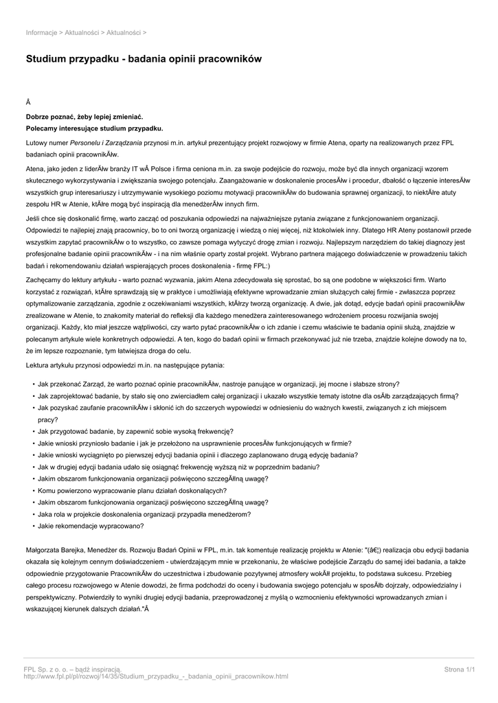 Informacje > Aktualności > Aktualności > Studium przypadku - badania opinii pracowników  Dobrze poznać, żeby lepiej zmieniać. Polecamy interesujące studium przypadku. Lutowy numer Personelu i Zarządzania przynosi m.in. artykuł prezentujący projekt rozwojowy w firmie Atena, oparty na realizowanych przez FPL badaniach opinii pracownikĂłw. Atena, jako jeden z liderĂłw branży IT w Polsce i firma ceniona m.in. za swoje podejście do rozwoju, może być dla innych organizacji wzorem skutecznego wykorzystywania i zwiększania swojego potencjału. Zaangażowanie w doskonalenie procesĂłw i procedur, dbałość o łączenie interesĂłw wszystkich grup interesariuszy i utrzymywanie wysokiego poziomu motywacji pracownikĂłw do budowania sprawnej organizacji, to niektĂłre atuty zespołu HR w Atenie, ktĂłre mogą być inspiracją dla menedżerĂłw innych firm. Jeśli chce się doskonalić firmę, warto zacząć od poszukania odpowiedzi na najważniejsze pytania związane z funkcjonowaniem organizacji. Odpowiedzi te najlepiej znają pracownicy, bo to oni tworzą organizację i wiedzą o niej więcej, niż ktokolwiek inny. Dlatego HR Ateny postanowił przede wszystkim zapytać pracownikĂłw o to wszystko, co zawsze pomaga wytyczyć drogę zmian i rozwoju. Najlepszym narzędziem do takiej diagnozy jest profesjonalne badanie opinii pracownikĂłw - i na nim właśnie oparty został projekt. Wybrano partnera mającego doświadczenie w prowadzeniu takich badań i rekomendowaniu działań wspierających proces doskonalenia - firmę FPL:) Zachęcamy do lektury artykułu - warto poznać wyzwania, jakim Atena zdecydowała się sprostać, bo są one podobne w większości firm. Warto korzystać z rozwiązań, ktĂłre sprawdzają się w praktyce i umożliwiają efektywne wprowadzanie zmian służących całej firmie - zwłaszcza poprzez optymalizowanie zarządzania, zgodnie z oczekiwaniami wszystkich, ktĂłrzy tworzą organizację. A dwie, jak dotąd, edycje badań opinii pracownikĂłw zrealizowane w Atenie, to znakomity materiał do refleksji dla każdego menedżera zainteresowanego wdrożeniem procesu rozwijania swojej organizacji. Każdy, kto miał jeszcze wątpliwości, czy warto pytać pracownikĂłw o ich zdanie i czemu właściwie te badania opinii służą, znajdzie w polecanym artykule wiele konkretnych odpowiedzi. A ten, kogo do badań opinii w firmach przekonywać już nie trzeba, znajdzie kolejne dowody na to, że im lepsze rozpoznanie, tym łatwiejsza droga do celu. Lektura artykułu przynosi odpowiedzi m.in. na następujące pytania: • Jak przekonać Zarząd, że warto poznać opinie pracownikĂłw, nastroje panujące w organizacji, jej mocne i słabsze strony? • Jak zaprojektować badanie, by stało się ono zwierciadłem całej organizacji i ukazało wszystkie tematy istotne dla osĂłb zarządzających firmą? • Jak pozyskać zaufanie pracownikĂłw i skłonić ich do szczerych wypowiedzi w odniesieniu do ważnych kwestii, związanych z ich miejscem pracy? • Jak przygotować badanie, by zapewnić sobie wysoką frekwencję? • Jakie wnioski przyniosło badanie i jak je przełożono na usprawnienie procesĂłw funkcjonujących w firmie? • Jakie wnioski wyciągnięto po pierwszej edycji badania opinii i dlaczego zaplanowano drugą edycję badania? • Jak w drugiej edycji badania udało się osiągnąć frekwencję wyższą niż w poprzednim badaniu? • Jakim obszarom funkcjonowania organizacji poświęcono szczegĂłlną uwagę? • Komu powierzono wypracowanie planu działań doskonalących? • Jakim obszarom funkcjonowania organizacji poświęcono szczegĂłlną uwagę? • Jaka rola w projekcie doskonalenia organizacji przypadła menedżerom? • Jakie rekomendacje wypracowano? Małgorzata Barejka, Menedżer ds. Rozwoju Badań Opinii w FPL, m.in. tak komentuje realizację projektu w Atenie: "(…) realizacja obu edycji badania okazała się kolejnym cennym doświadczeniem - utwierdzającym mnie w przekonaniu, że właściwe podejście Zarządu do samej idei badania, a także odpowiednie przygotowanie PracownikĂłw do uczestnictwa i zbudowanie pozytywnej atmosfery wokĂłł projektu, to podstawa sukcesu. Przebieg całego procesu rozwojowego w Atenie dowodzi, że firma podchodzi do oceny i budowania swojego potencjału w sposĂłb dojrzały, odpowiedzialny i perspektywiczny. Potwierdziły to wyniki drugiej edycji badania, przeprowadzonej z myślą o wzmocnieniu efektywności wprowadzanych zmian i wskazującej kierunek dalszych działań." FPL Sp. z o. o. – bądź inspiracją. http://www.fpl.pl/pl/rozwoj/14/35/Studium_przypadku_-_badania_opinii_pracownikow.html Strona 1/1