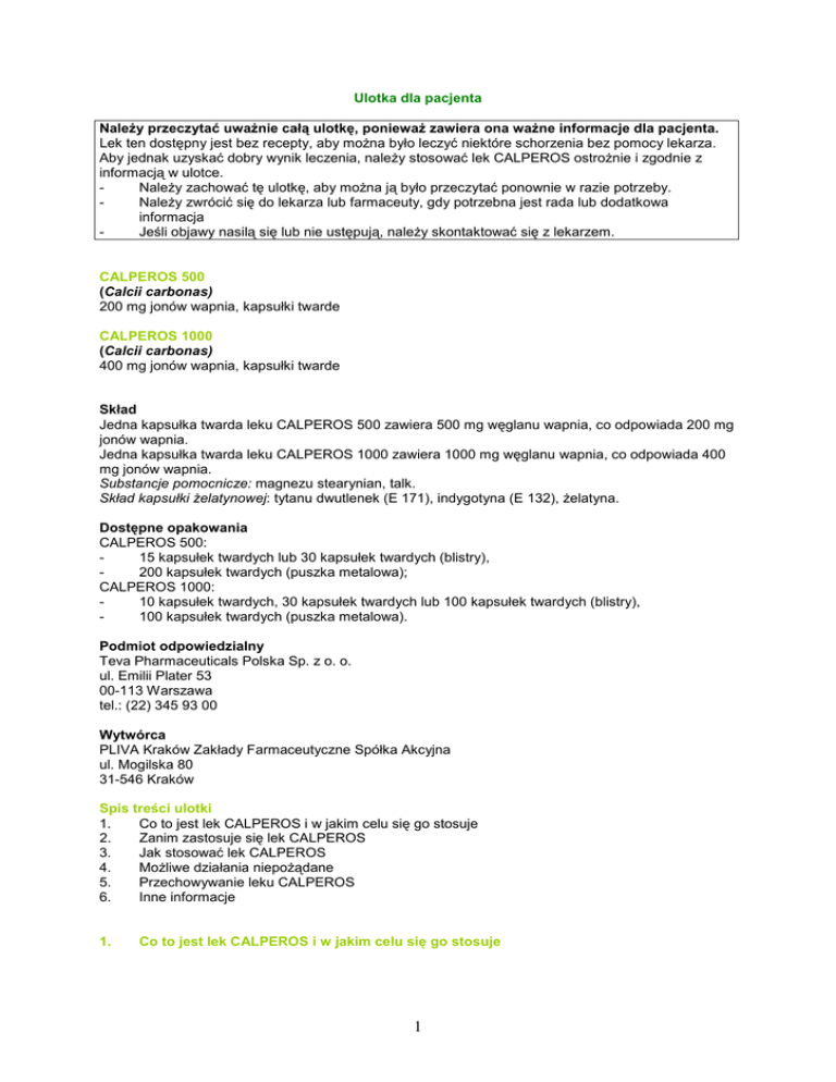 Ulotka dla pacjenta NaleŜy przeczytać uwaŜnie całą ulotkę, poniewaŜ zawiera ona waŜne informacje dla pacjenta. Lek ten dostępny jest bez recepty, aby moŜna było leczyć niektóre schorzenia bez pomocy lekarza. Aby jednak uzyskać dobry wynik leczenia, naleŜy stosować lek CALPEROS ostroŜnie i zgodnie z informacją w ulotce. NaleŜy zachować tę ulotkę, aby moŜna ją było przeczytać ponownie w razie potrzeby. NaleŜy zwrócić się do lekarza lub farmaceuty, gdy potrzebna jest rada lub dodatkowa informacja Jeśli objawy nasilą się lub nie ustępują, naleŜy skontaktować się z lekarzem. CALPEROS 500 (Calcii carbonas) 200 mg jonów wapnia, kapsułki twarde CALPEROS 1000 (Calcii carbonas) 400 mg jonów wapnia, kapsułki twarde Skład Jedna kapsułka twarda leku CALPEROS 500 zawiera 500 mg węglanu wapnia, co odpowiada 200 mg jonów wapnia. Jedna kapsułka twarda leku CALPEROS 1000 zawiera 1000 mg węglanu wapnia, co odpowiada 400 mg jonów wapnia. Substancje pomocnicze: magnezu stearynian, talk. Skład kapsułki Ŝelatynowej: tytanu dwutlenek (E 171), indygotyna (E 132), Ŝelatyna. Dostępne opakowania CALPEROS 500: 15 kapsułek twardych lub 30 kapsułek twardych (blistry), 200 kapsułek twardych (puszka metalowa); CALPEROS 1000: 10 kapsułek twardych, 30 kapsułek twardych lub 100 kapsułek twardych (blistry), 100 kapsułek twardych (puszka metalowa). Podmiot odpowiedzialny Teva Pharmaceuticals Polska Sp. z o. o. ul. Emilii Plater 53 00-113 Warszawa tel.: (22) 345 93 00 Wytwórca PLIVA Kraków Zakłady Farmaceutyczne Spółka Akcyjna ul. Mogilska 80 31-546 Kraków Spis treści ulotki 1. Co to jest lek CALPEROS i w jakim celu się go stosuje 2. Zanim zastosuje się lek CALPEROS 3. Jak stosować lek CALPEROS 4. MoŜliwe działania niepoŜądane 5. Przechowywanie leku CALPEROS 6. Inne informacje 1. Co to jest lek CALPEROS i w jakim celu się go stosuje 1 CALPEROS 500 i CALPEROS 1000 zawierają węglan wapnia, który jest dla organizmu źródłem wapnia zjonizowanego. Wapń jest pierwiastkiem biorącym udział w tworzeniu i mineralizacji tkanki kostnej na przestrzeni całego Ŝycia człowieka. Warunkuje prawidłowe przewodnictwo nerwowe i kurczliwość mięśni poprzecznie prąŜkowanych. Utrzymuje równowagę elektrolitową organizmu, wpływa równieŜ na sprawność pracy mięśnia sercowego. Uczestniczy w procesie krzepnięcia krwi. Wpływa na aktywność szeregu enzymów, pełni teŜ rolę przekaźnika, dzięki któremu bodźce chemiczne, fizyczne lub hormonalne ulegają przekształceniu w określony efekt biologiczny. Dzięki właściwości zmniejszania przepuszczalności ścian naczyń krwionośnych wapń działa przeciwzapalnie, przeciwobrzękowo i przeciwalergicznie. Węglan wapnia zawarty w preparatach CALPEROS pomaga pokryć dzienne zapotrzebowanie na wapń, zmniejsza utratę wapnia z układu kostnego u kobiet w okresie około- i postmenopauzalnym oraz u wszystkich osób w podeszłym wieku. Zapobiega wystąpieniu zmian kostnych w przebiegu przewlekłej niewydolności nerek. Wpływa łagodząco na odczyny alergiczne na powierzchni skóry i błon śluzowych. Wskazaniami do stosowania są: • stany zwiększonego zapotrzebowania na wapń: okres intensywnego wzrostu u dzieci i młodzieŜy oraz w przebiegu ciąŜy i podczas laktacji; • nieprawidłowe Ŝywienie produktami ubogimi w wapń; • zaburzenia wchłaniania zwrotnego wapnia z kanalików nerkowych; • zmniejszone stęŜenie wapnia we krwi z podwyŜszonym stęŜeniem fosforu u pacjentów z przewlekłą niewydolnością nerek, poddawanych dializom i zapobieganie wzmoŜonej pobudliwości nerwowo-mięśniowej; • profilaktycznie w zapobieganiu i uzupełniająco w kompleksowym leczeniu osteoporozy; • stany po długotrwałym unieruchomieniu i okres rekonwalescencji po złamaniach kości; • wspomagająco w leczeniu przeziębień i chorób alergicznych. 2. Zanim zastosuje się lek CALPEROS Nie naleŜy zaŜywać leku CALPEROS w następujących przypadkach: • nadwraŜliwość na którykolwiek składnik preparatu; • zwiększone stęŜenie wapnia we krwi i nadmierne wydalanie wapnia w moczu, np. w nadczynności tarczycy, przytarczyc, przedawkowaniu witaminy D3, nowotworach odwapniających, takich jak szpiczaki i nowotworach dających przerzuty do kości, w cięŜkiej niewydolności nerek nie leczonej dializami; • kamica nerkowa; • leczenie glikozydami nasercowymi; • cięŜka hiperkalciuria (mocz z nadmierną ilością wydalanego wapnia). Zachować szczególną ostroŜność stosując lek CALPEROS: W przypadku przewlekłej niewydolności nerek konieczna jest kontrola stęŜenia wapnia i fosforu we krwi podczas stosowania leku. Podczas stosowania duŜych dawek, zwłaszcza z jednoczesnym przyjmowaniem preparatów witaminy D, nie moŜna wykluczyć ryzyka wystąpienia nadmiernego stęŜenia wapnia we krwi z następowym uszkodzeniem nerek, dlatego u takich pacjentów naleŜy kontrolować stęŜenie wapnia w surowicy krwi i czynność nerek. Pacjenci leczeni glikozydami nasercowymi przed zastosowaniem preparatów wapnia powinni poradzić się lekarza, gdyŜ jednoczesne przyjmowanie obu leków moŜe nasilić działanie glikozydów na serce i spowodować ryzyko zaburzeń rytmu. Stosowanie leku CALPEROS z jedzeniem i piciem: Zaleca się stosowanie leku w czasie posiłku. CiąŜa: Przed zastosowaniem kaŜdego leku naleŜy poradzić się lekarza. W okresie ciąŜy wzrasta zapotrzebowanie na wapń. Przy stosowaniu dawek leczniczych nie wykazano ryzyka zagroŜenia dla płodu i noworodka. Karmienie piersią: 2 Przed zastosowaniem kaŜdego leku naleŜy poradzić się lekarza. W okresie laktacji wzrasta zapotrzebowanie na wapń. Przy stosowaniu dawek leczniczych nie wykazano ryzyka zagroŜenia dla płodu i noworodka. Prowadzenie pojazdów i obsługa maszyn: Lek nie wpływa na zdolność prowadzenia pojazdów i obsługi urządzeń mechanicznych w ruchu. Stosowanie innych leków: Moczopędne leki tiazydowe zwiększają wch