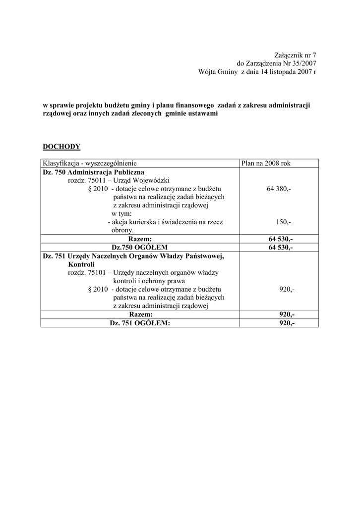 Załącznik nr 7 do Zarządzenia Nr 35/2007 Wójta Gminy z dnia 14 listopada 2007 r w sprawie projektu budŜetu gminy i planu finansowego zadań z zakresu administracji rządowej oraz innych zadań zleconych gminie ustawami DOCHODY Klasyfikacja - wyszczególnienie Dz. 750 Administracja Publiczna rozdz. 75011 – Urząd Wojewódzki § 2010 - dotacje celowe otrzymane z budŜetu państwa na realizację zadań bieŜących z zakresu administracji rządowej w tym: - akcja kurierska i świadczenia na rzecz obrony. Razem: Dz.750 OGÓŁEM Dz. 751 Urzędy Naczelnych Organów Władzy Państwowej, Kontroli rozdz. 75101 – Urzędy naczelnych organów władzy kontroli i ochrony prawa § 2010 - dotacje celowe otrzymane z budŜetu państwa na realizację zadań bieŜących z zakresu administracji rządowej Razem: Dz. 751 OGÓŁEM: Plan na 2008 rok 64 380,- 150,64 530,64 530,- 920,- 920,920,- Dz. 754 Bezpieczeństwo Publiczne i Ochrona PrzeciwpoŜarowa rozdz. 75414 – Obrona cywilna § 2010 - dotacje celowe otrzymane z budŜetu państwa na realizację zadań bieŜących z zakresu administracji rządowej Razem: Dz. 754 OGÓŁEM: Dz. 852 Opieka Społeczna rozdz. 85212 – Świadczenia rodzinne, zaliczki alimentacyjne oraz składki na ubezpieczenie emerytalne i rentowe z ubezpieczenia społecznego § 2010 - dotacje celowe otrzymane z budŜetu państwa na realizację zadań bieŜących z zakresu administracji rządowej Razem: rozdz. 85213 – Składki na ubezpieczenie zdrowotne opłacone za osoby pobierające niektóre świadczenia z pomocy społecznej oraz niektóre świadczeni rodzinne § 2010 - dotacje celowe otrzymane z budŜetu państwa na realizację zadań bieŜących z zakresu administracji rządowej Razem: rozdz. 85214 – Zasiłki i pomoc w naturze oraz składki na ubezpieczenie społeczne § 2010 - dotacje celowe otrzymane z budŜetu państwa na realizację zadań bieŜących z zakresu administracji rządowej Razem: Dz. 852 OGÓŁEM: DOCHODY OGÓŁEM: 700,700,700,- 1 857 910,- 1 857 910,- 10 800,- 10 800 ,- 120 086,120 0861 988 796,2 054 946,- WYDATKI Klasyfikacja wyszczególnienie Plan na 2008r Dz. 750 Administracja Publiczna rozdz. 75011 – Urzędy Wojewódzkie § 4010 – wynagrodzenia osobowe pracowników 44 904,§ 4040 – dodatkowe wynagrodzenia roczne 4 896,§ 4110 – składki na ubezpieczenia społeczne 7 115,1 085,§ 4120 – składki na Fundusz Pracy § 4210 – zakupy materiałów i wyposaŜenia 936,§ 4300 – zakup usług pozostałych 1 764,§ 4370 – opłaty z tytułu zakupu usług telekomunikacyjnych telefonii stacjonarnej 500,566,§ 4410 – zwrot kosztów podróŜy słuŜbowych § 4440 – odpis na zakładowy fundusz świadczeń socjalnych 1 863,§ 4740 - zakup materiałów papierniczych do sprzętu drukarskiego 901,64 530Razem: Dz.750 OGÓŁEM 64 530,Dz. 751 Urzędy Naczelnych Organów Władzy Państwowej, Kontroli i Obrony Prawa oraz Sądownictwa rozdz. 75101 – Urzędy naczelnych organów władzy państwowej, kontroli i ochrony prawa § 4210 - zakup materiałów i wyposaŜenia 220,§ 4370 – opłaty z tytułu zakupu usług telekomunikacyjnych 400,telefonii stacjonarnej § 4740 - zakup materiałów papierniczych do sprzętu drukarskiego 300,Razem: 920,Dz. 751 OGÓŁEM: 920,Dz. 754 Bezpieczeństwo Publiczne i Ochrona PrzeciwpoŜarowa rozdz. 75414 – Obrona cywilna § 4210 – zakupy materiałów i wyposaŜenie 200,§ 4300 – zakup usług pozostałych 500,Razem: 700,Dz. 754 OGÓŁEM: 700,Dz. 852 Opieka Społeczna rozdz. 85212 – Świadczenia rodzinne, zaliczki alimentacyjne oraz składki na ubezpieczenia emerytalne i rentowe z ubezpieczenia społecznego 1 789 000,§ 3110 –świadczenia społeczne § 4010 – wynagrodzenia osobowe pracowników 30 571,§ 4040 – dodatkowe wynagrodzenie roczne 2 380,§ 4110 – składki na ubezpieczenia społeczne 21 043,§ 4120 – składki na Fundusz Pracy 895,§ 4170 – wynagrodzenia bezosobowe 3 600,§ 4210 – zakupy materiałów i wyposaŜenia 2 000,§ 4280 – zakup usług zdrowotnych 100,- § 4300 – zakup pozostałych usług § 4370 – opłaty z tytułu zakupu usług telekomunikacyjnych telefonii stacjonarnej § 4410 – zwrot kosztów podróŜy słuŜbowych § 4430 – róŜne opłaty i składki § 4440 – odpis na zakładowy fundusz świadczeń socjalnych § 4740 - zakup materiałów papierniczych do sprzętu drukarskiego § 4750 – zakup akcesoriów komputerowych Razem: rozdz. 85213 – Składki na ubezpieczenie zdrowotne opłacone za osoby pobierające niektóre świadczenia z pomocy społecznej oraz niektóre świadczenia rodzinne § 4130 – składki na ubezpieczenie zdrowotne Razem: rozdz. 85214 – Zasiłki i pomoc w naturze oraz składki na ubezpieczenie społeczne § 3110 – świadczenia społeczne Razem: Dz. 853 OGÓŁEM: WYDATKI OGÓŁEM: 2 445,300,800,836,834,1 000,2 106,1 857 910-,- 10 800,10 800,- 120 086,120 086 ,1 988 796,2 054 946,- Załącznik nr 7 do Zarządzenia Nr35/2007 Wójta Gminy z dnia 14 listopada 2007 r w sprawie projektu budŜetu gminy na 2008 rok P L A N F I N A N S O W Y dochód z realizacji zadań zleconych, które podlegają przekazaniu do budŜetu państwa DOCHODY Dz. 750 rozdz. 75011 § 2350 - 5 800 zł z tego z tytułu: - opłat za wydawane dowody osobiste - opłat za udostępnianie danych osobowych - 5 700 zł 100 zł