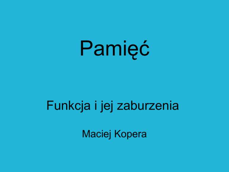 Pamięć Funkcja i jej zaburzenia Maciej Kopera Definicja Czynność poznawcza umożliwiająca chwilowe lub trwałe zachowanie (zapamiętywanie), przechowywanie (magazynowanie), odtwarzanie (przypominanie) informacji. Klasyfikacja pamięci W zależności od czasu przechowywania Ultrakrótka (sensoryczna) – przechowywanie 0,5 - 1 sekundy, specyficzna dla modalności, większa pojemność niż pamięci krótkotrwałej, raczej informacje o fizycznych parametrach bodźców Krótkotrwała (operacyjna, robocza) – przechowywanie kilka do kilkunastu sekund, możliwe wydłużenie dzięki powtórkom wewnętrznym, pojemność do 7+/-2 elementy, kod głównie akustyczny i wzrokowy. Trwała – czas przechowywania praktycznie nieograniczony, uzupełniana, modyfikowana, pojemność praktycznie nieograniczona, kod głównie semantyczny. Klasyfikacja pamięci Ze względu na formy przechowywania i mechanizmy wydobycia Deklaratywna - informacje dostępne świadomości, możliwe do zwerbalizowania, większy udział struktur korowych. Niedeklaratywna - pamięć ukryta, nieuświadamiana, zawiera wzorce umiejętności percepcyjnych (proceduralna), uczestniczy w procesach torowania, warunkowania, habituacji. Gromadzona prawdopodobnie od urodzenia z większym udziałem struktur podkorowych. Klasyfikacja pamięci Ze względu na format przechowywanych informacji Semantyczna (wiem) - Idee, pojęcia jako wynik rozumienia faktów i zjawisk, organizacja pojęciowa, odniesienie do świata, składająca się na wykształcenie ogólne. Epizodyczna (pamiętam) - zdarzenia, epizody, których źródłem są czyste doznania zmysłowe, organizacja czasowa, odniesienie do Ja, niewielkie znaczenie dla systemu wiedzy ogólnej. Zaburzenia pamięci 1. Ilościowe (dysmnezje) • • • • hipermnezja amnezja hipomnezja ekmnezja 2. Jakościowe (paramnezje) • • allomnezje (wspomnienia zniekształcone) pseudomnezje (wspomnienia rzekome) Ilościowe zaburzenia pamięci 1. hipermnezja - zdolność do odtwarzania zwiększonej ilości wspomnień – substancje halucynogenne, w stanach zmienionej świadomości, silne przeżycia, zespół hipomaniakalny. 2. amnezja – dysfunkcja polegająca na niemożności przypomnienia sobie informacji. Podział ze względu na: • stopień – całkowita i fragmentaryczna • zakres – pełna (wszelkie wspomnienia), cząstkowa (składnik pamięci – zapamiętywanie…; typ informacji – autobiograficzna, semantyczna, proceduralna; modalność) • trwałość – trwała i przemijająca • faza – krótkotrwała, długotrwała • czasowy związek z utratą przytomności – wsteczna, następcza, pomiędzy nimi czasem wyróżnia się śródczesną. Ilościowe zaburzenia pamięci 1. hipomnezja – zmniejszona zdolność do odtwarzania wspomnień • Czynnościowa - może dochodzić do przejściowych zaburzeń jak w depresji, zaburzeniach lękowych, reaktywnych czy dysocjacyjnych • Trwała – proces otępienny 2. ekmnezja – przeżywanie przeszłości jako teraźniejszości – występuje w zespołach amnestycznych. Jakościowe zaburzenia pamięci Allomnezja - nieadekwatnie odtwarzana jest rzeczywista treść wspomnienia • Iluzje pamięci – wspomnienia rzeczywiste, lecz zniekształcone pod wpływem innych przeżyć, zwykle silnych emocji (fizjologicznych i chorobowych). • kryptomnezje – nieświadomy plagiat, wspomnienie odtworzone bez świadomości, że jest to coś, co już ktoś wie, co stanowi jego wspomnienie – przypominanie bez rozpoznawania • złudy utożsamiające – deja vu i zjawiska pokrewne – rozpoznawanie bez przypominania Jakościowe zaburzenia pamięci Pseudomnezja - przywoływanie wspomnień w przekonaniu osoby rzeczywistych a faktycznie nie mających miejsca. • omamy pamięci – fałszywe wspomnienia z sądem realizującym. • konfabulacje – tworzenie fałszywych śladów pamięciowych współwystępujących zwykle z głębszymi zaburzeniami pamięci i wypełniających lukę pamięciową. Pacjent nie ma intencji wprowadzania w błąd. Niekiedy mają charakter prawdopodobny, innym razem zupełnie fantastyczny.